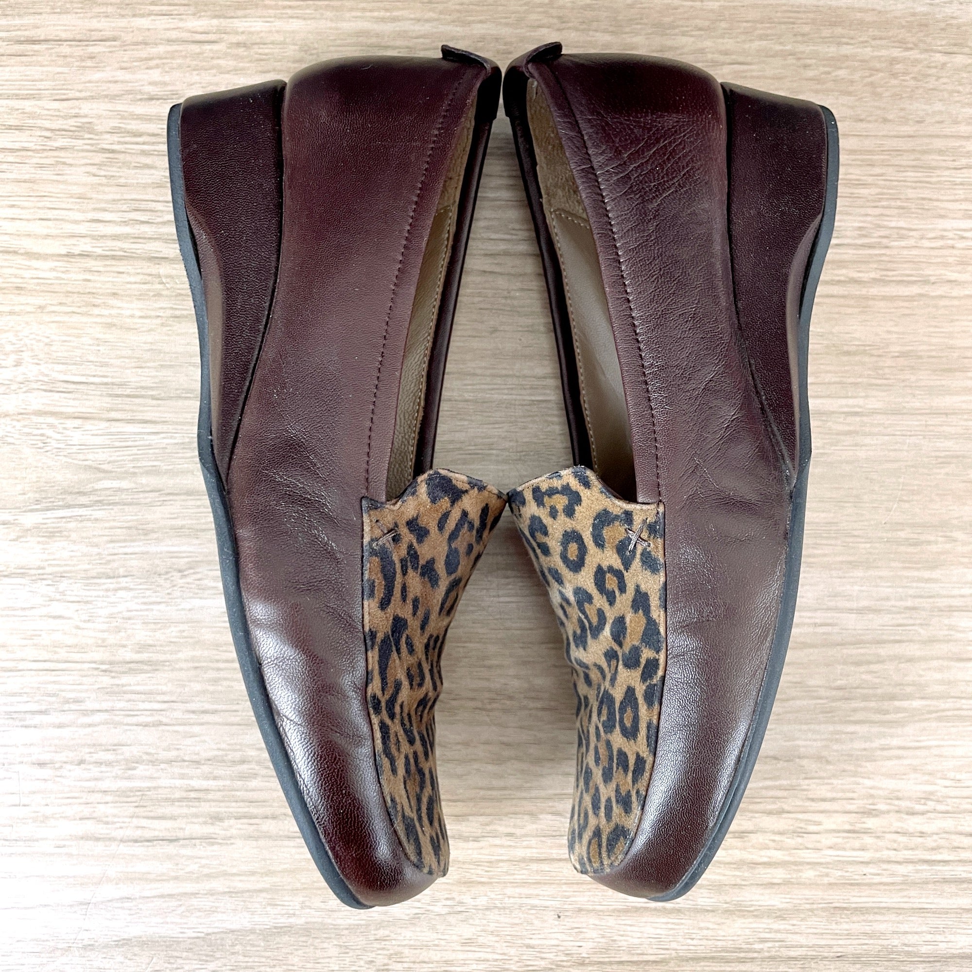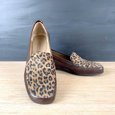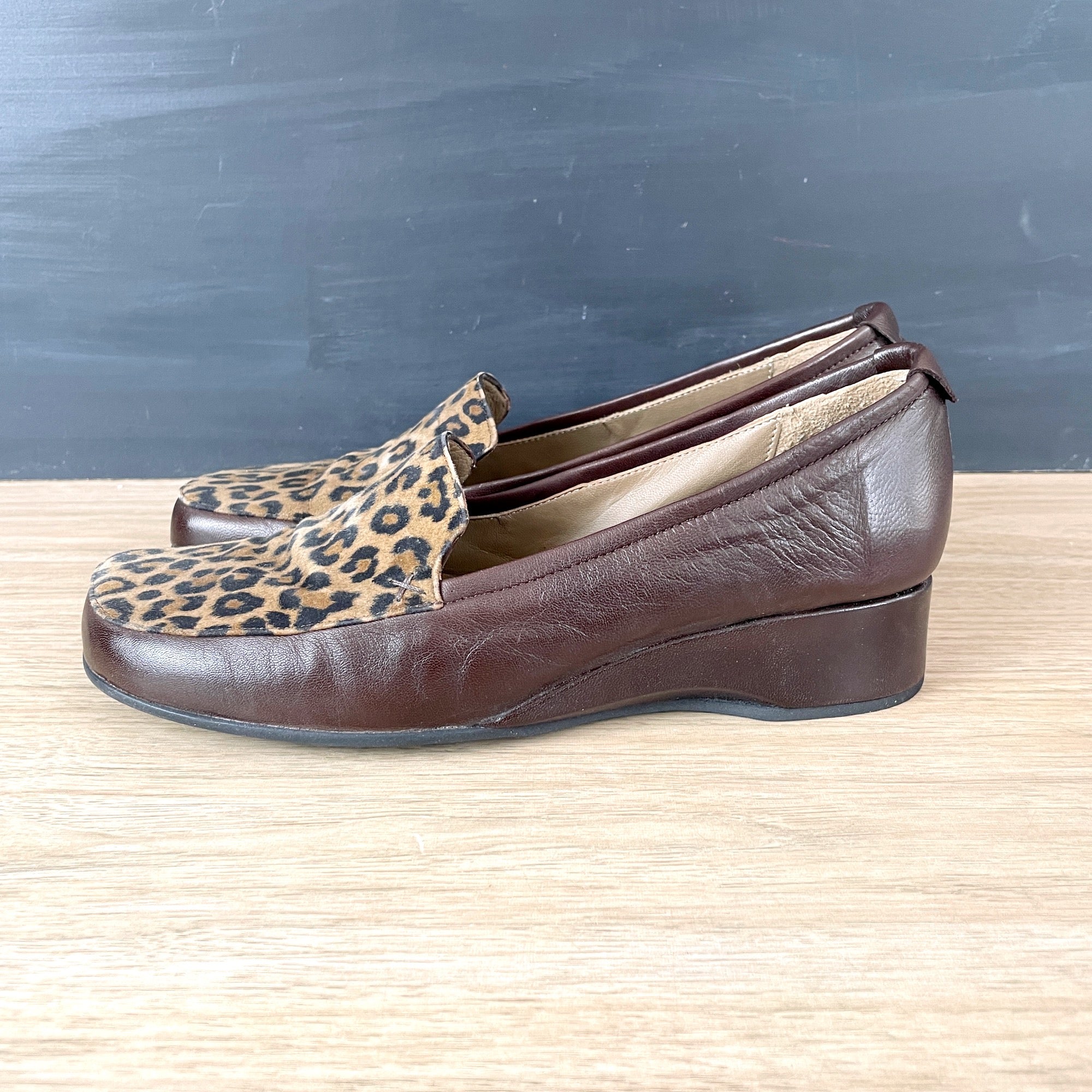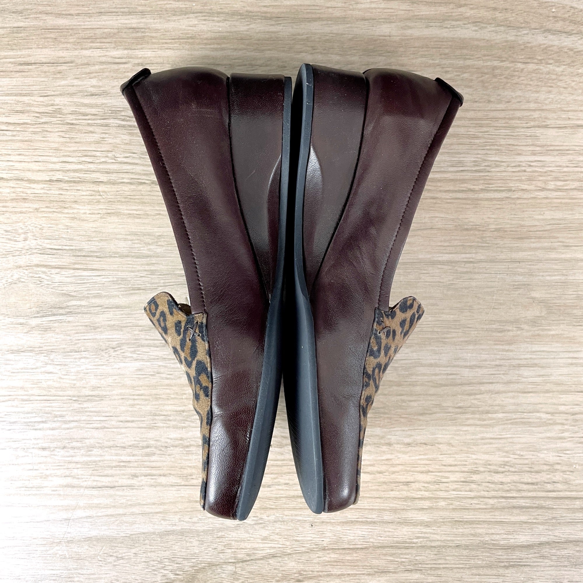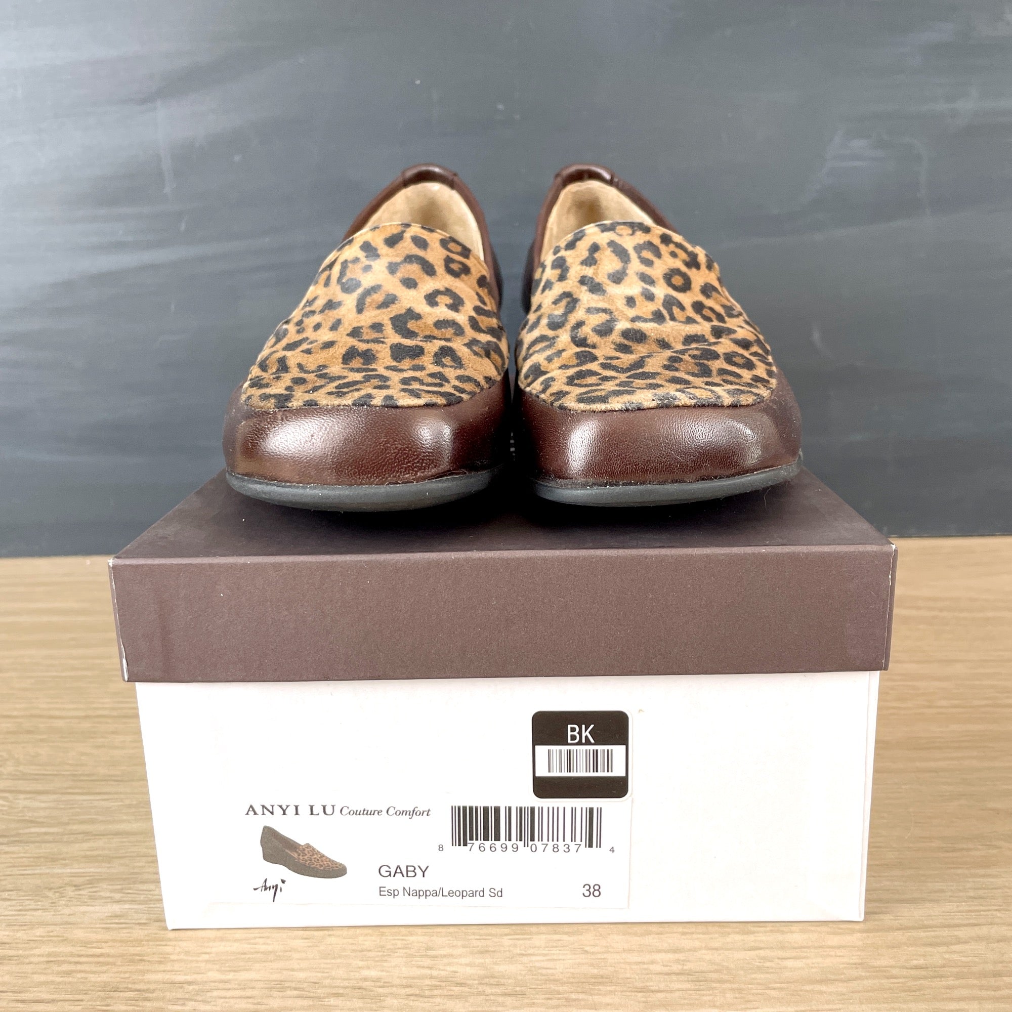 Gently worn Anyi Lu Gaby nappa leather and leopard calf hair wedge loafers. Couture comfort shoes with leather lining. 1.5" wedge heel. Made in Italy. Manmade sole. Retail $375. With dust bag. Quiet luxury designer shoes.