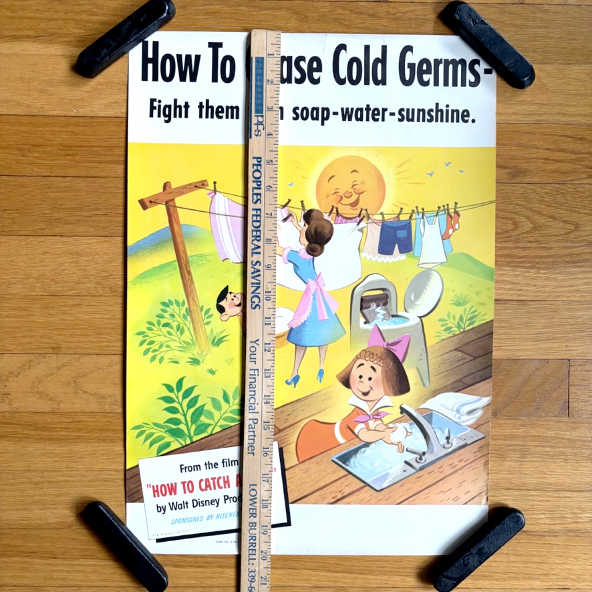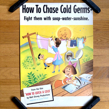 Original 1951 Disney educational poster from the short film How To Catch A Cold, sponsored by Kleenex Tissues. This particular poster is “How To Chase Cold Germs - Fight them with soap-water-sunshine”, one of six produced for the campaign. Featuring classic 1950s Disney animation artwork, it would be a fabulous piece of nostalgia framed and hung in your home.