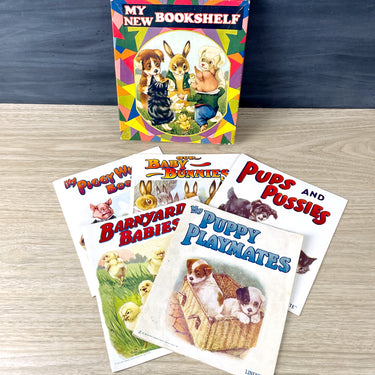 Five "Linenette" soft cover books in one box, "My New Bookshelf," published by Samuel Gabriel and Sons. Titles included: