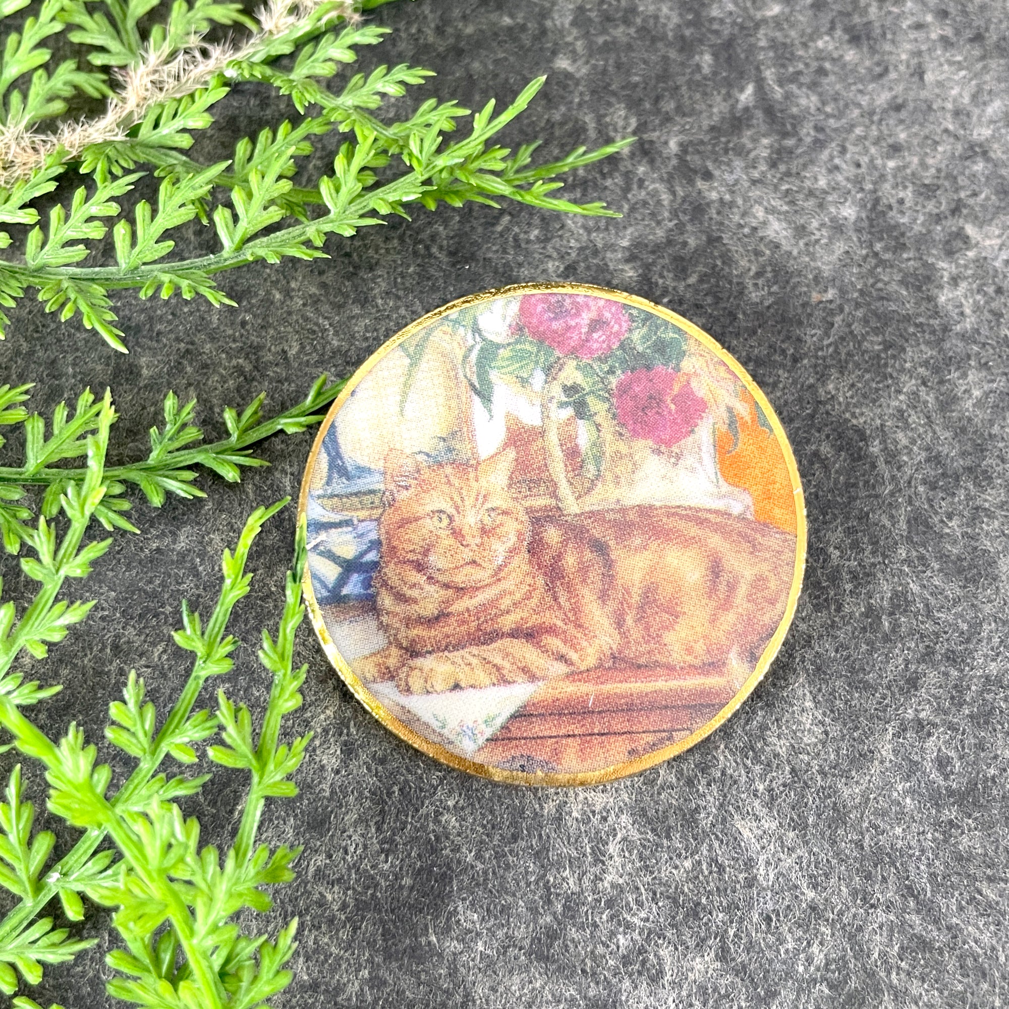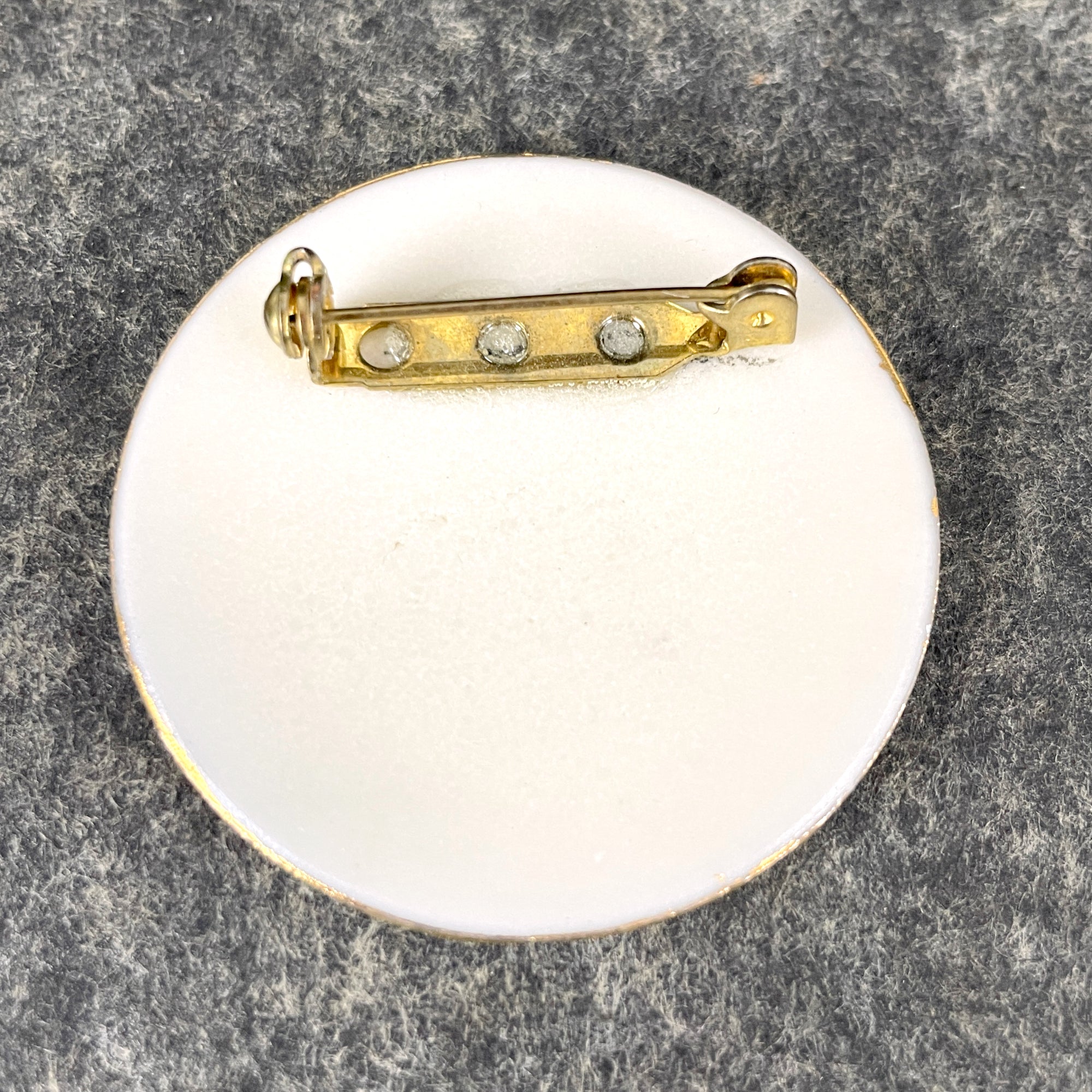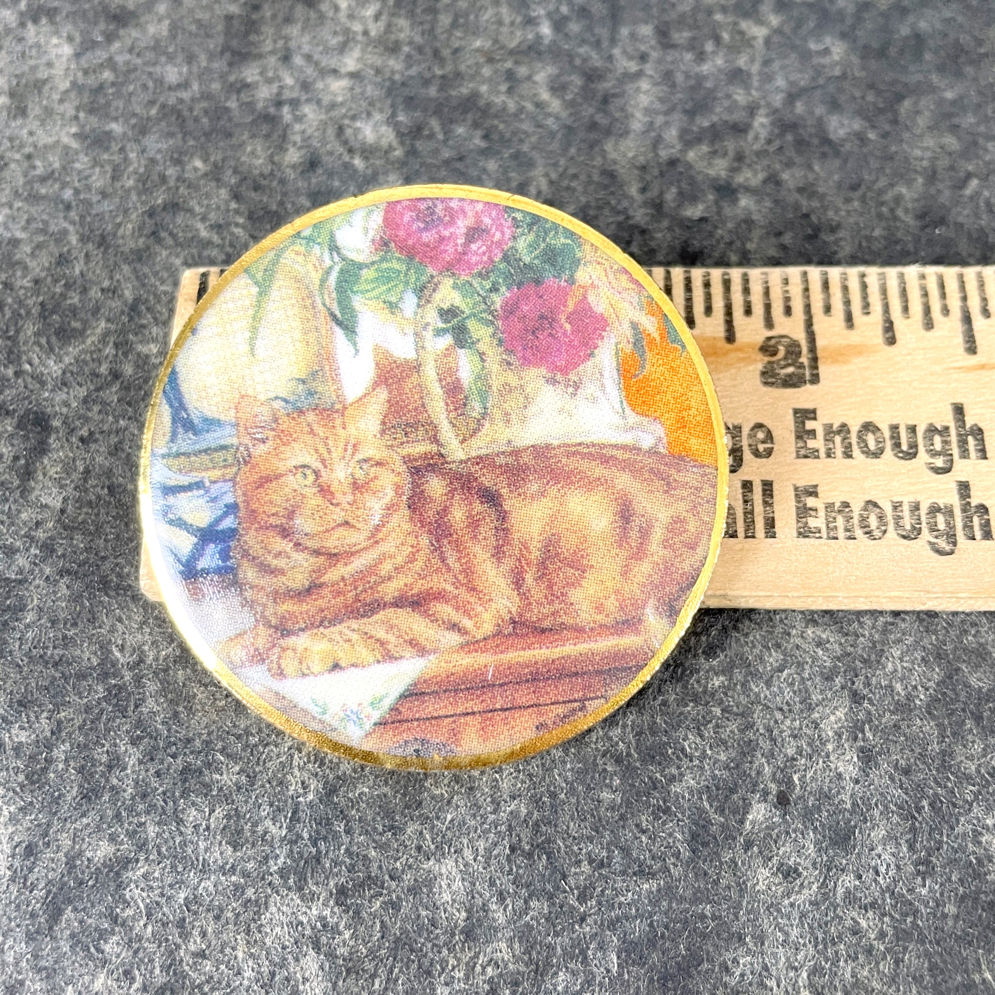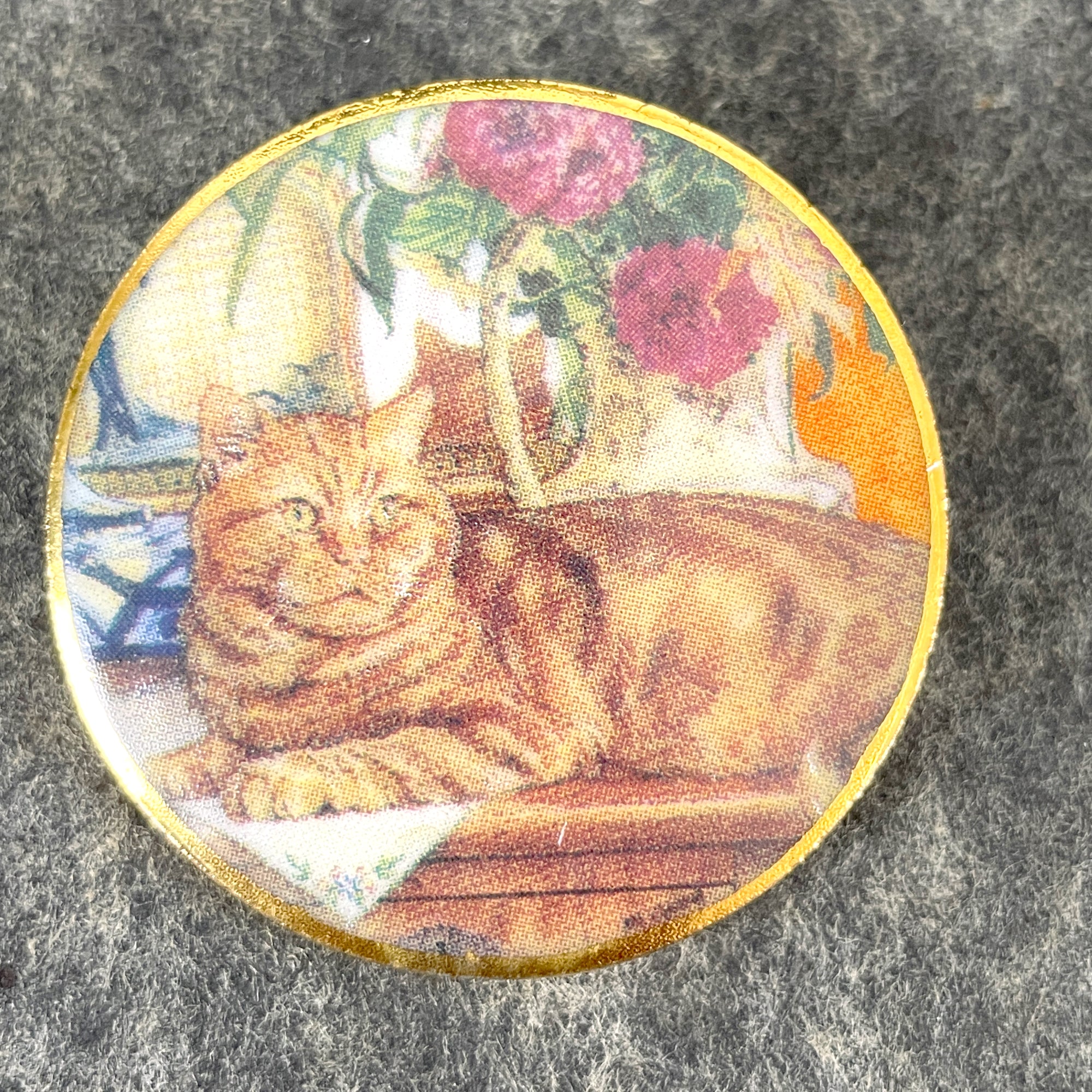 Round porcelain pin of a cat lounging with a gold accented outer rim. Signed M. Orme on lower right. Locking pin back. Perfect for your favorite cat lady or gentleman.