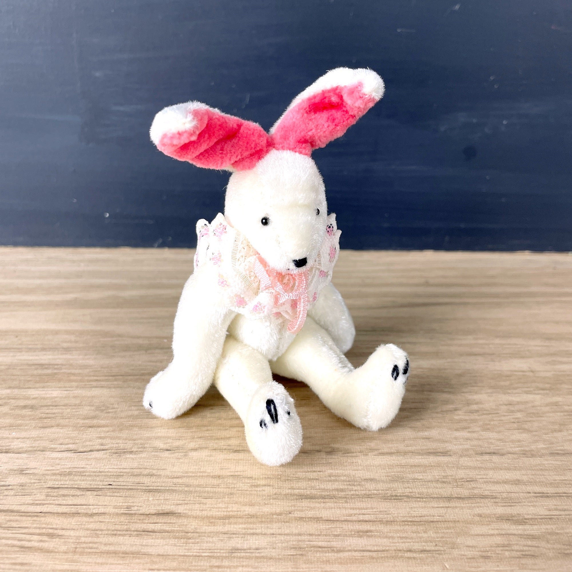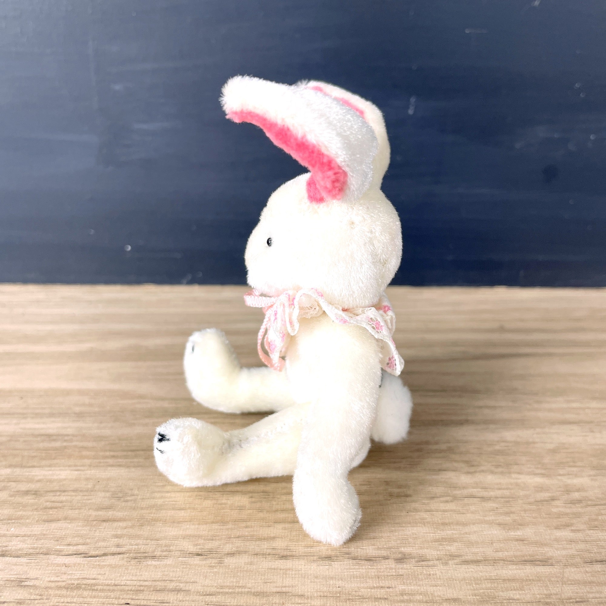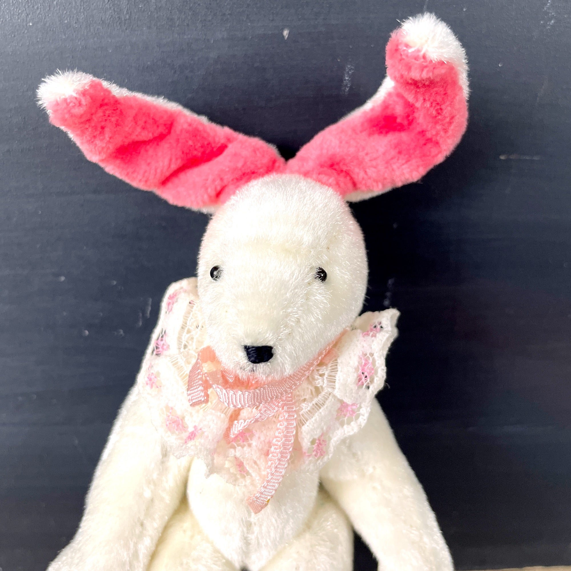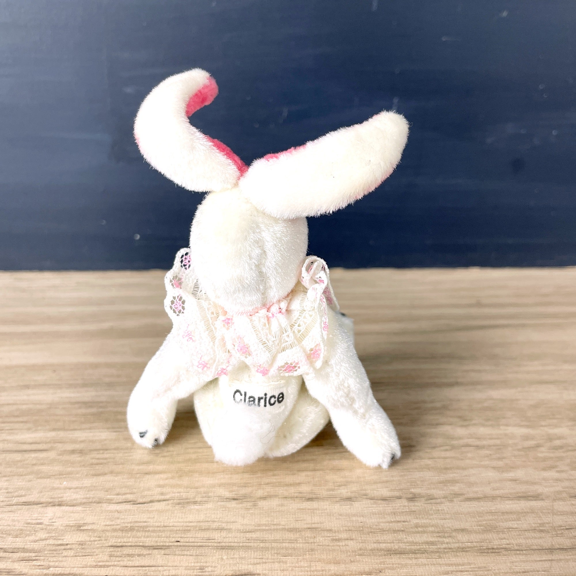 Small artist-made fully-jointed white rabbit with pink ears, a lace pink collar and a gold star sewn onto her chest and "Clarice" tag on her back. Part of artisan stuffed animal collection collected from the 1960-1990s. We think this one is likely from the 1980s.