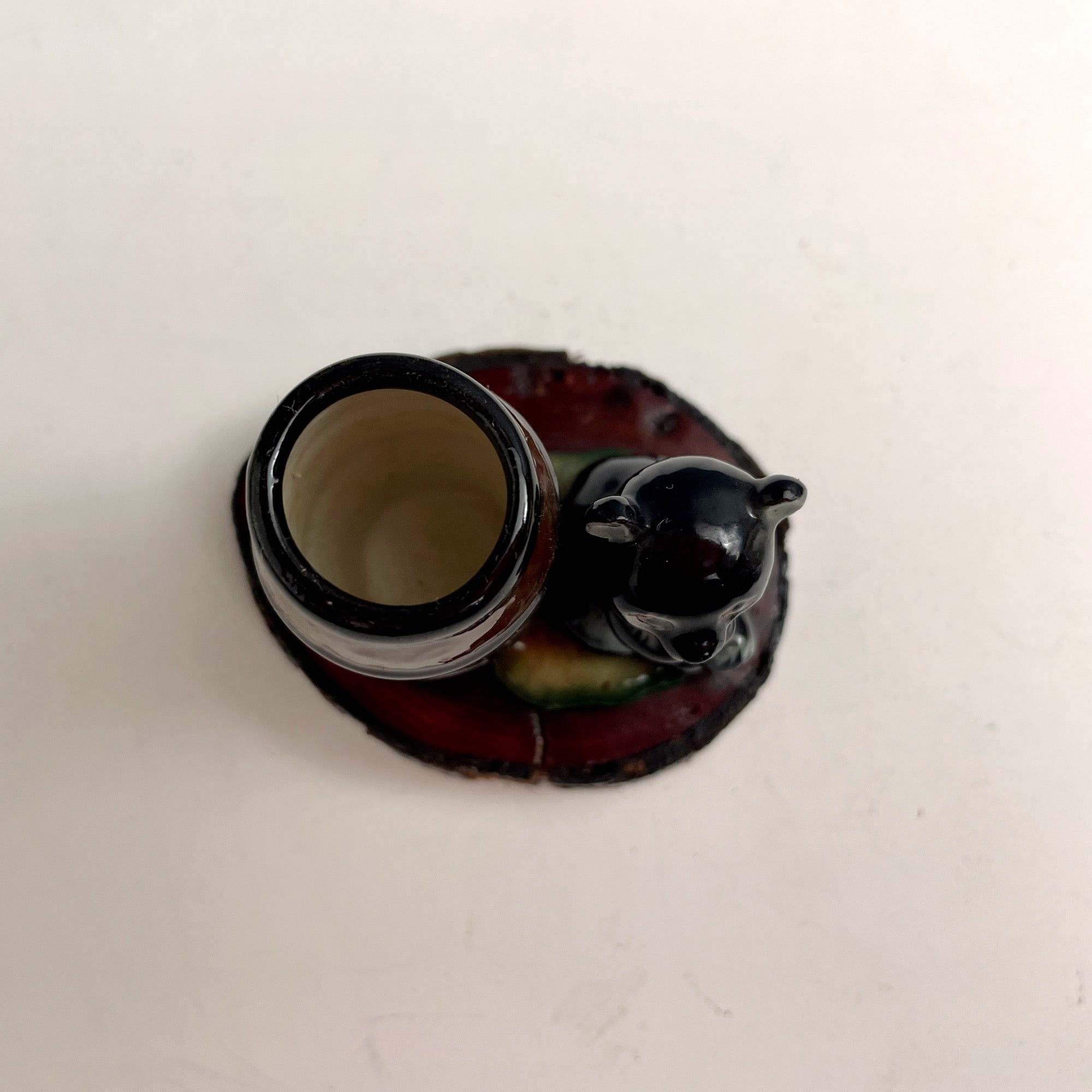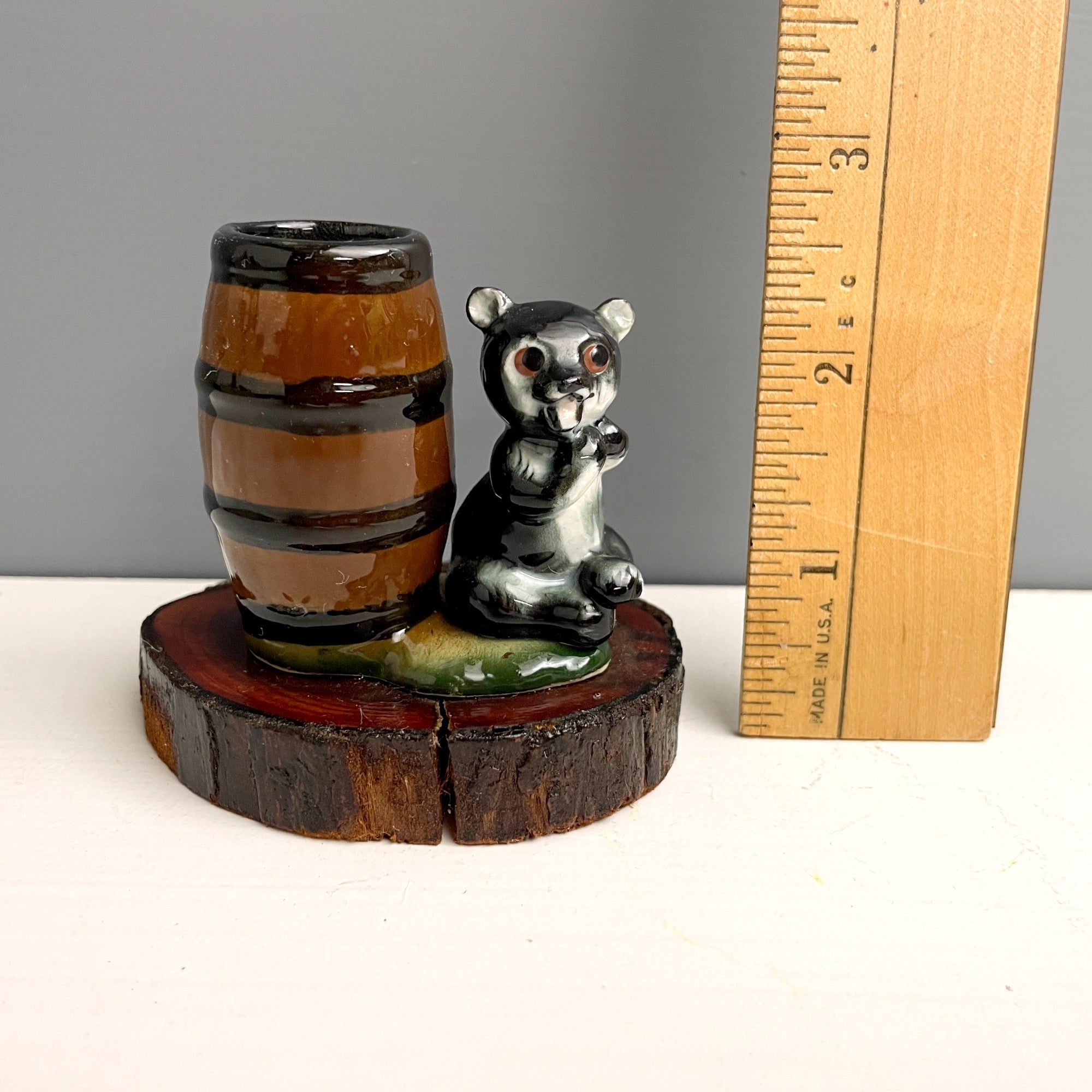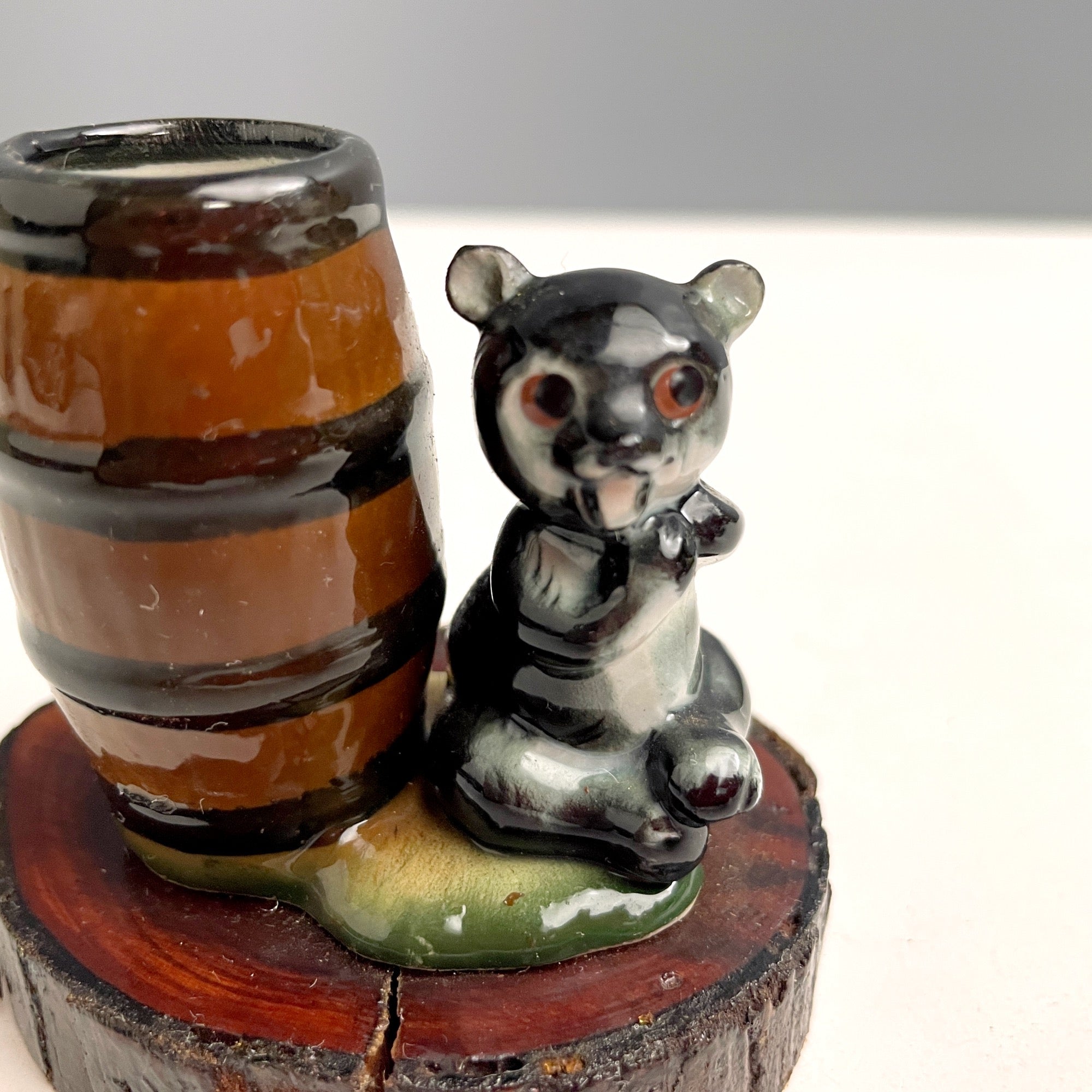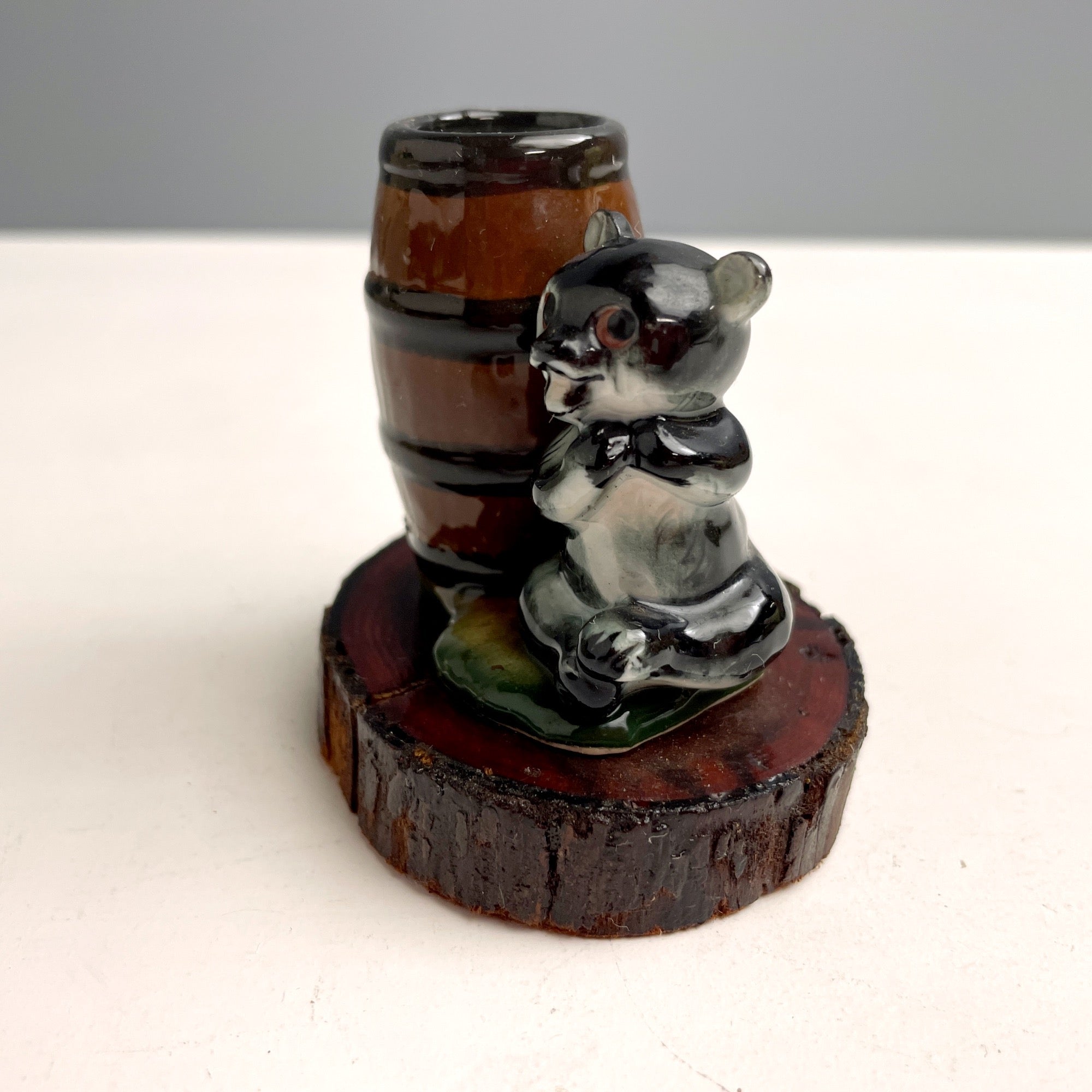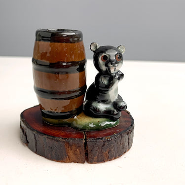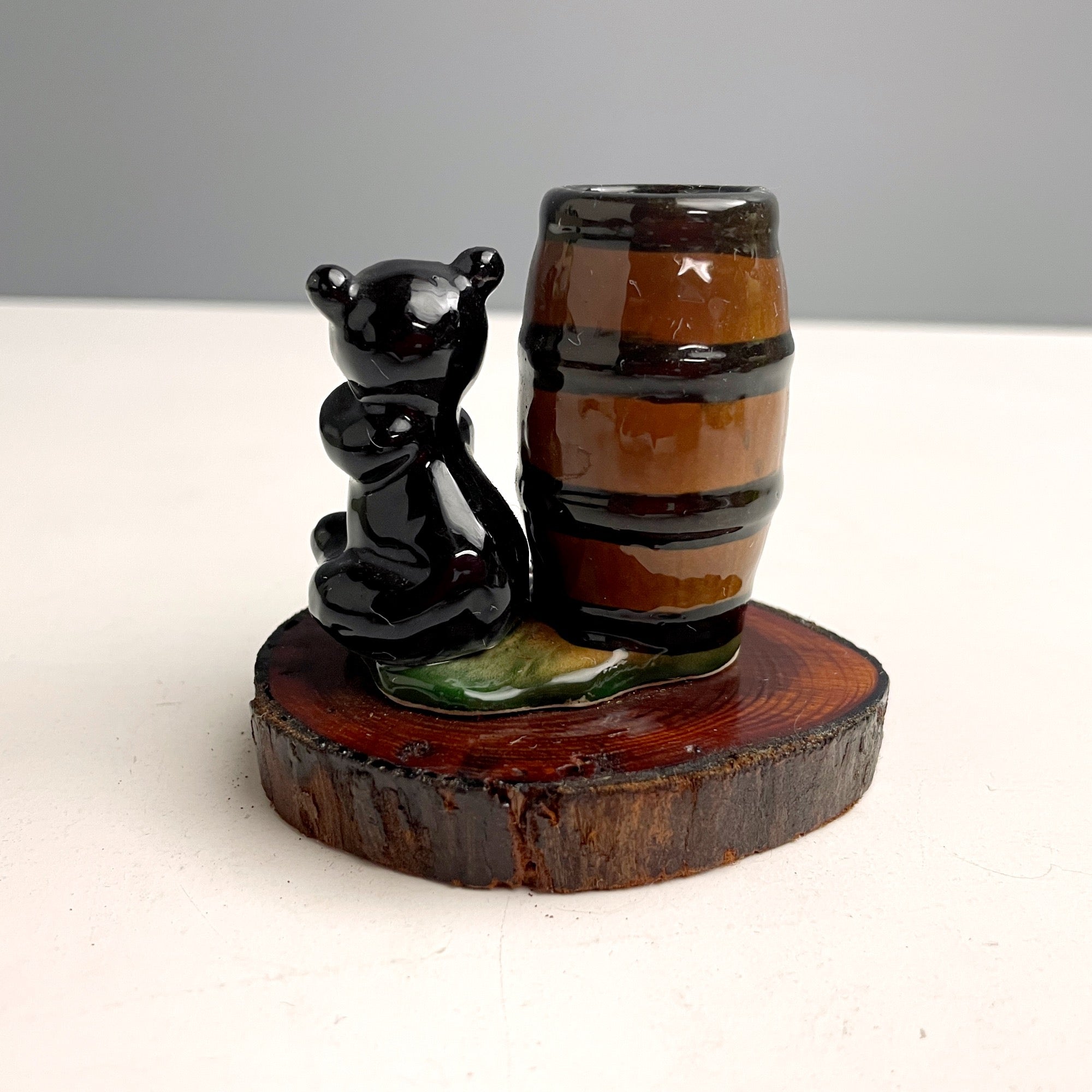 Vintage souvenir bear toothpick holder. Little ceramic bear sitting with a barrel to hold your toothpicks on a slice of wood. Made in Japan, it probably had a label on the bottom from the attraction where it was purchased back in the day.