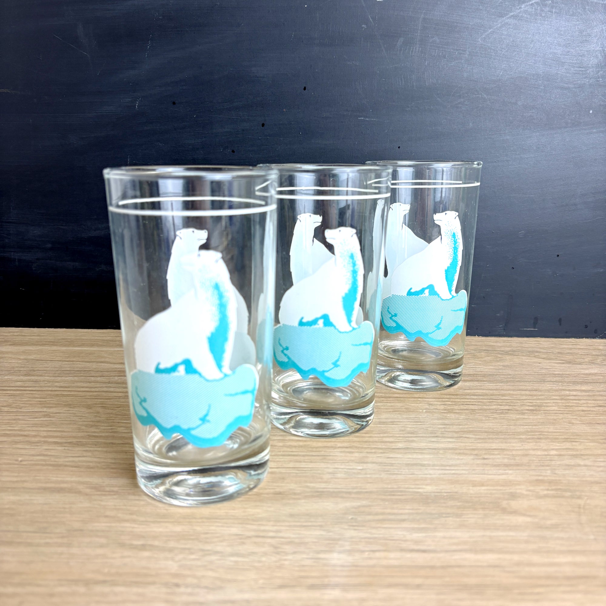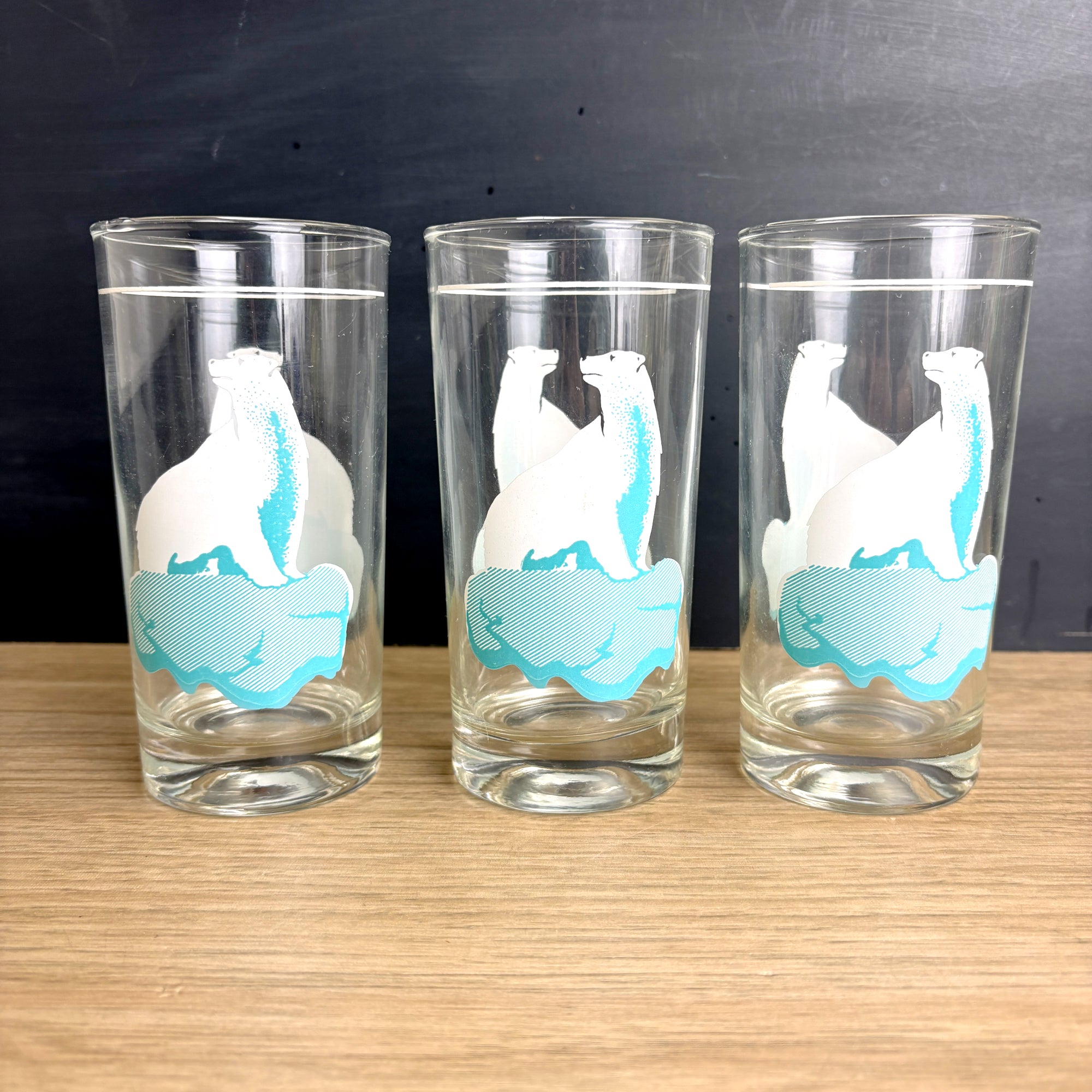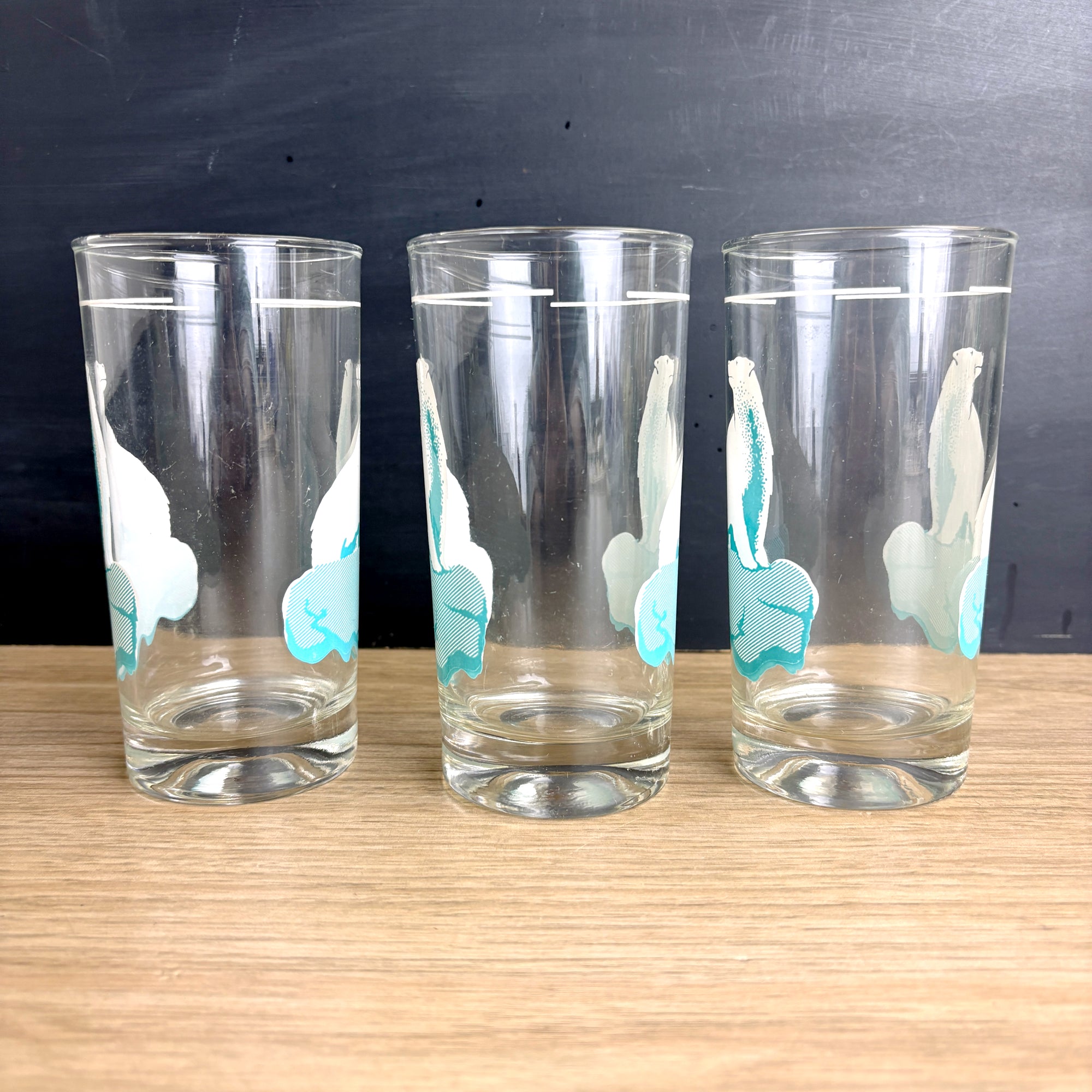 Set of 3 vintage mid-century tall tumblers printed front and back with a polar bear standing on an iceberg. Printed in white and teal, with a white stripe along the top. Here in Central Massachusetts, this looks similar to the Orson the Bear logo for Polar Beverages. Ideal for sipping your icy cold Polar Seltzer this summer.