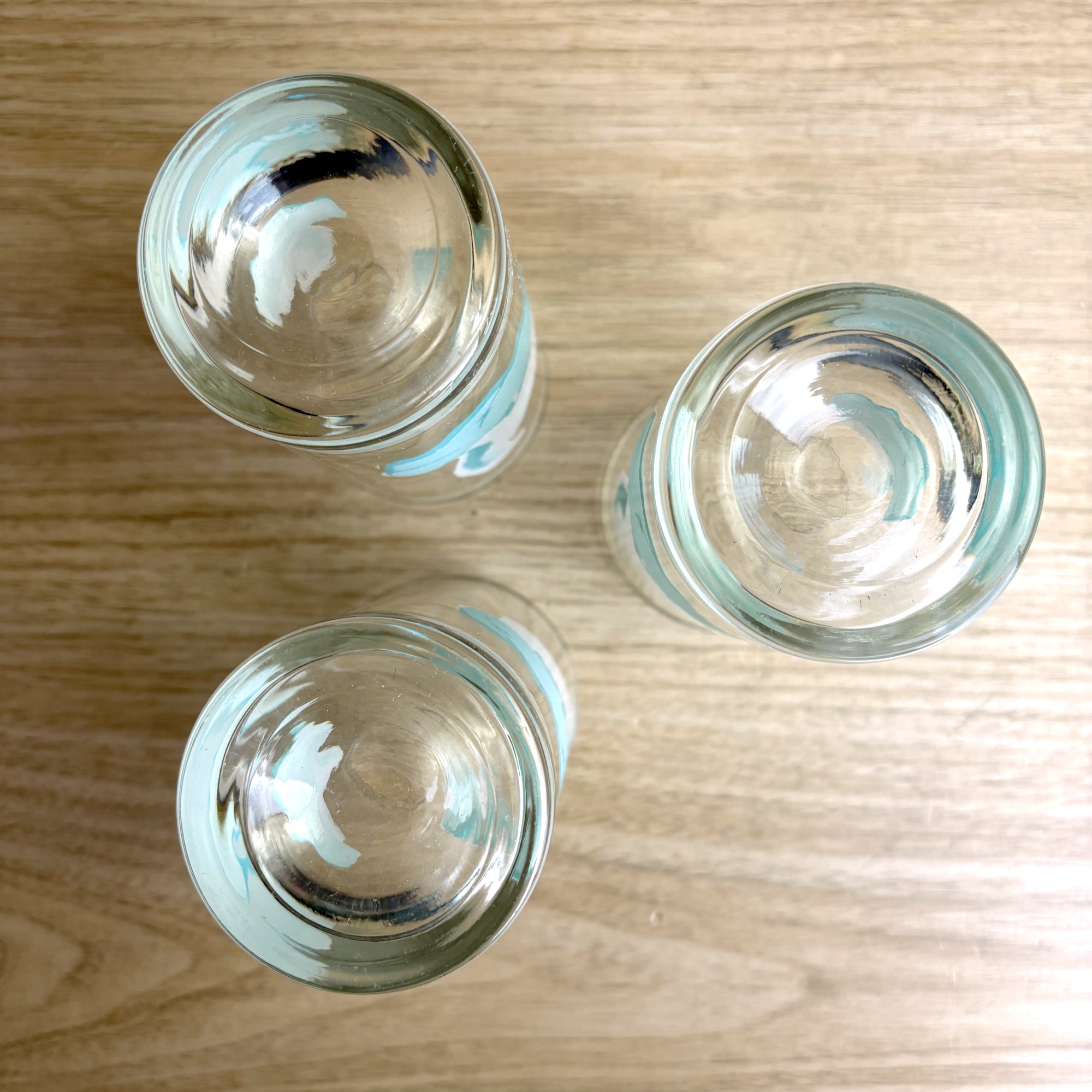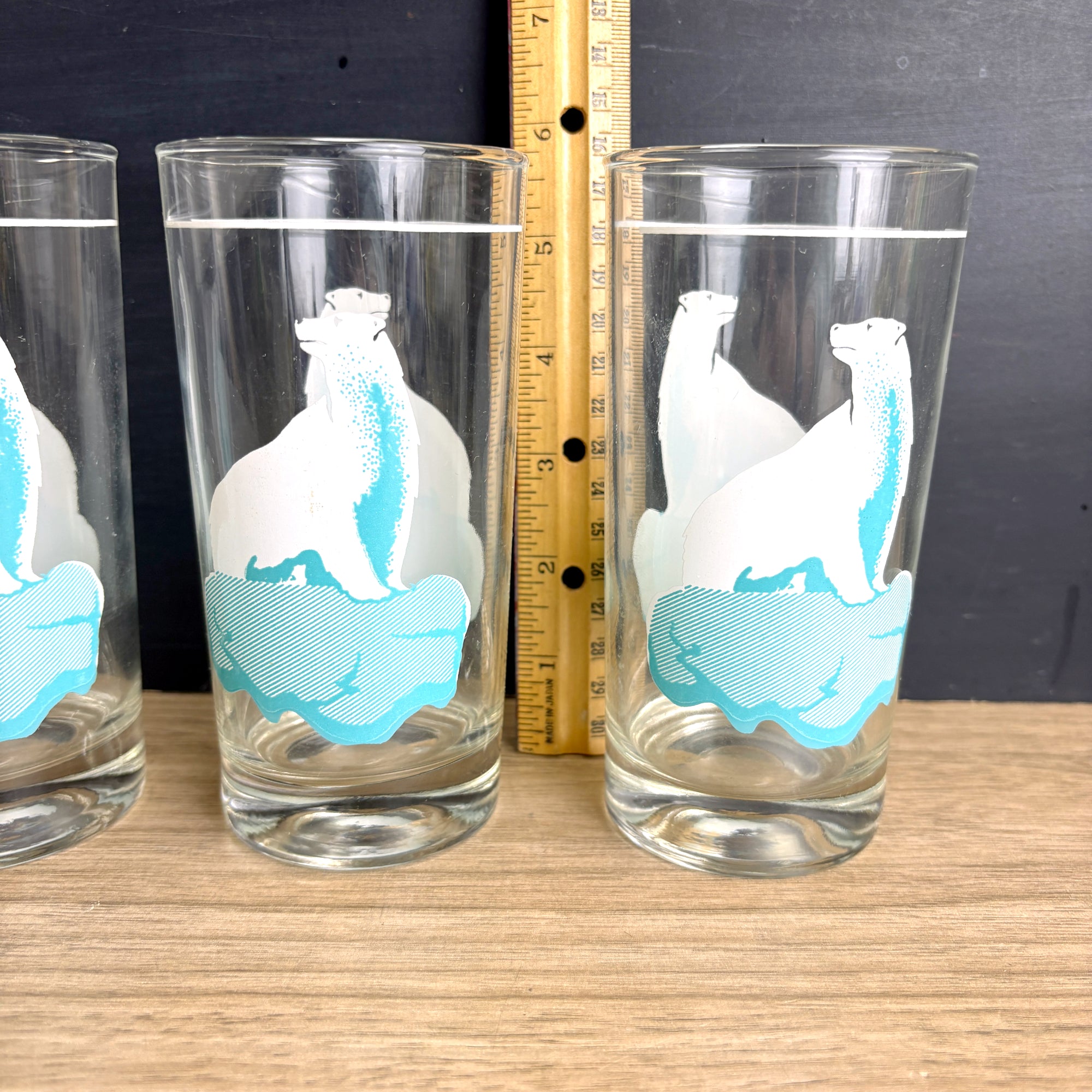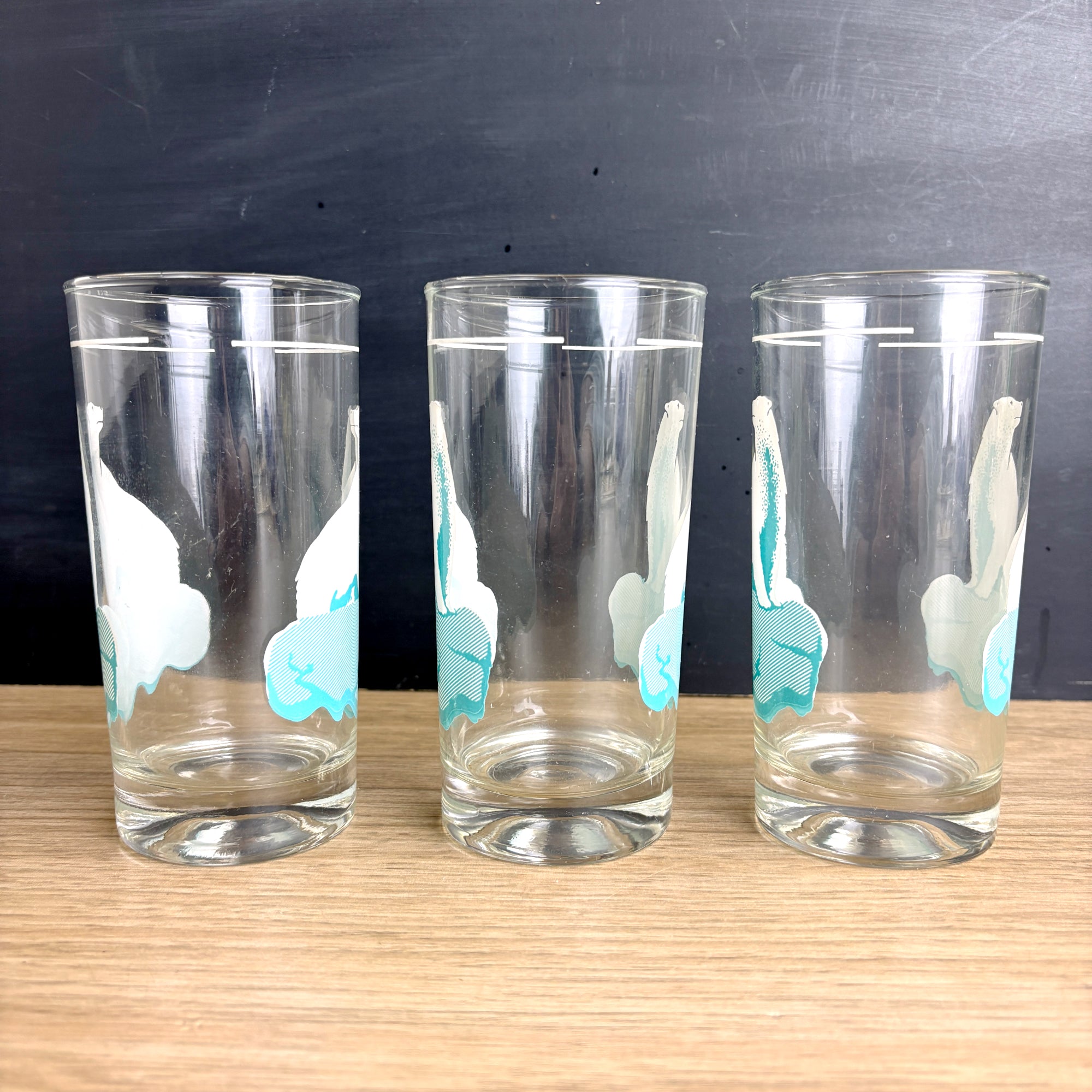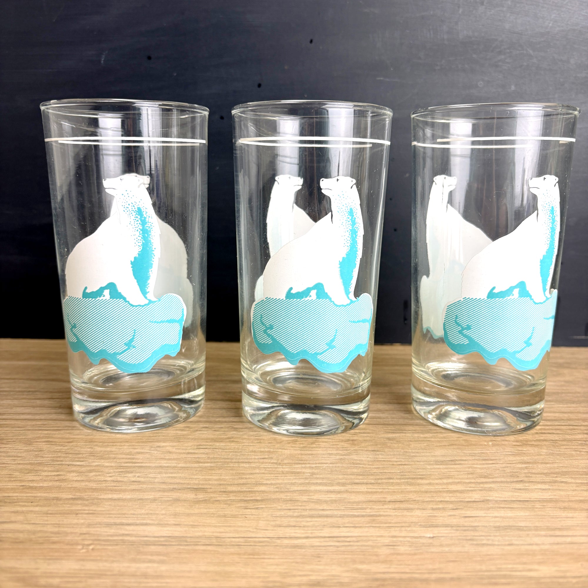 Set of 3 vintage mid-century tall tumblers printed front and back with a polar bear standing on an iceberg. Printed in white and teal, with a white stripe along the top. Here in Central Massachusetts, this looks similar to the Orson the Bear logo for Polar Beverages. Ideal for sipping your icy cold Polar Seltzer this summer.