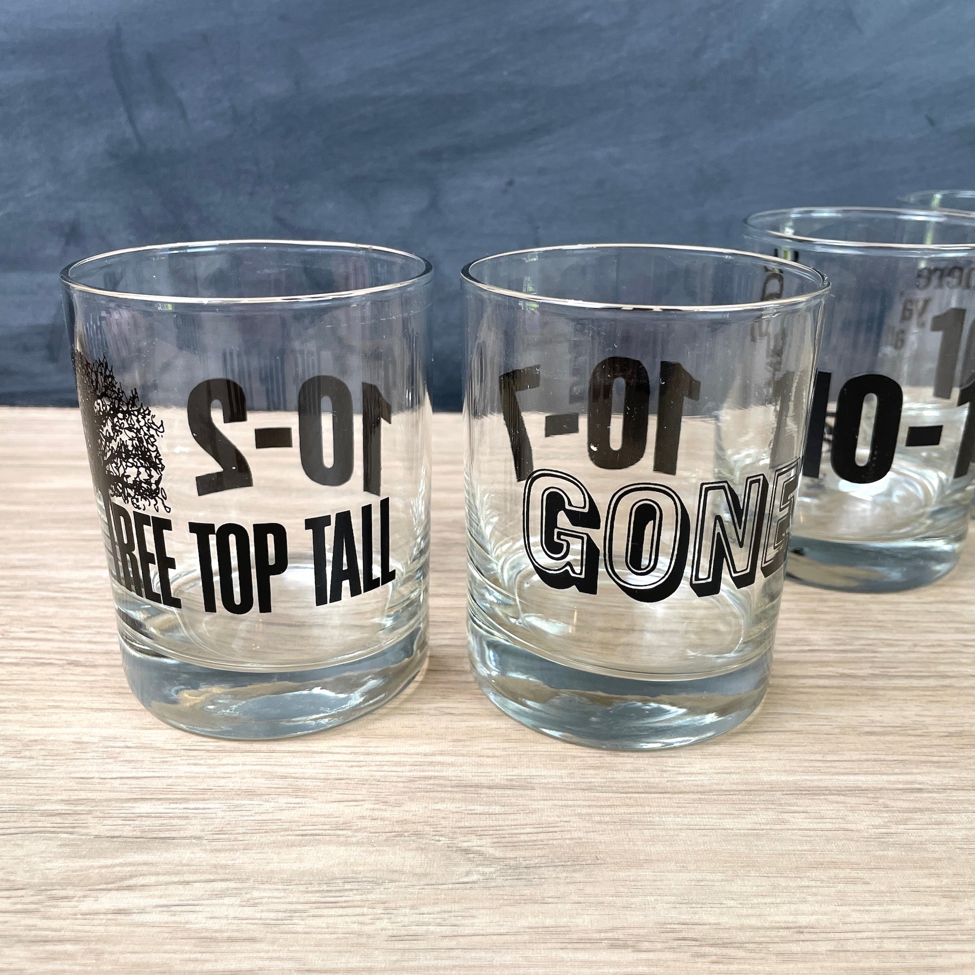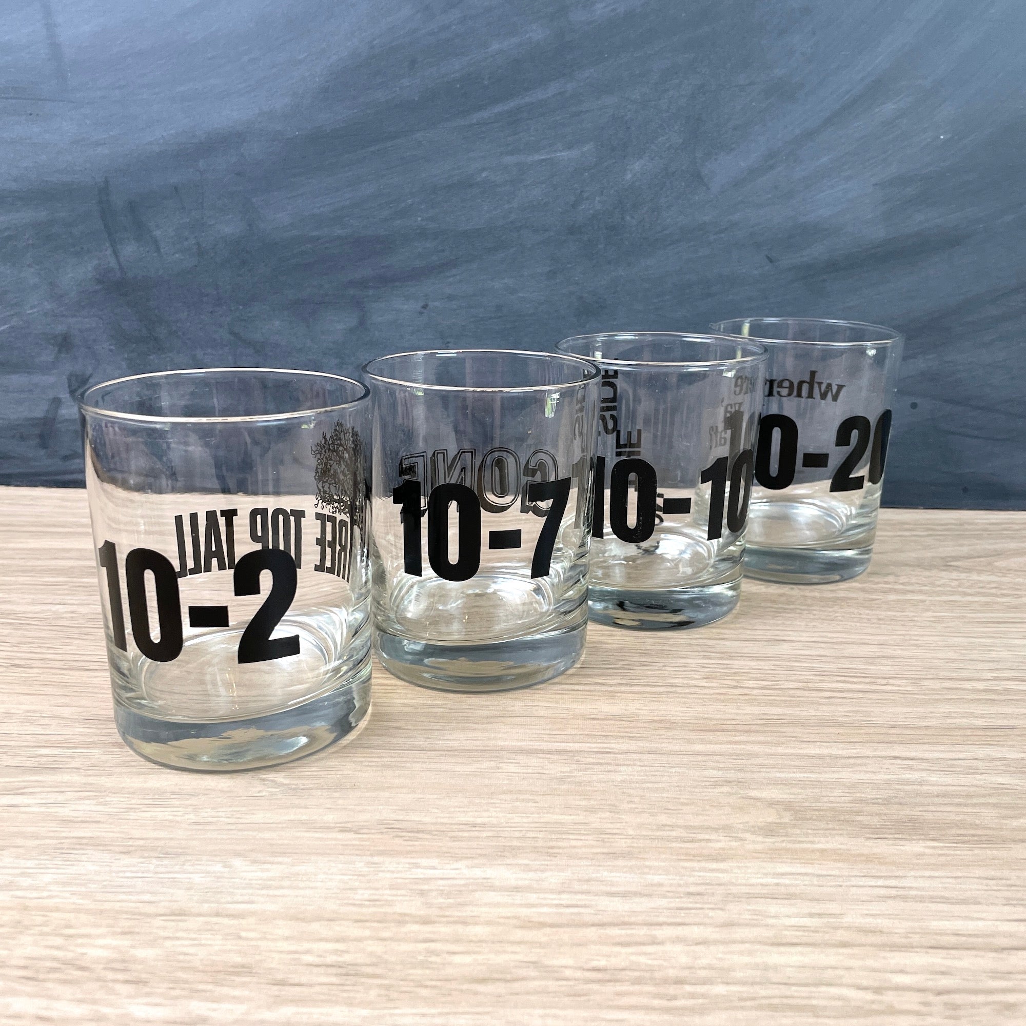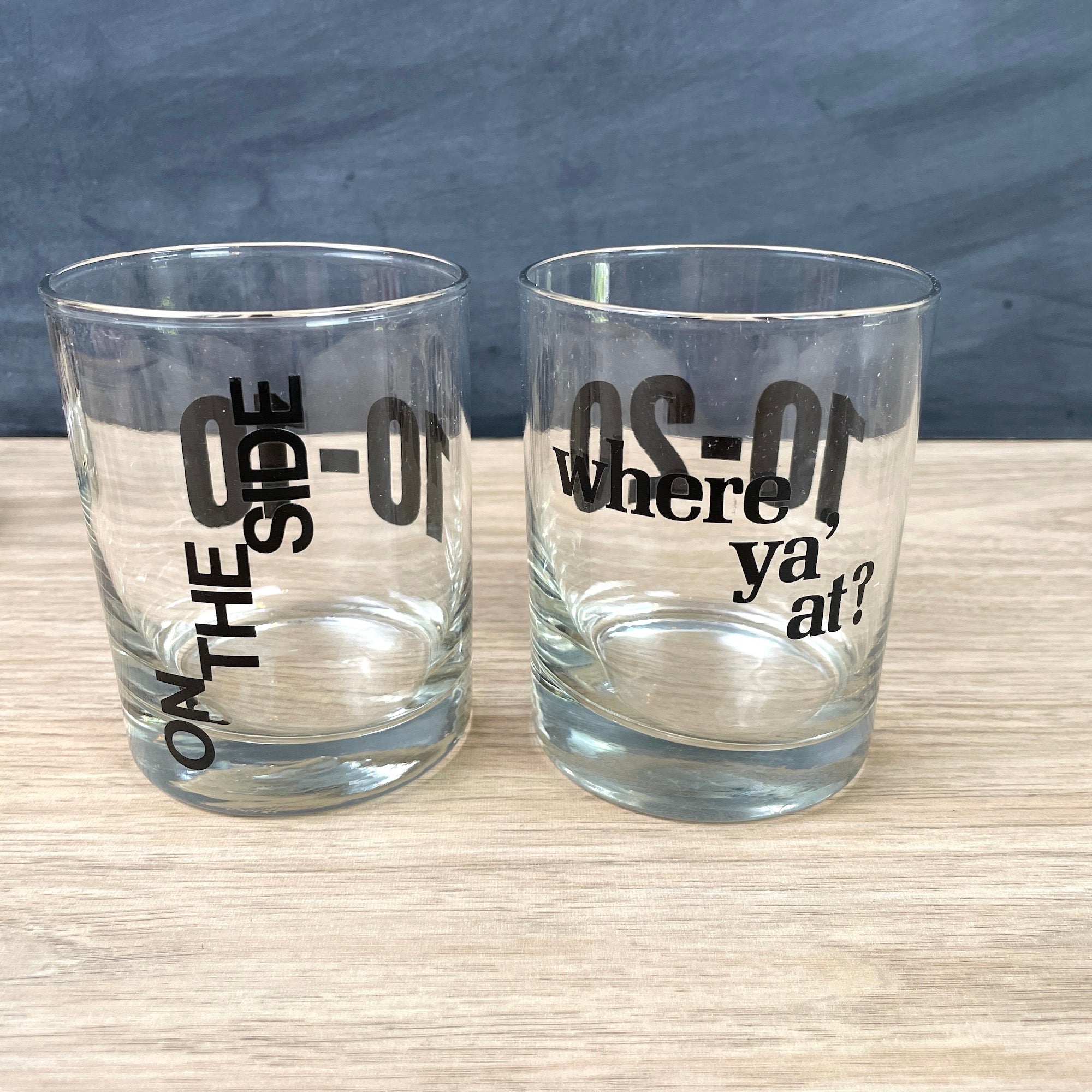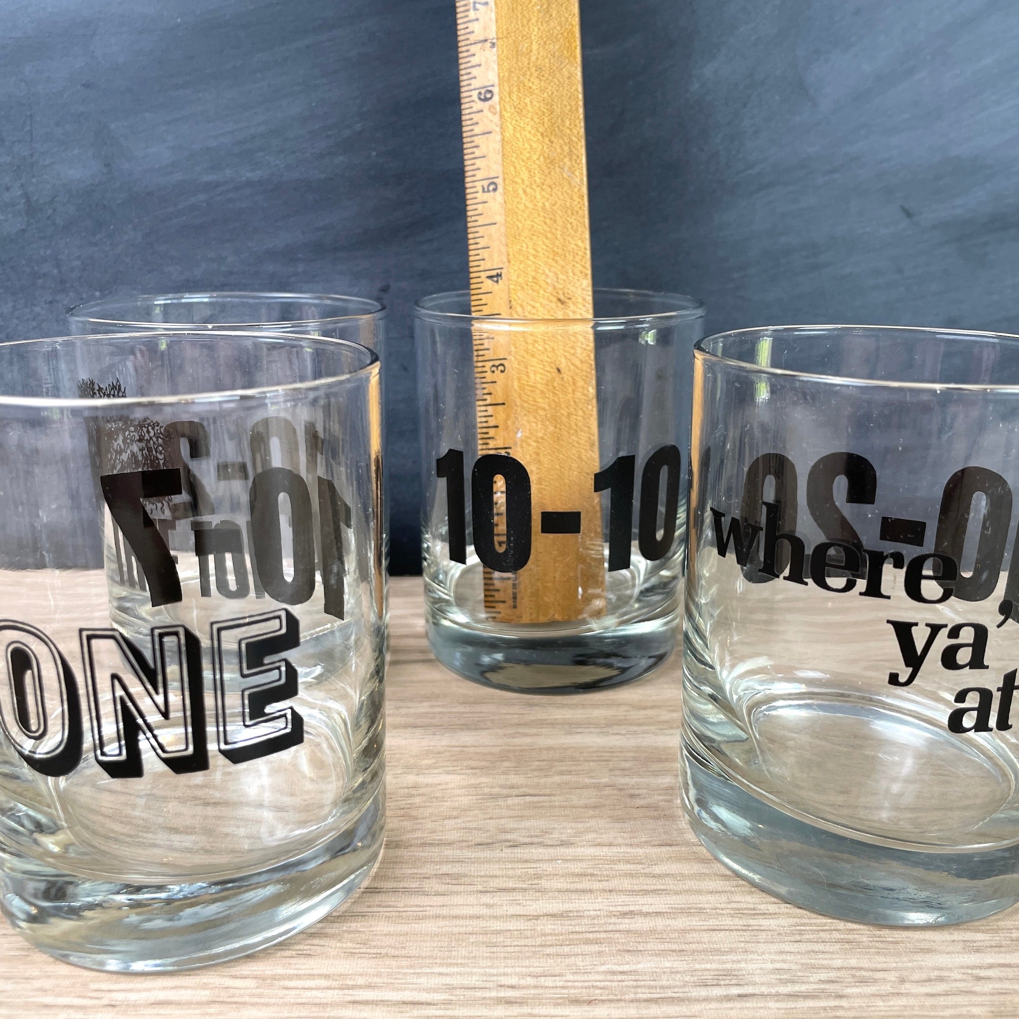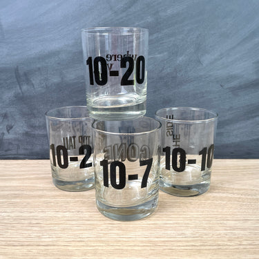 Four vintage 1970s rocks glasses with printed CB radio lingo. You got your 10-10, your 10-7, your tree top tall and more. Typography is very of the era, probably late 1970s. Heavy glass with nice heavy bases.