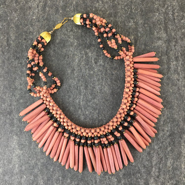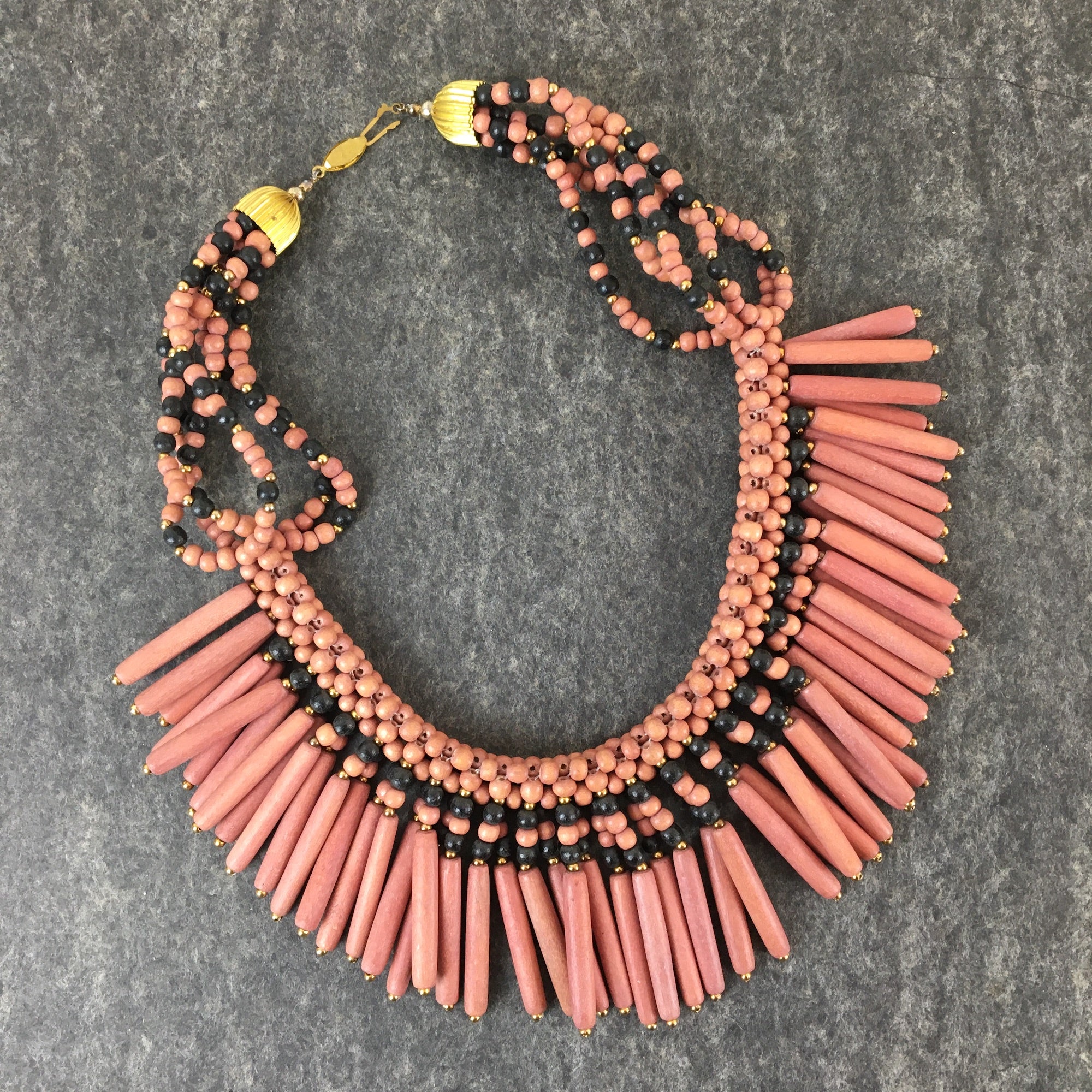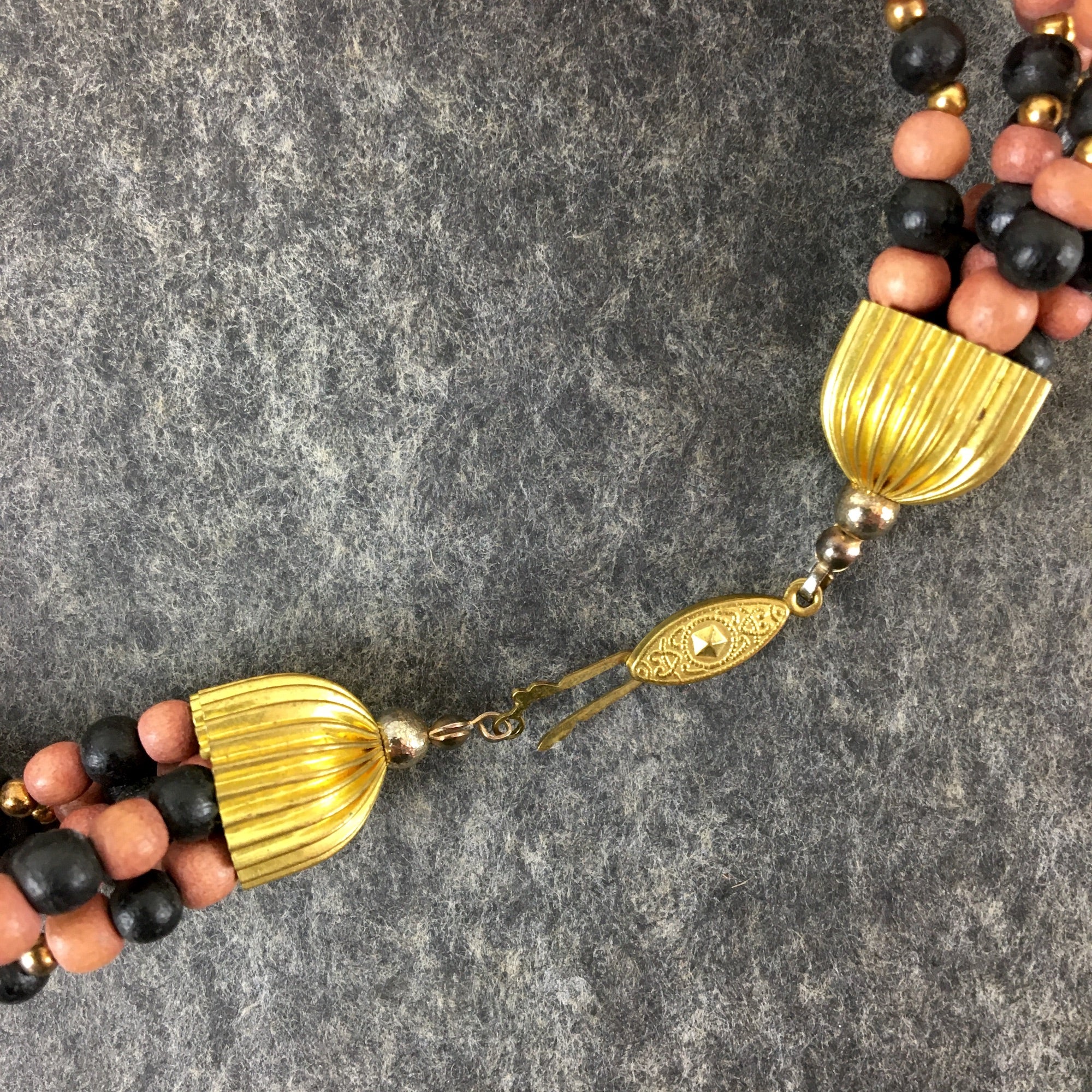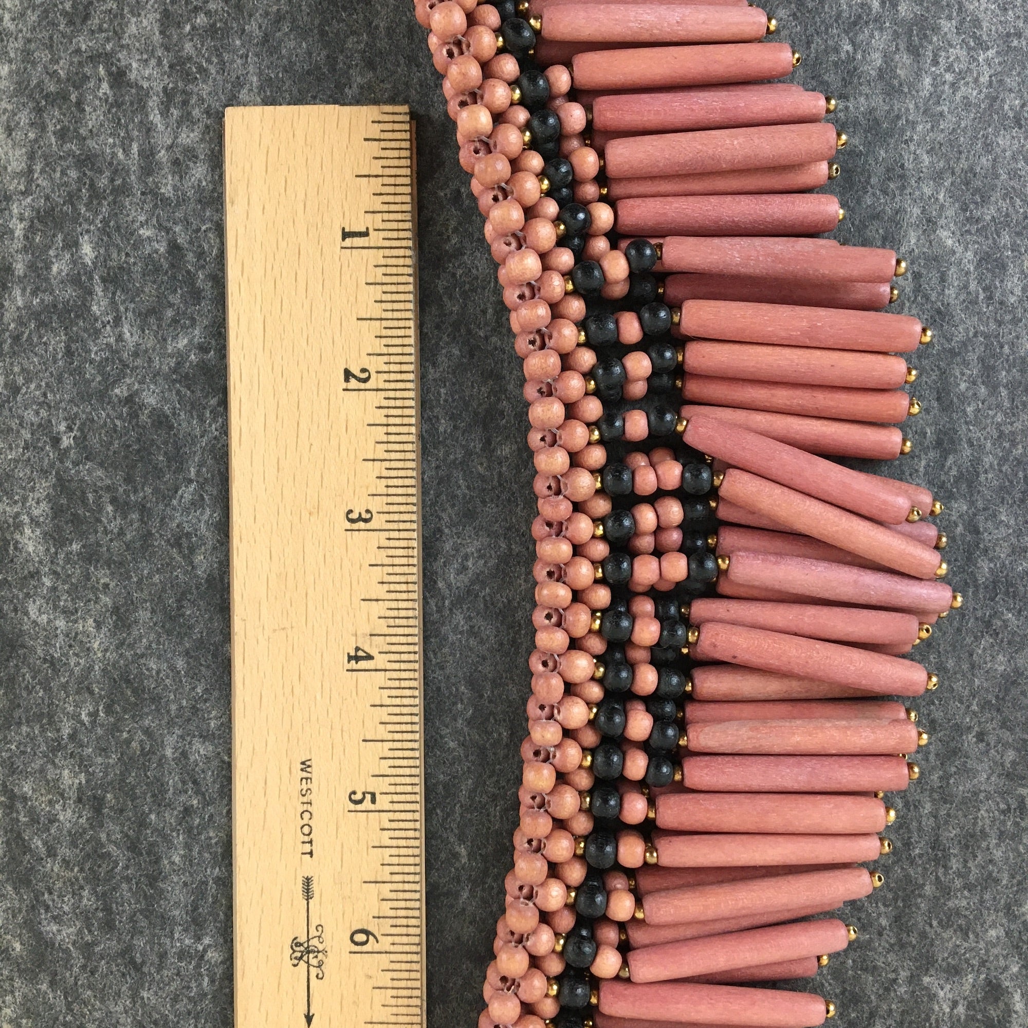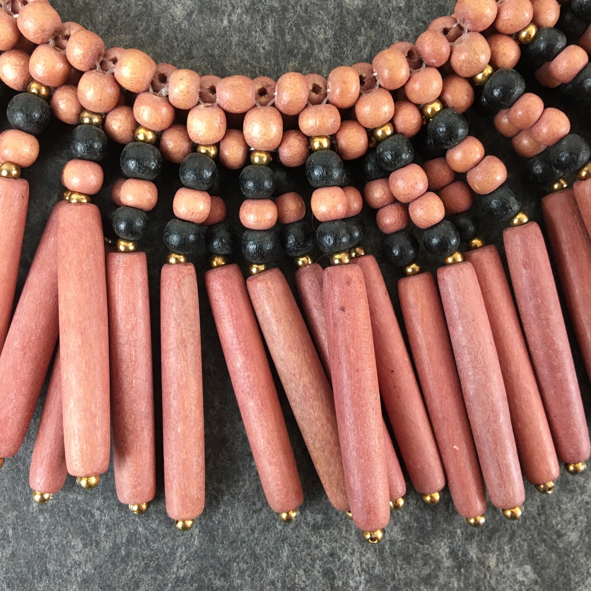 Statement necklace out of wooden rose and espresso beads with gold bead accents. Wide collar necklace has movement and is definitely an eye catcher. Gold findings and safety clasp.