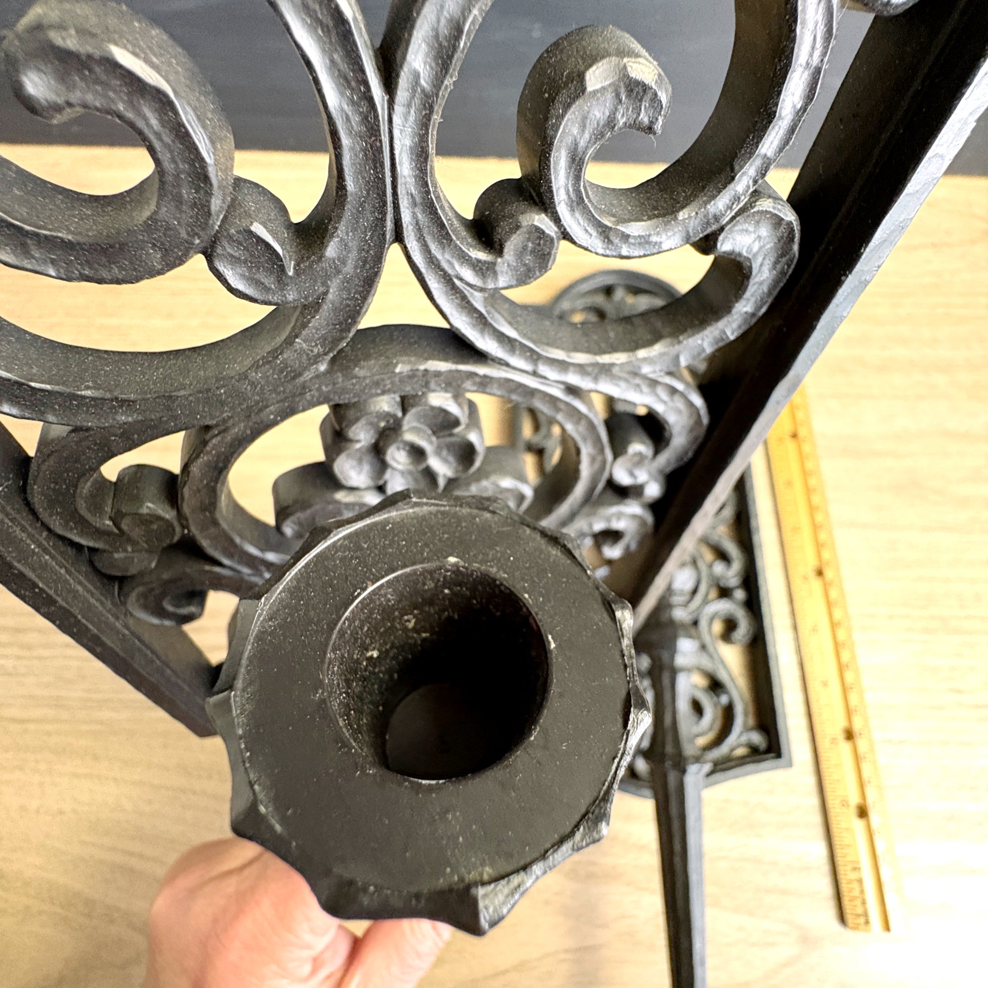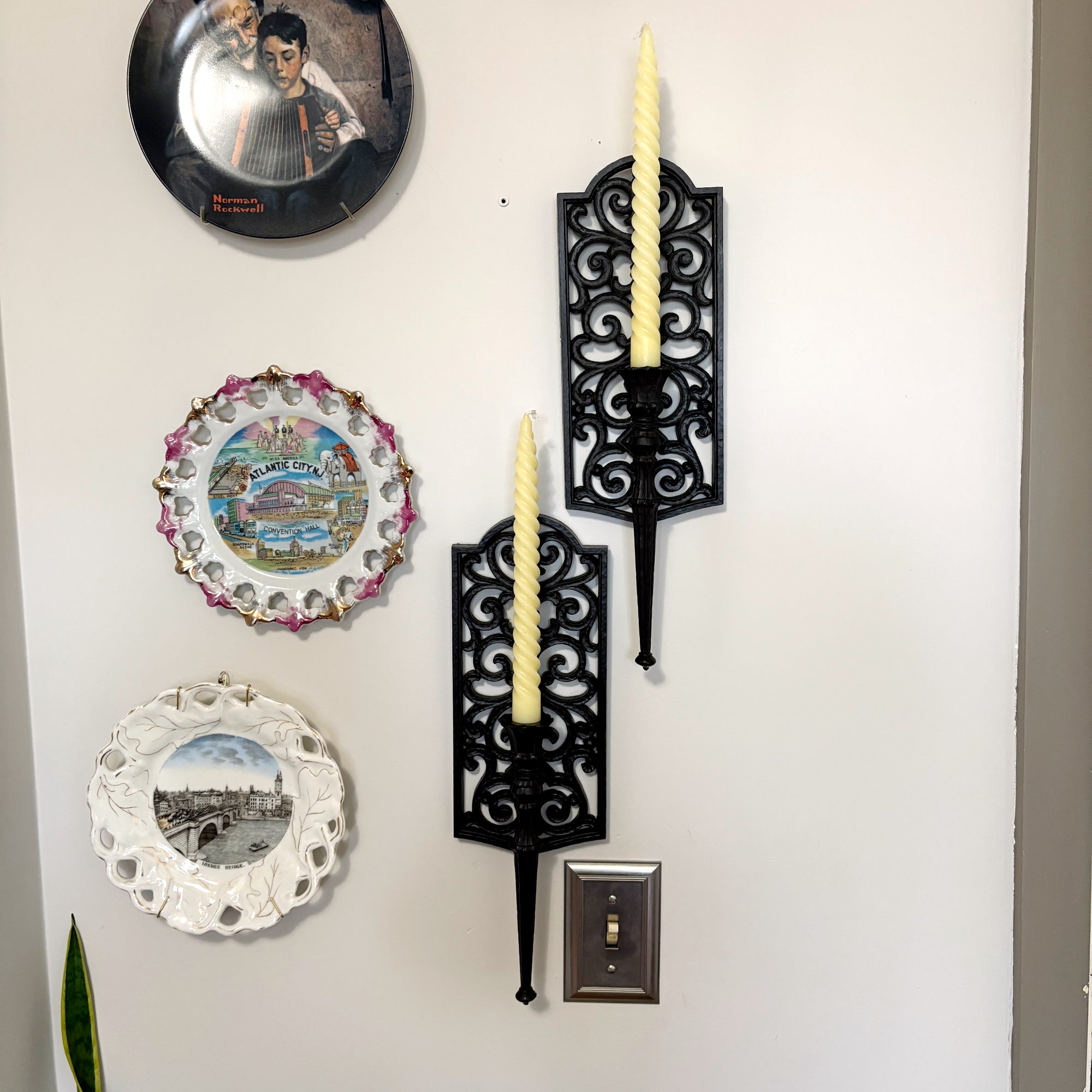 Set of two lightweight resin wall sconces, model #4101, were made to look like wrought iron by Dart Industries, makers of Syroco and Tupperware. Copyright 1970, these were part of the great antique mediterranean decorating trend of the 1970s. Hooks on back for hanging. Cup would hold a taper candle.