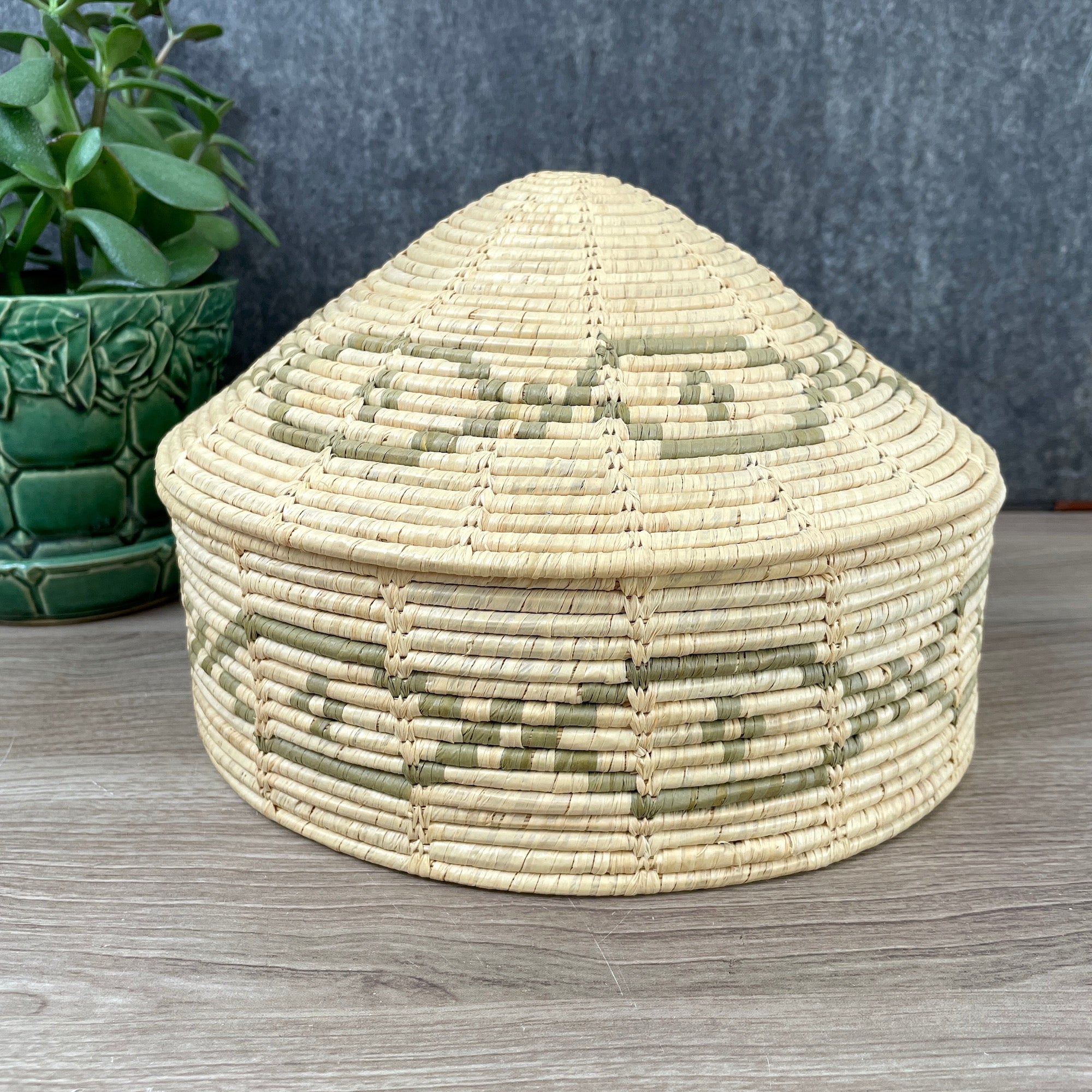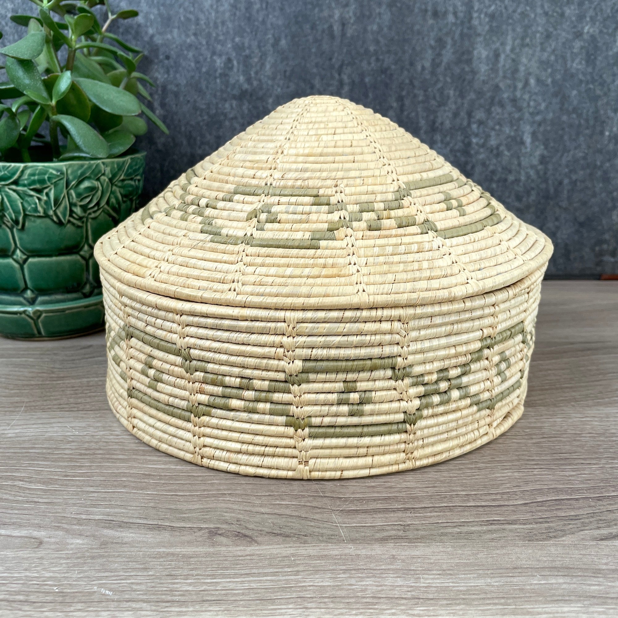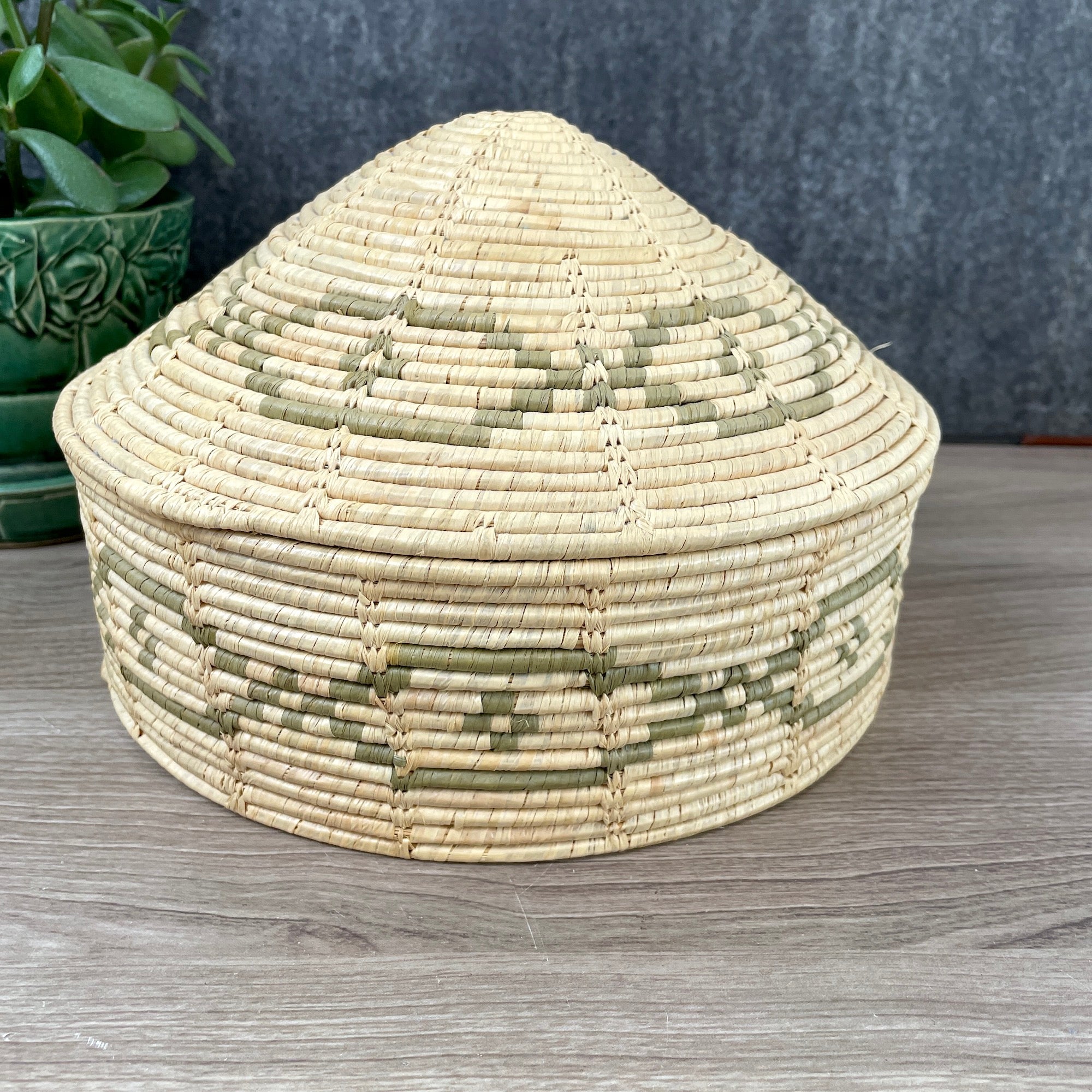 Vintage 1980s round coiled raffia basket with a cover. Natural color with a pattern woven in light sage green. Flat bottom, coned lid.