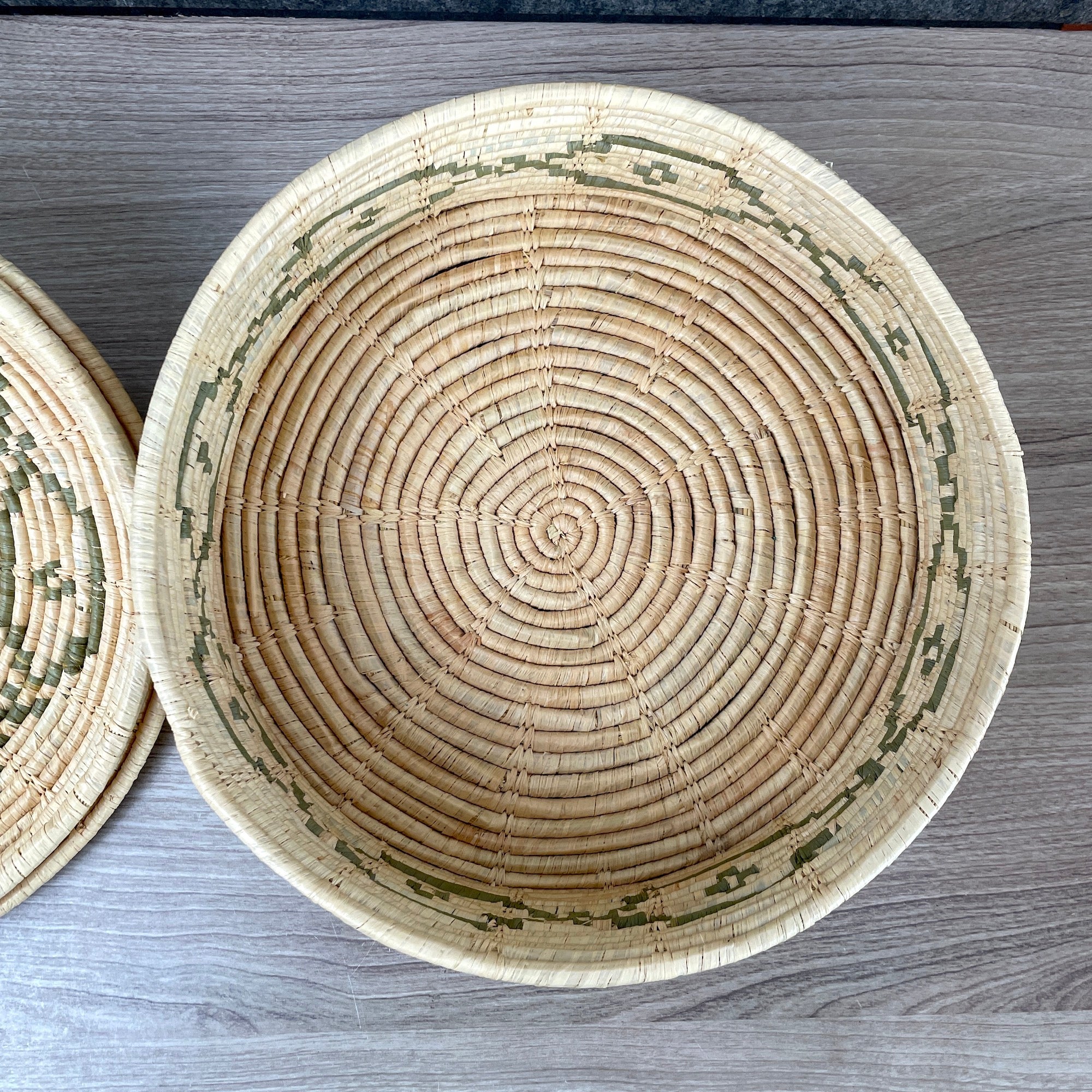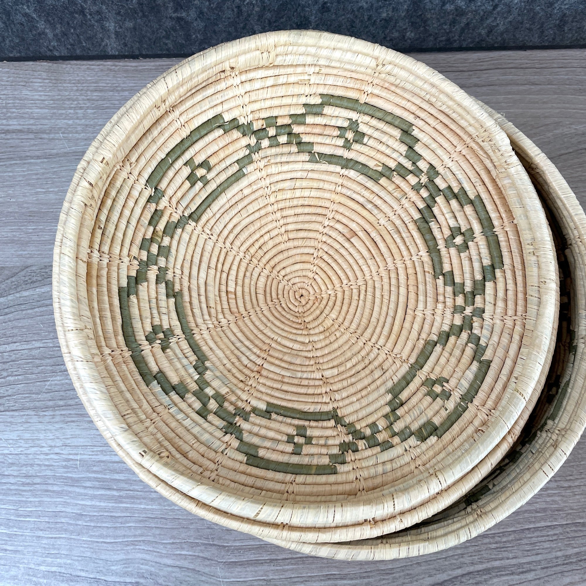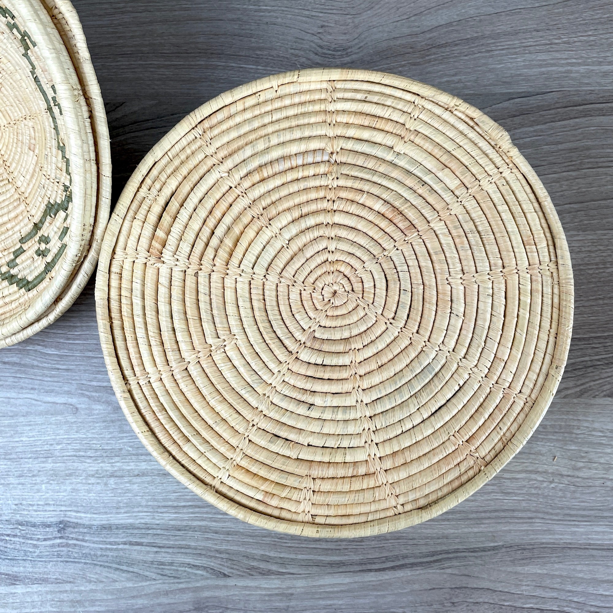 Vintage 1980s round coiled raffia basket with a cover. Natural color with a pattern woven in light sage green. Flat bottom, coned lid.