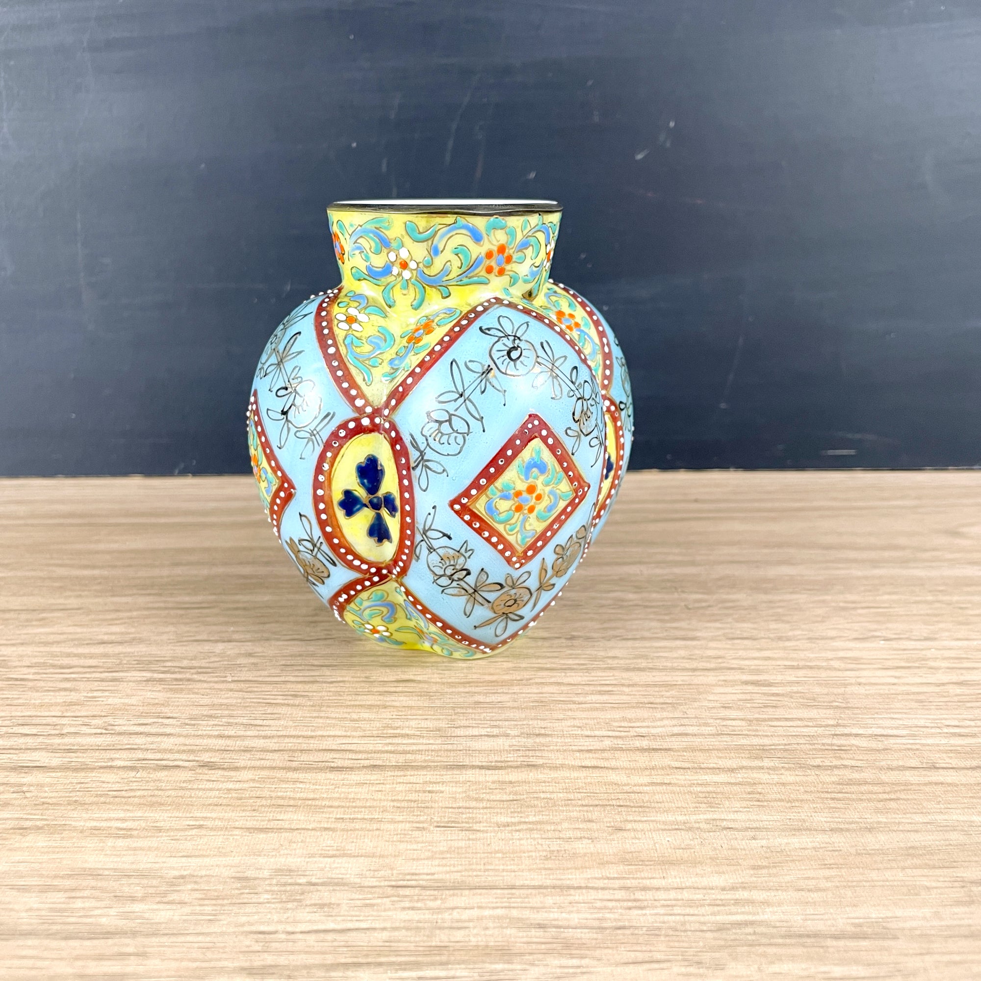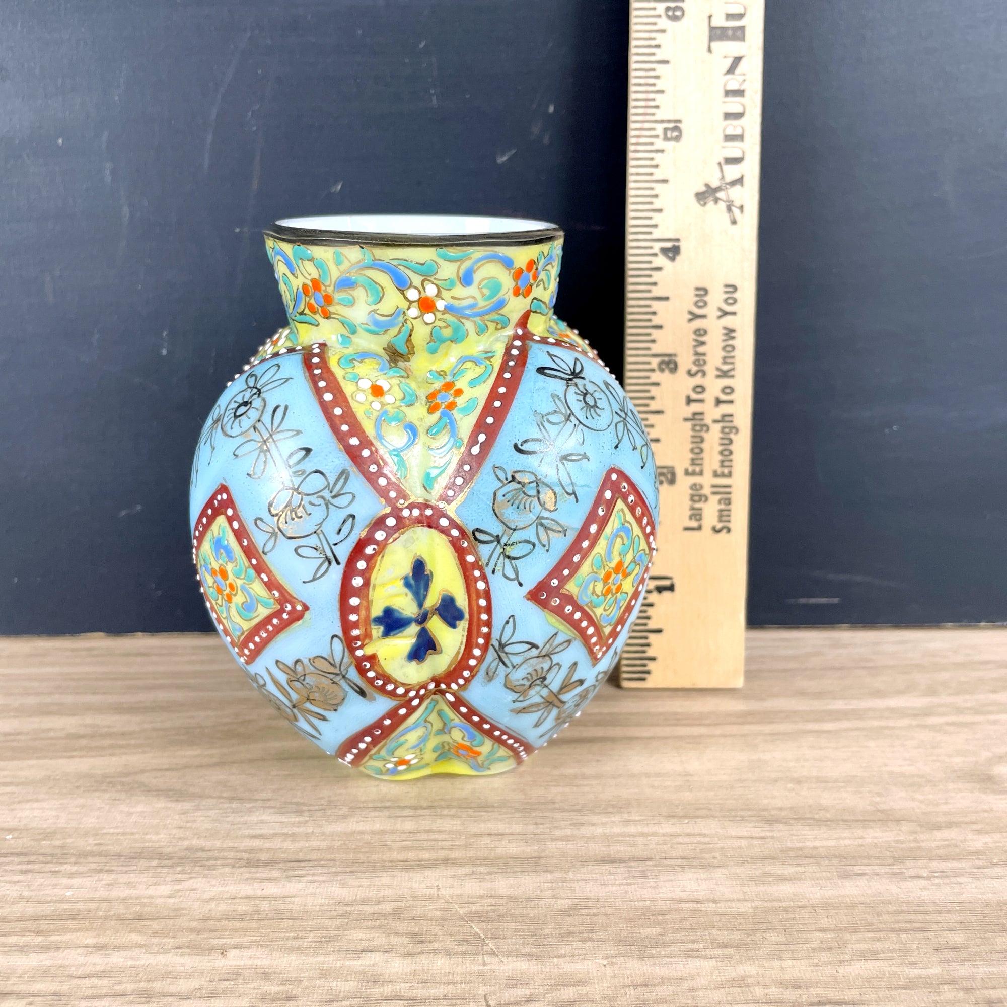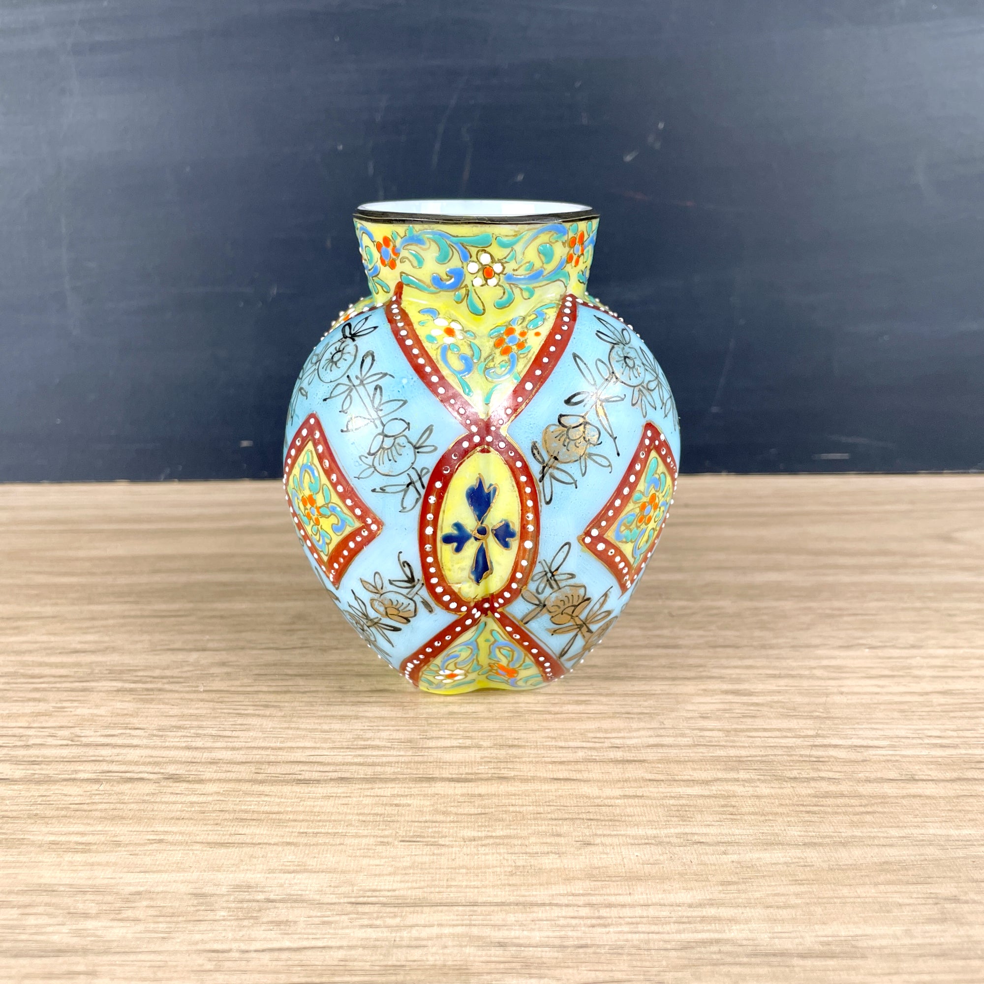 Vintage Bohemian painted white glass vase. Delicate shape with raised enamel details. Likely from the early 1900s, but no identifying marks.