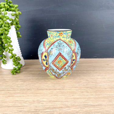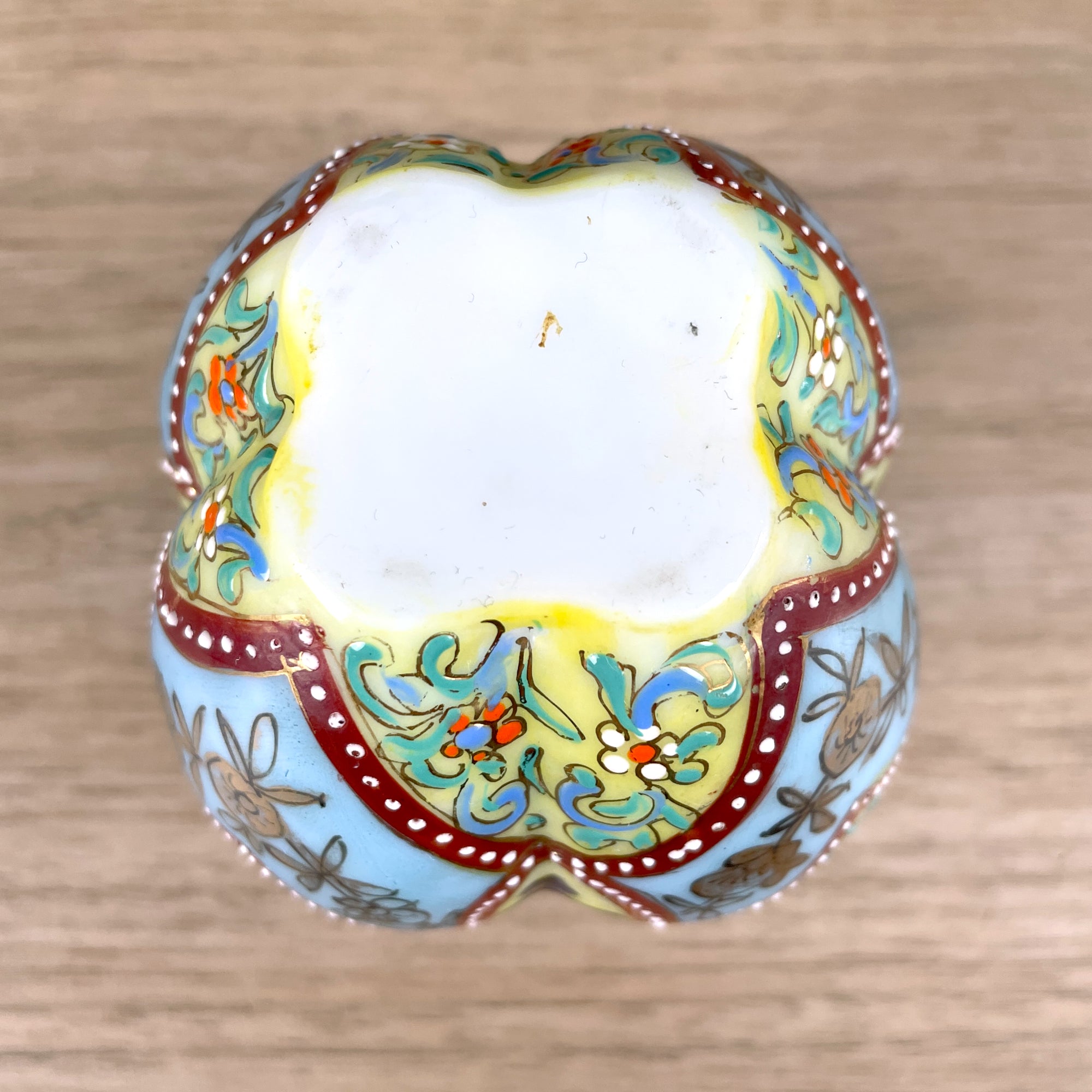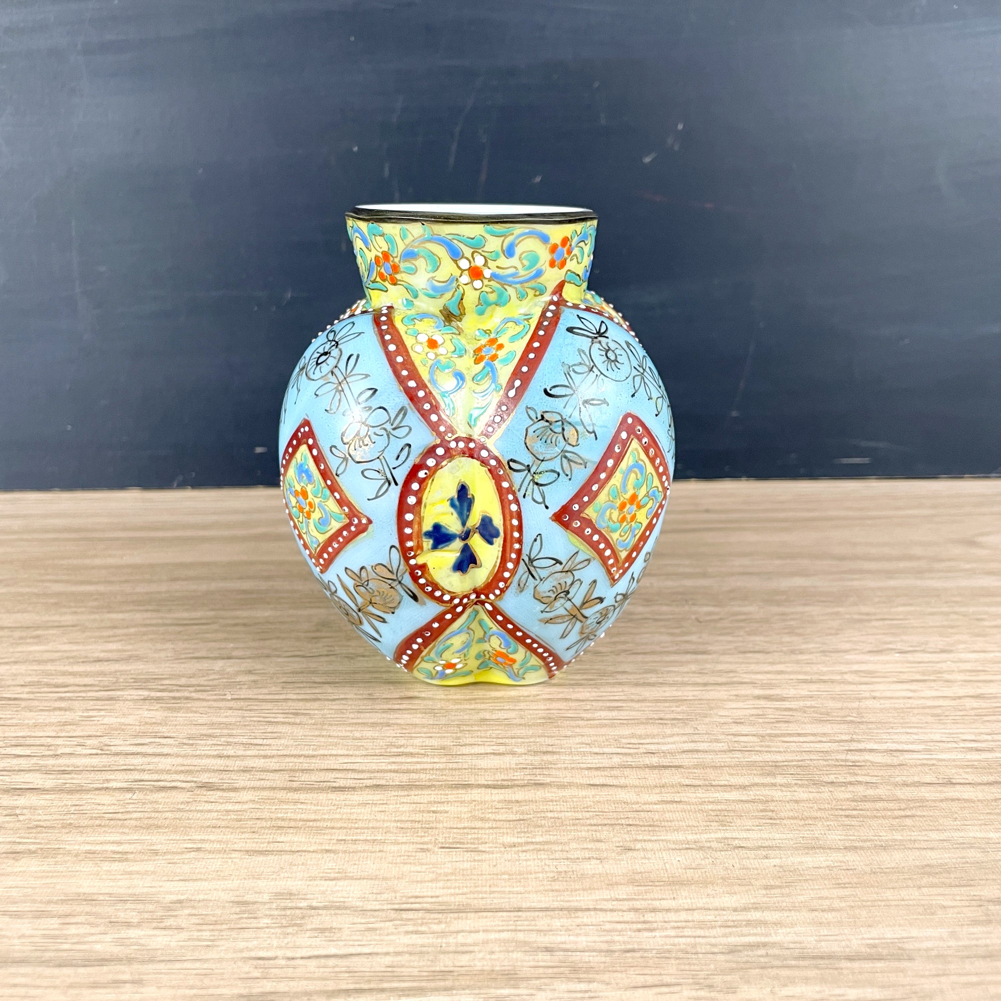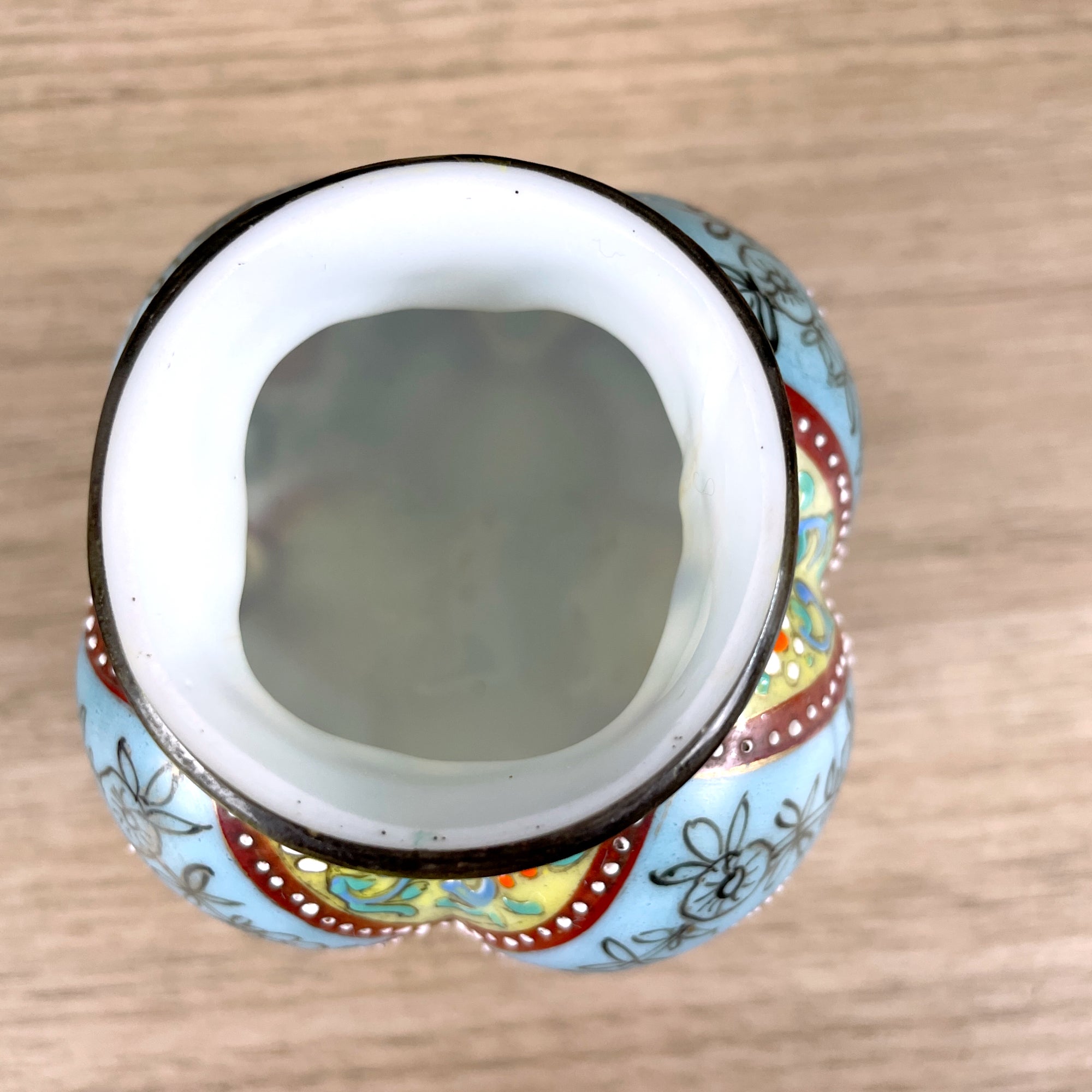 Vintage Bohemian painted white glass vase. Delicate shape with raised enamel details. Likely from the early 1900s, but no identifying marks.