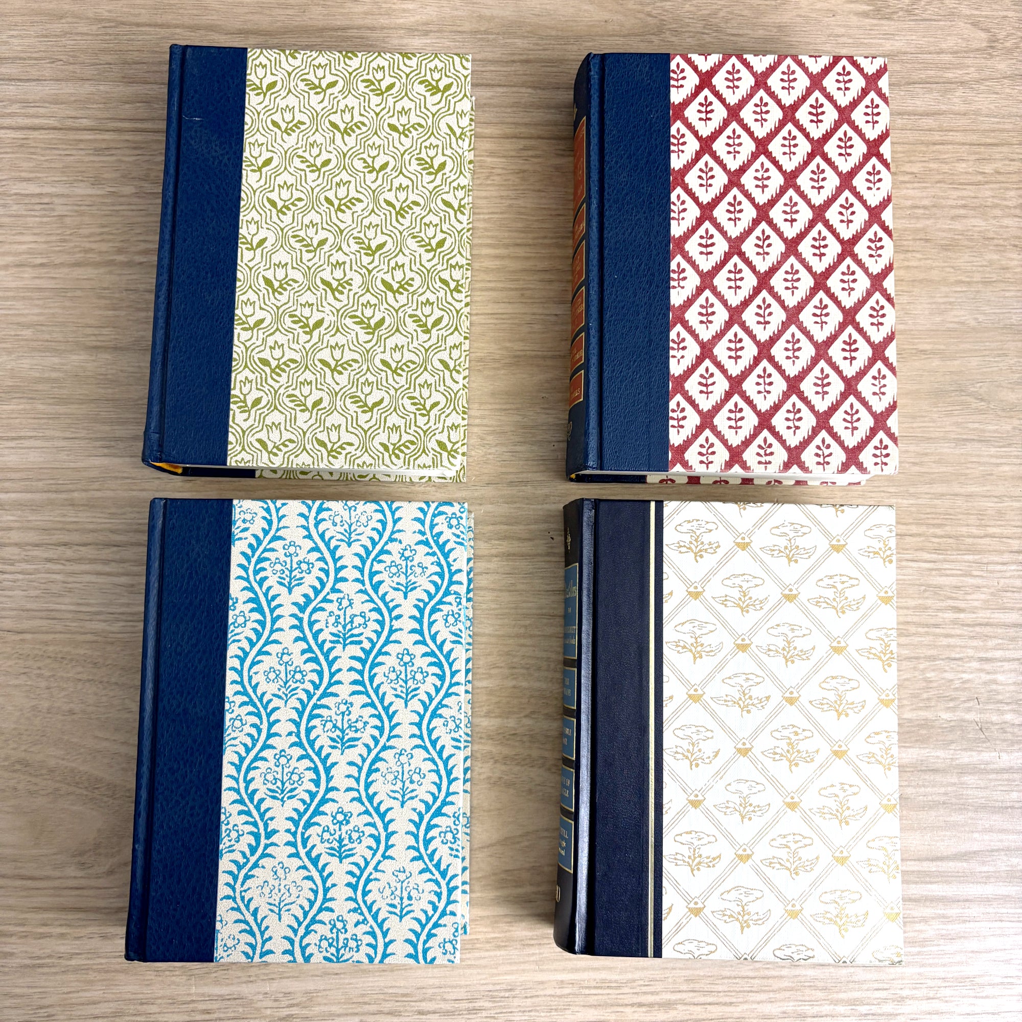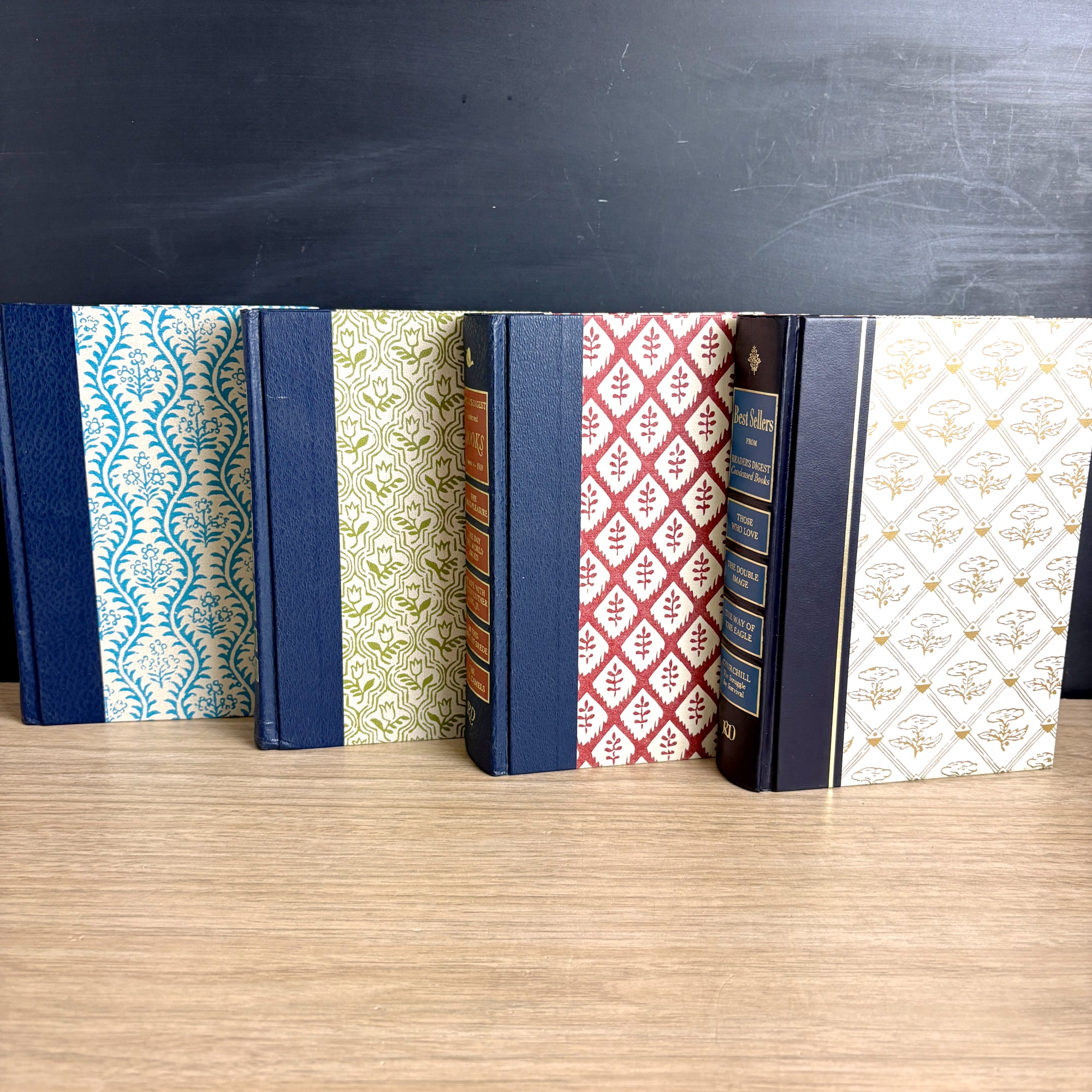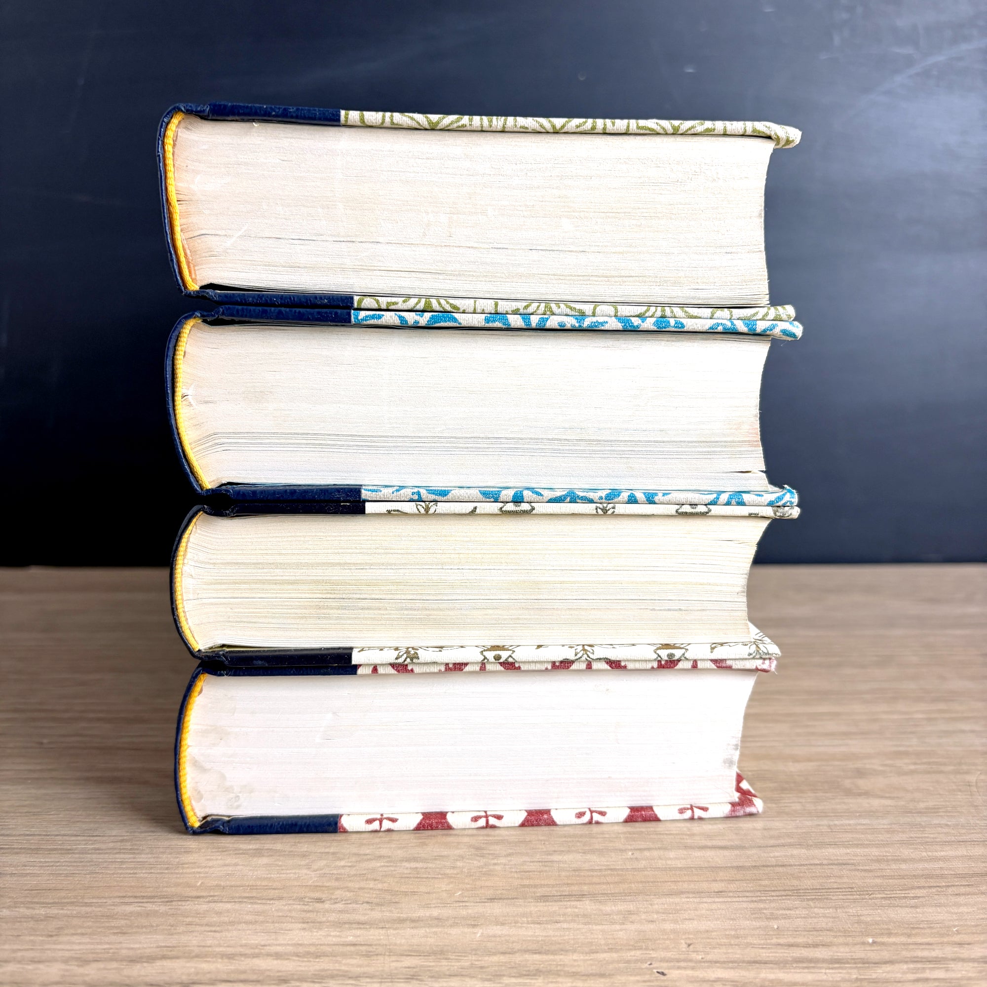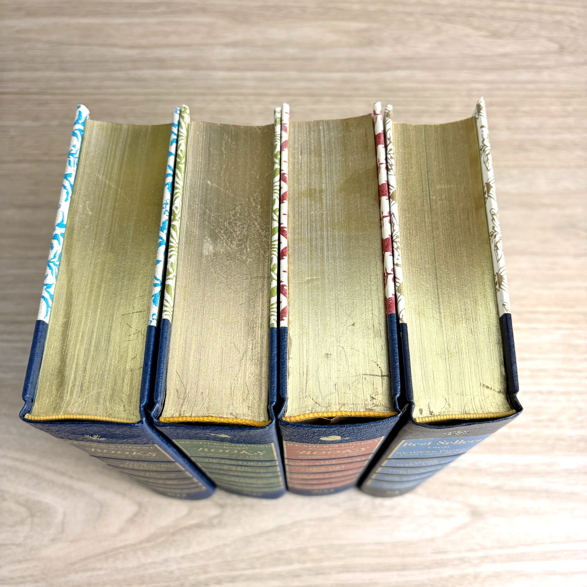 The top edges of the page blocks are gilded, adding an elegant finishing detail. All four books have fabulous floral striped cover designs, with unique patterns for each volume.
