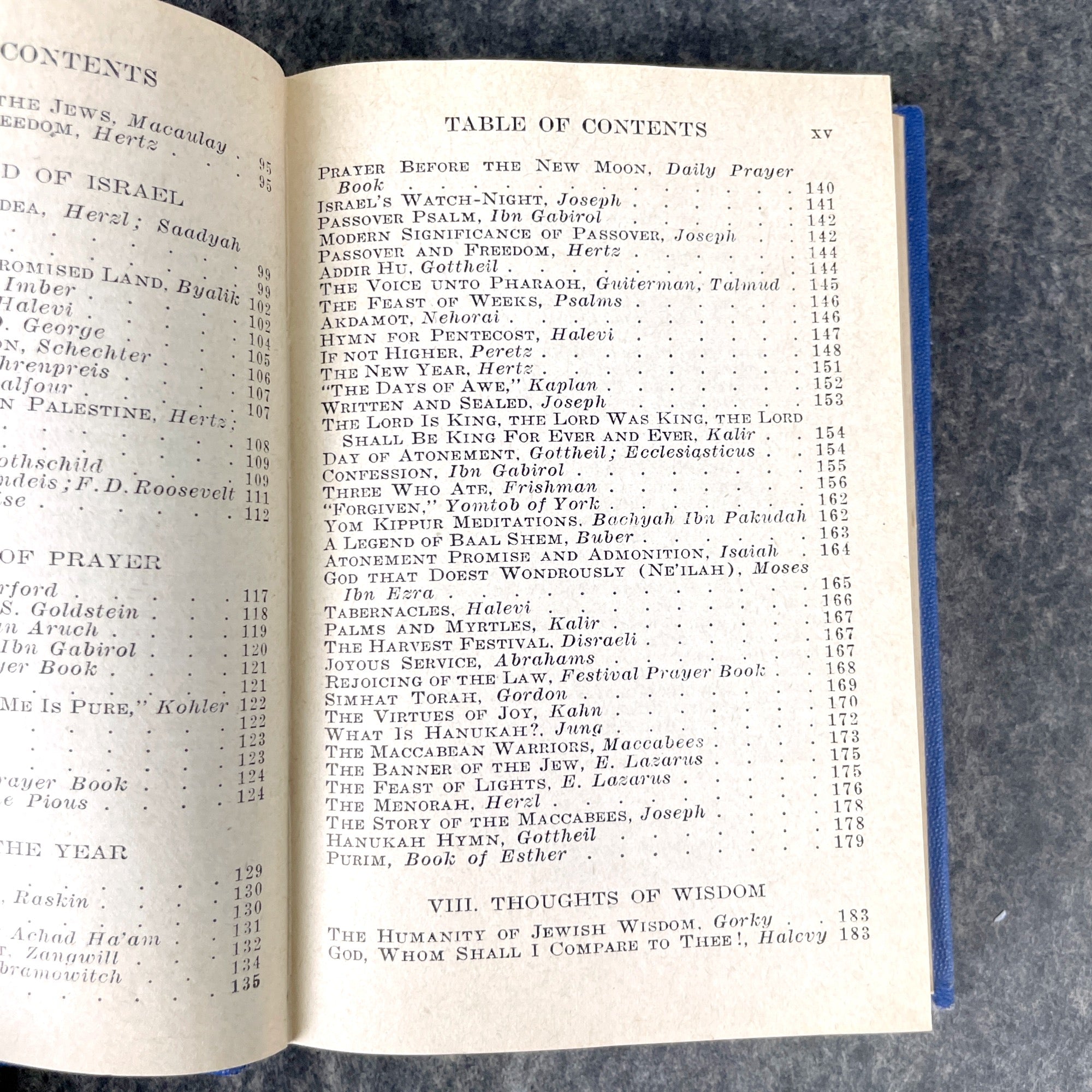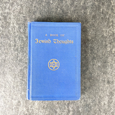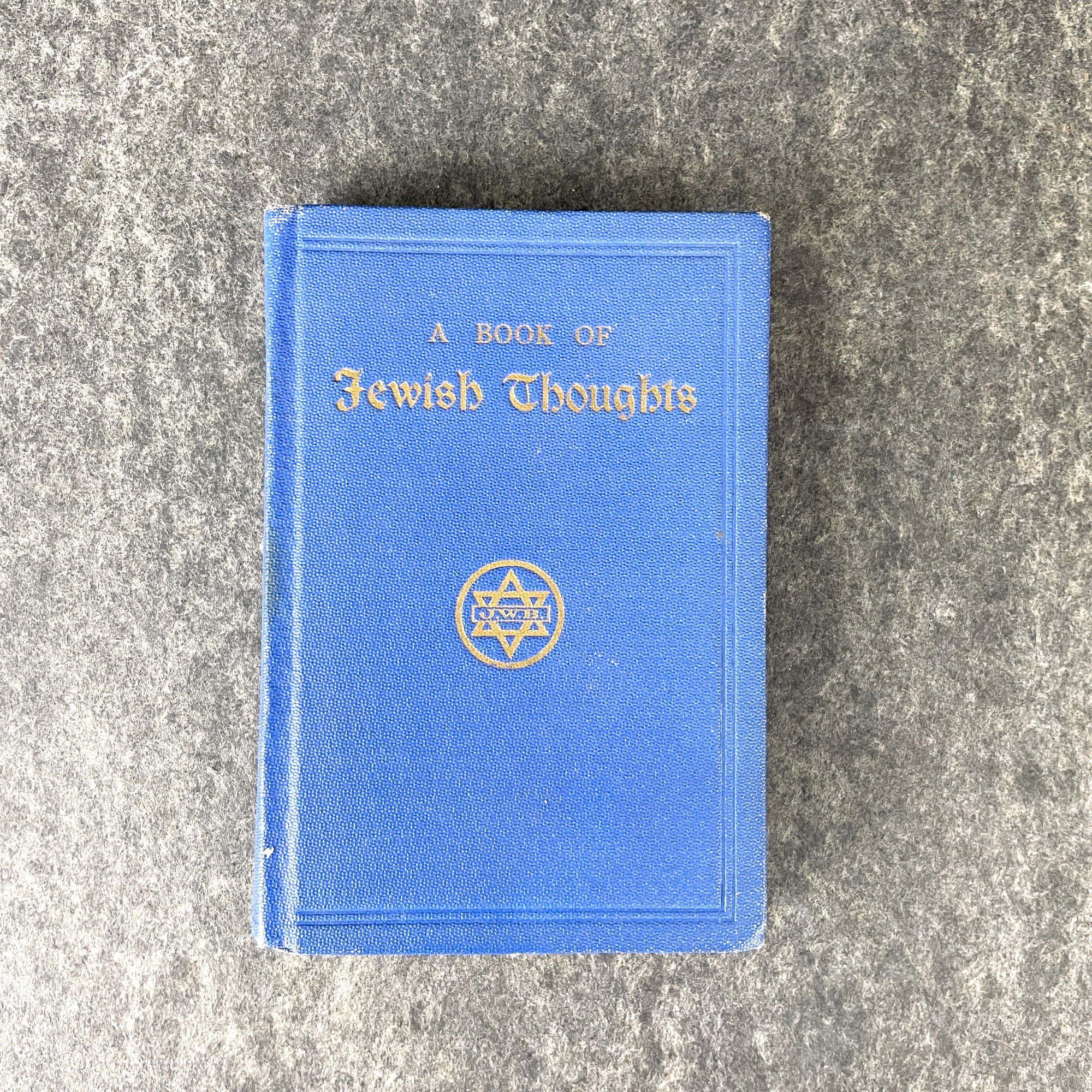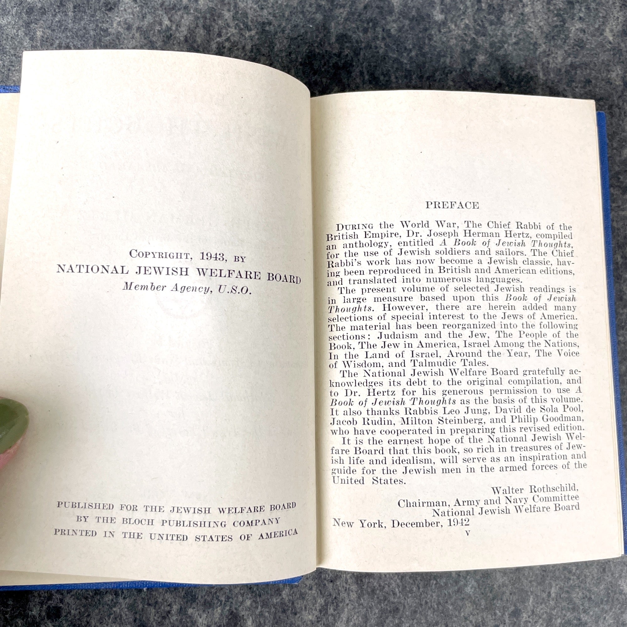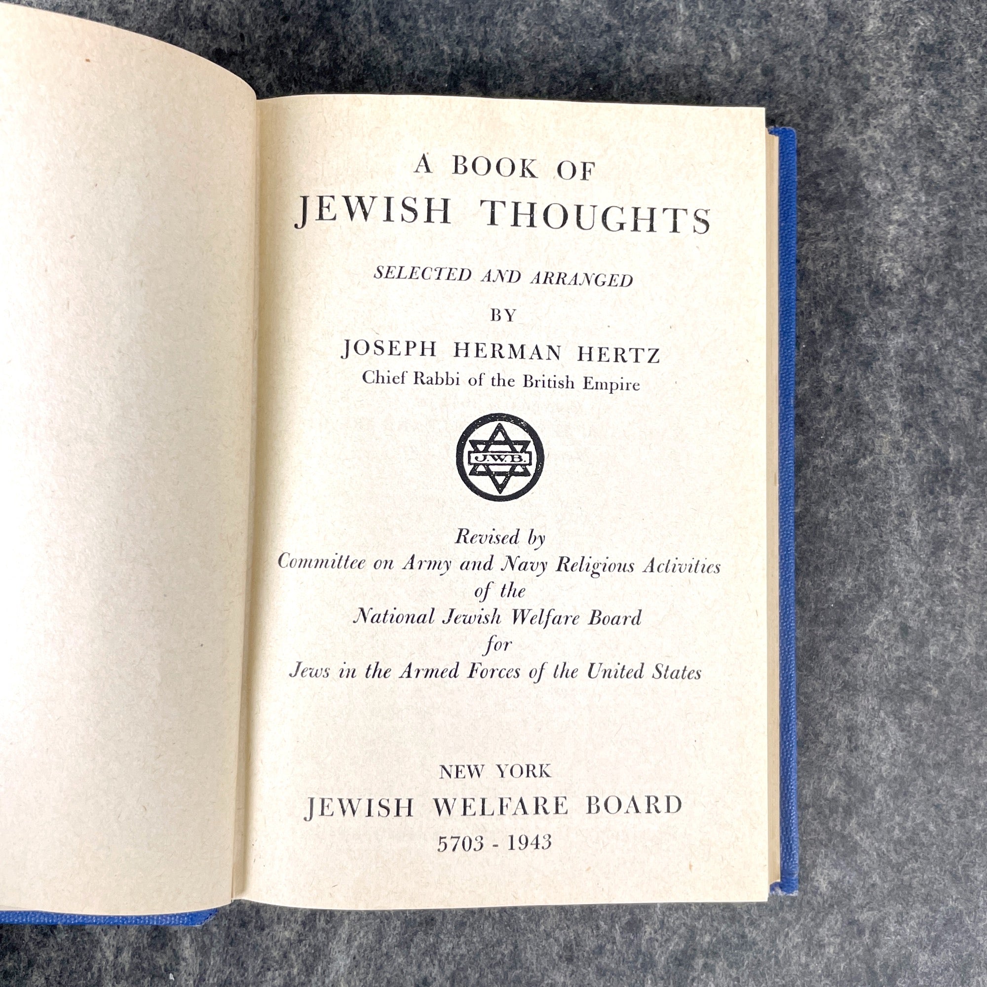 "A Book of Jewish Thoughts" selected and arranged by Joseph Herman Hertz, Chief Rabbi of the British Empire. Revised by Committee on Army and Navy Religious Activities of the National Jewish Welfare Board for Jews in the Armed Forces of the United States. Copyright 1943, National Jewish Welfare Board. Small blue hardcover.