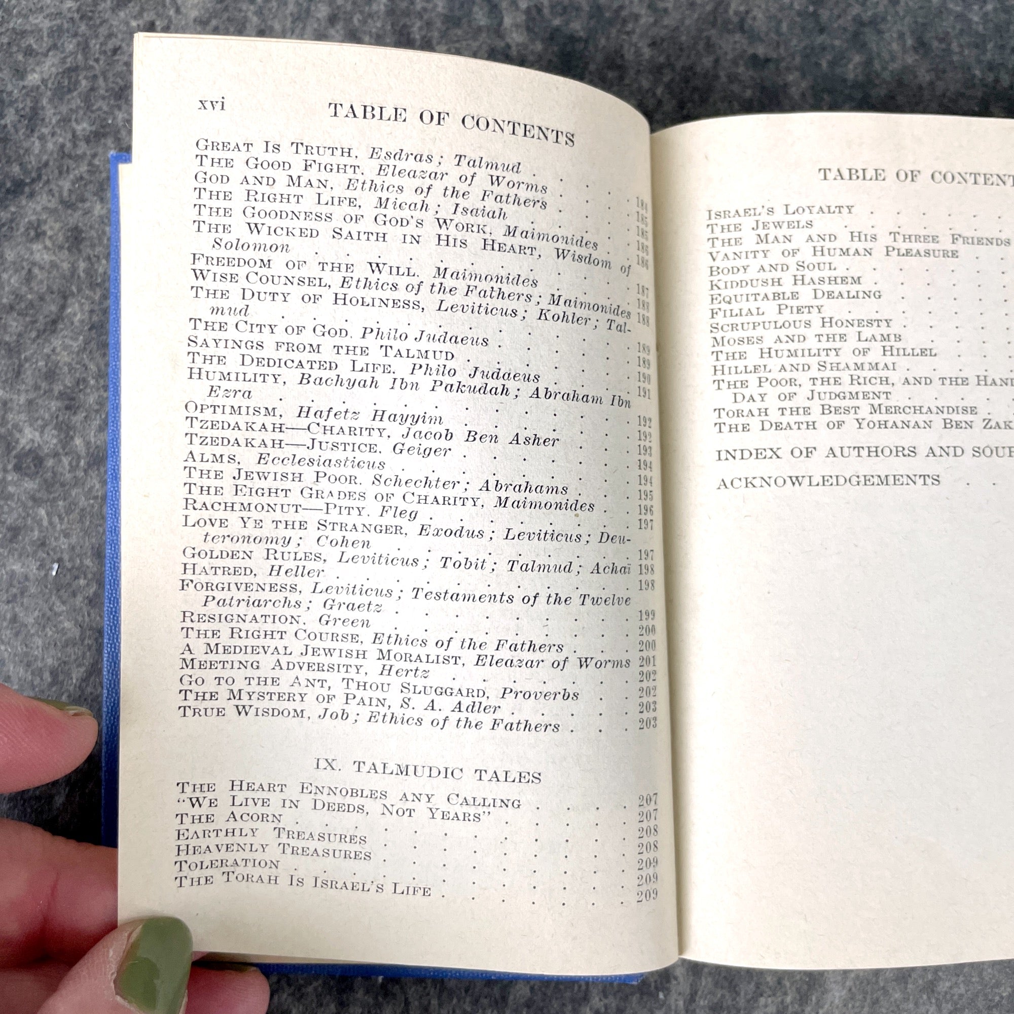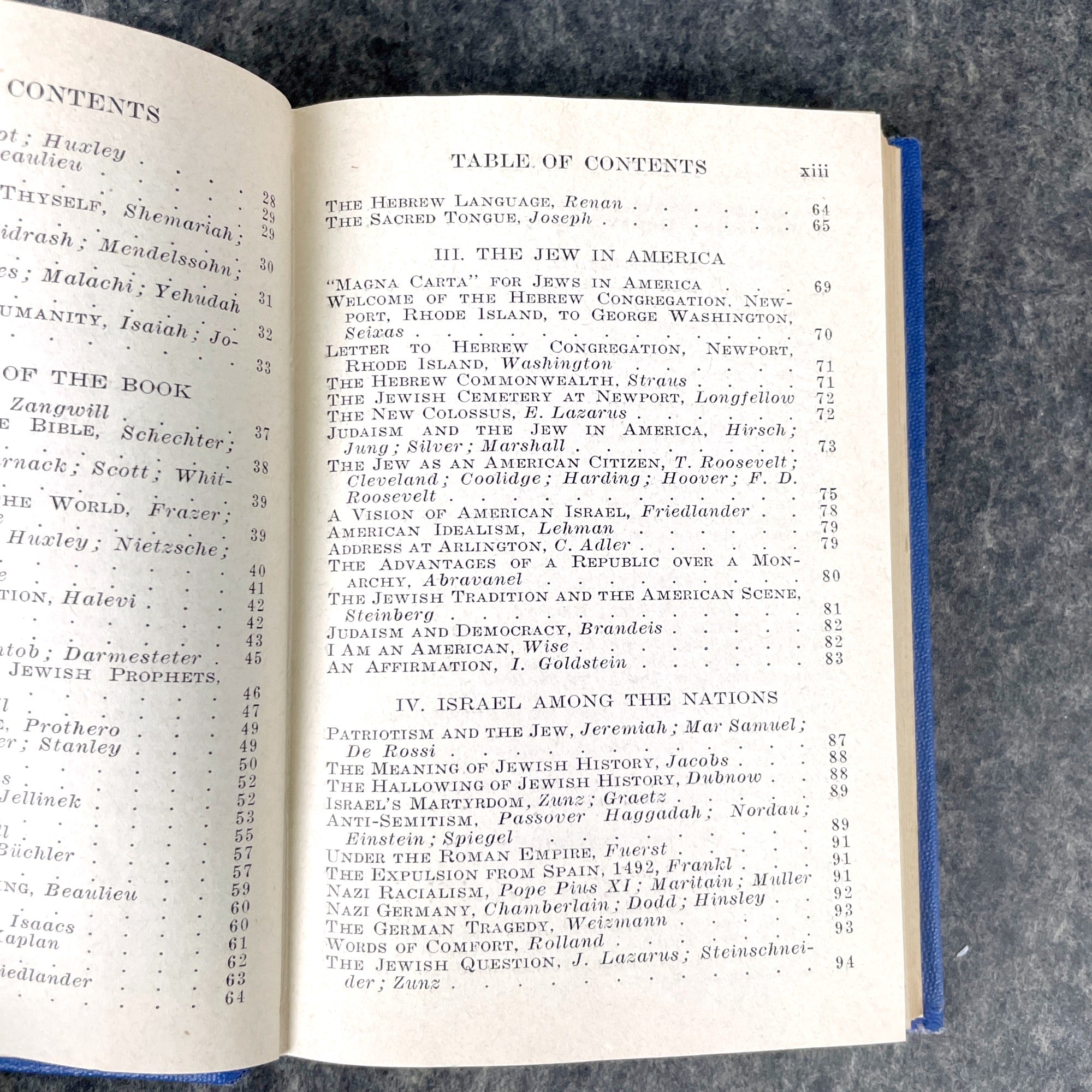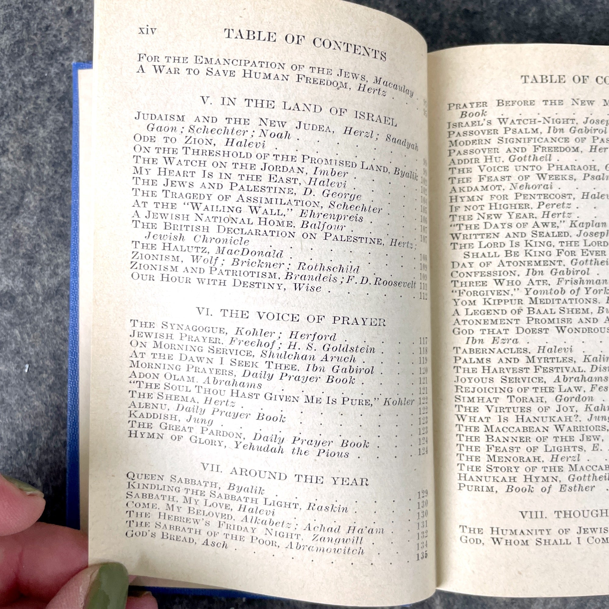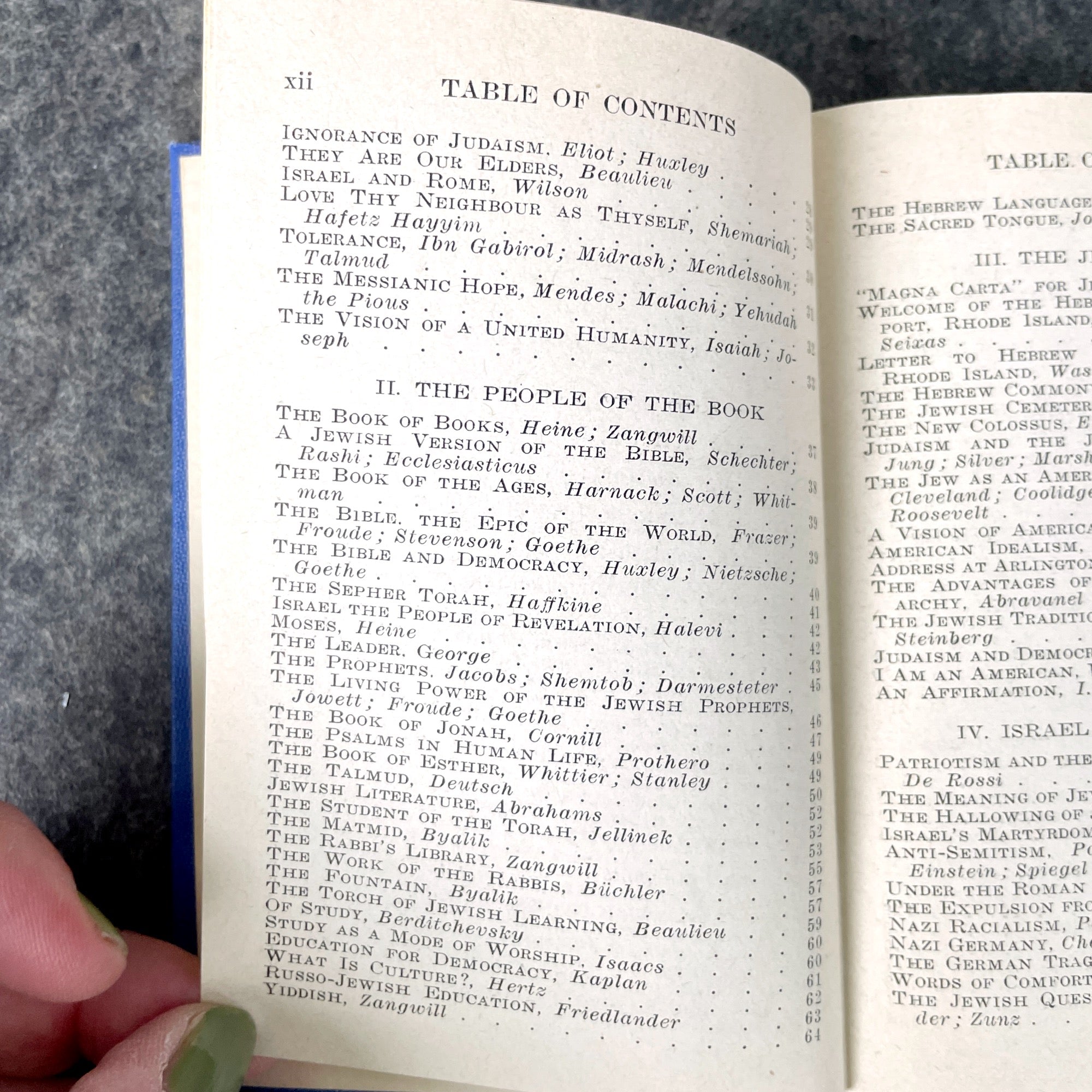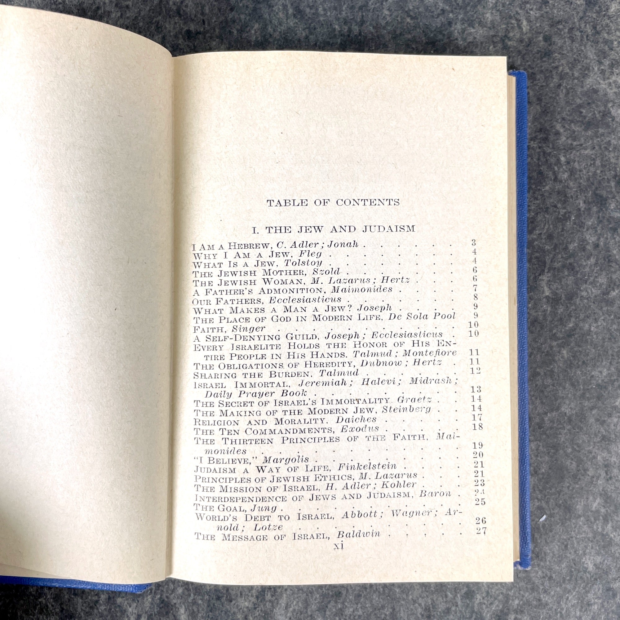 "A Book of Jewish Thoughts" selected and arranged by Joseph Herman Hertz, Chief Rabbi of the British Empire. Revised by Committee on Army and Navy Religious Activities of the National Jewish Welfare Board for Jews in the Armed Forces of the United States. Copyright 1943, National Jewish Welfare Board. Small blue hardcover.