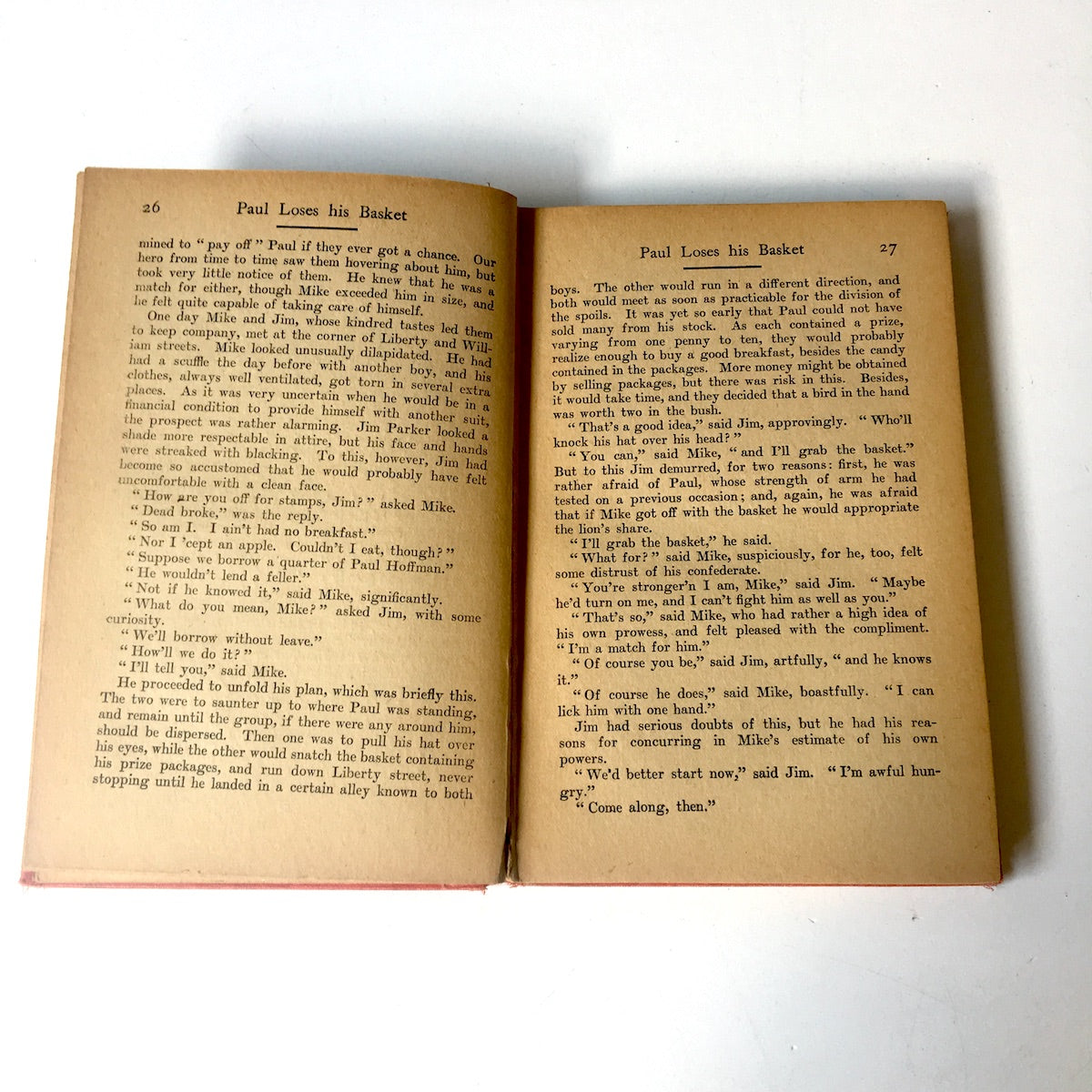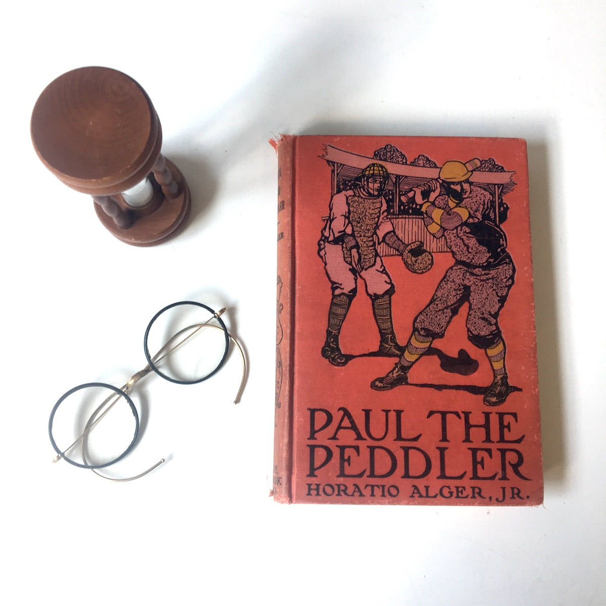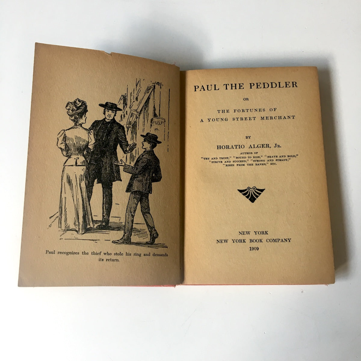 "Paul the Peddler or The Fortunes of a Young Street Merchant" by Horatio Alger, Jr. Published in 1908 by The New York Book Company. Red cloth hardcover with printed graphics.