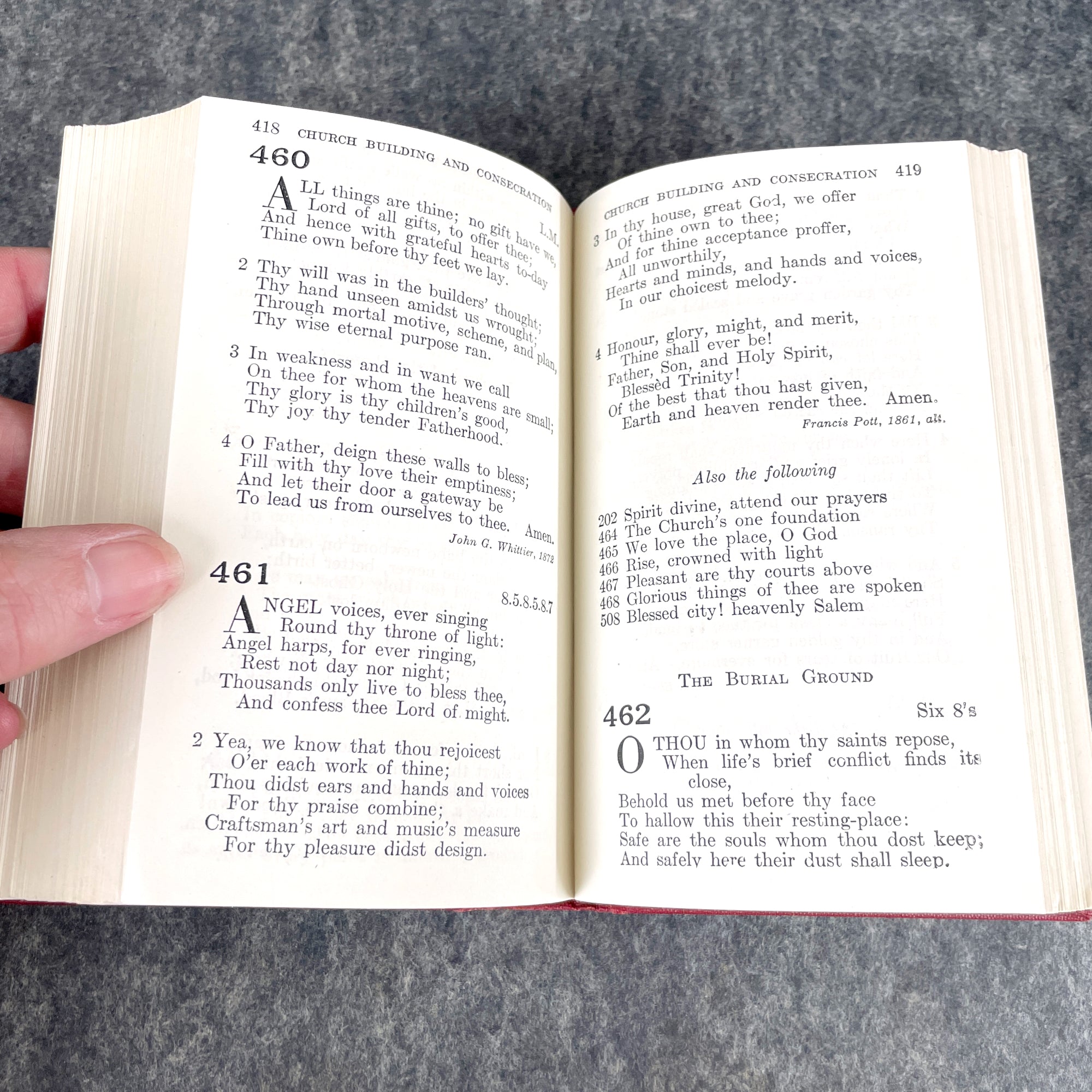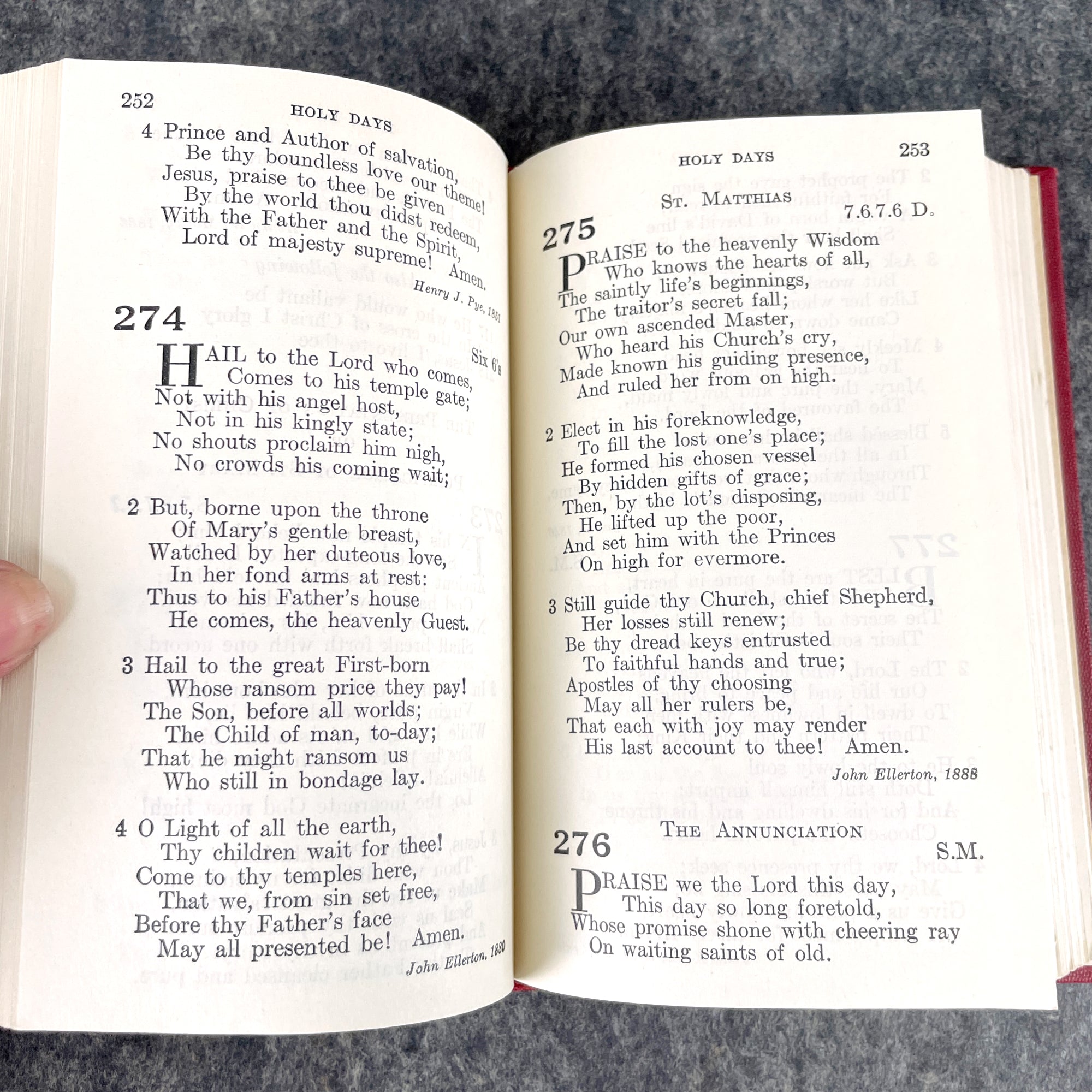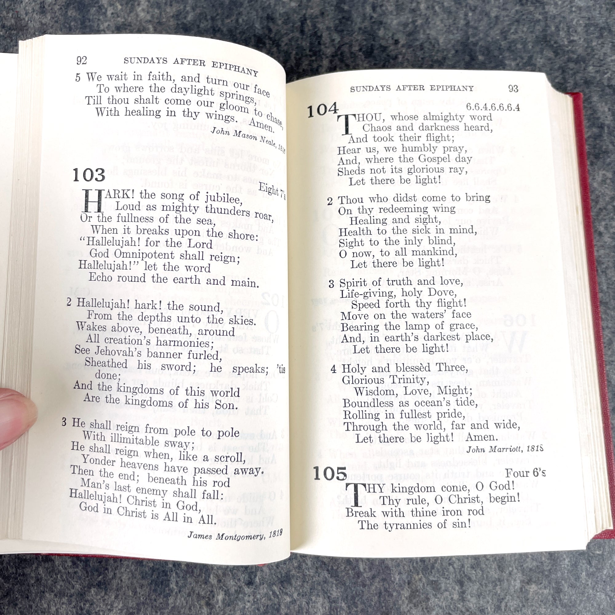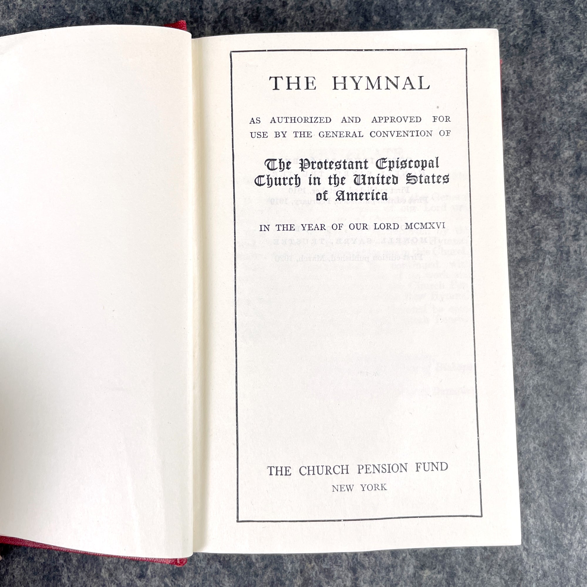Full title is "THE HYMNAL As Authorized and Approved For Use By The General Convention Of The Protestant Episcopal Church in the United States of America". This petite volume has lyrics, but no music. Red cloth hard cover. Gold lettering on the side.
