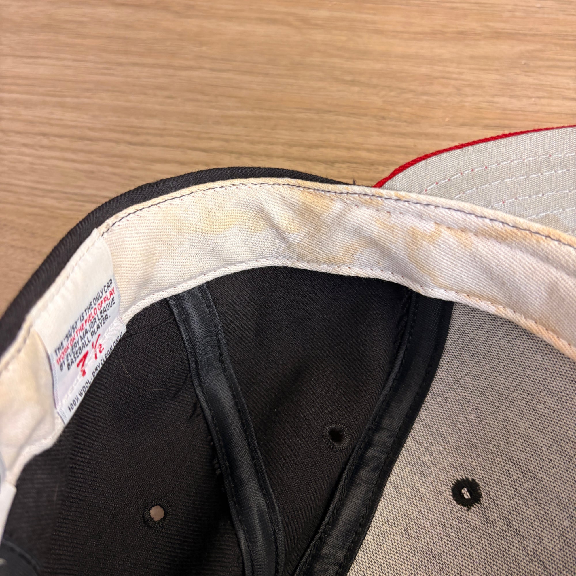 CONDITION This hat was worn, as such there are sweat stains on the underside of the brim and sweatband. The stitching is intact and there are no tears or rips. The brim is still stiff and solid.