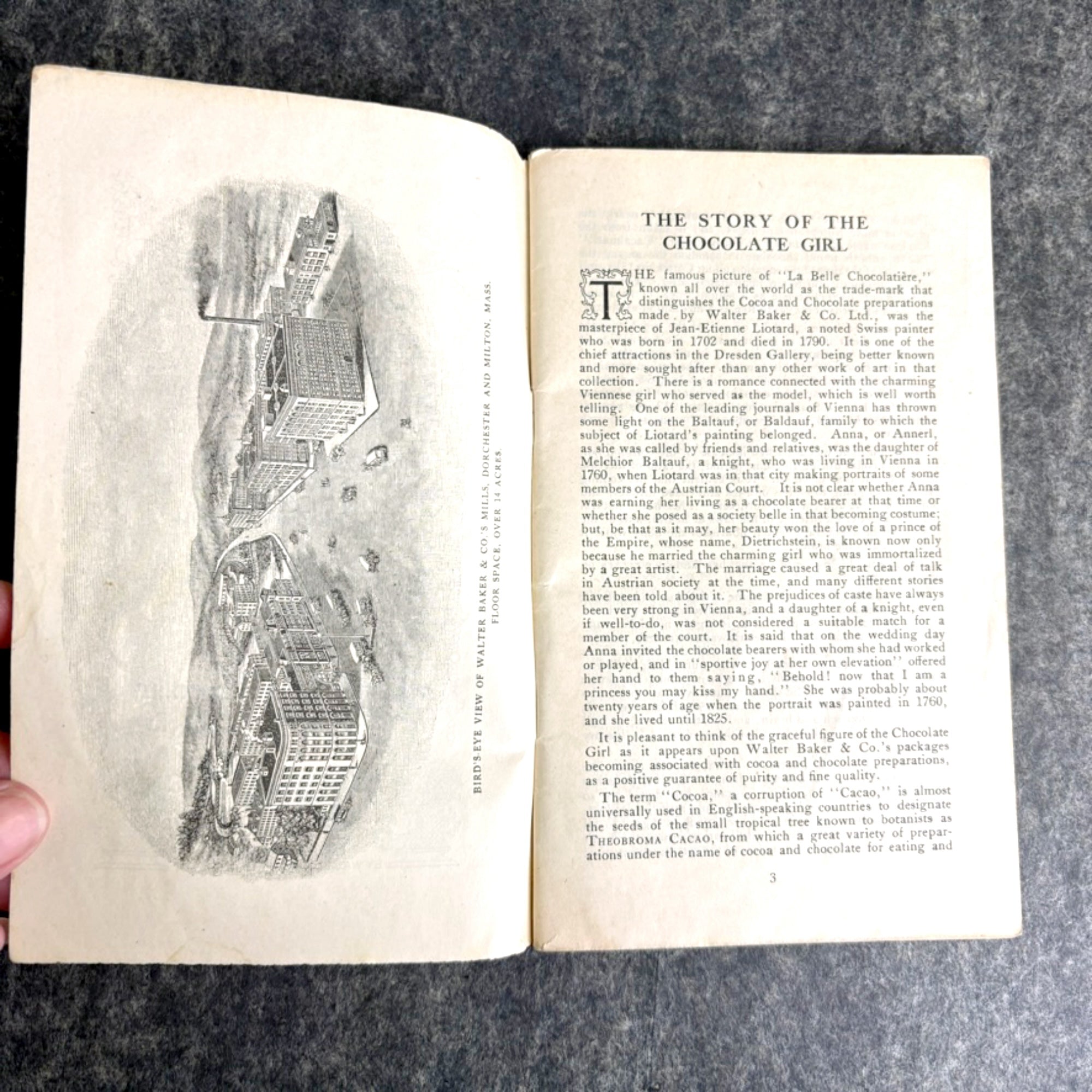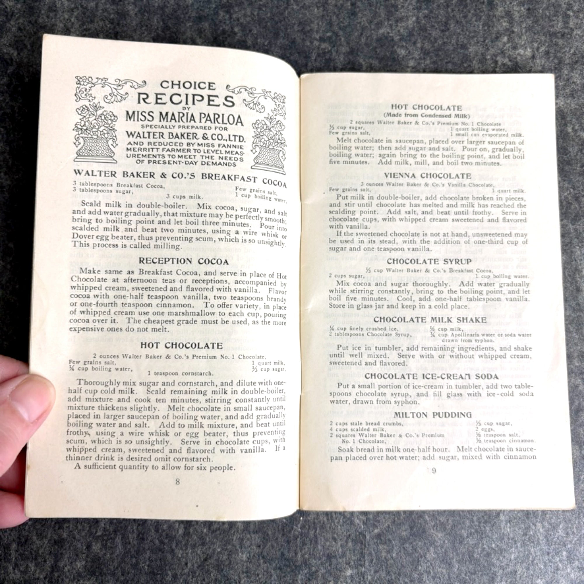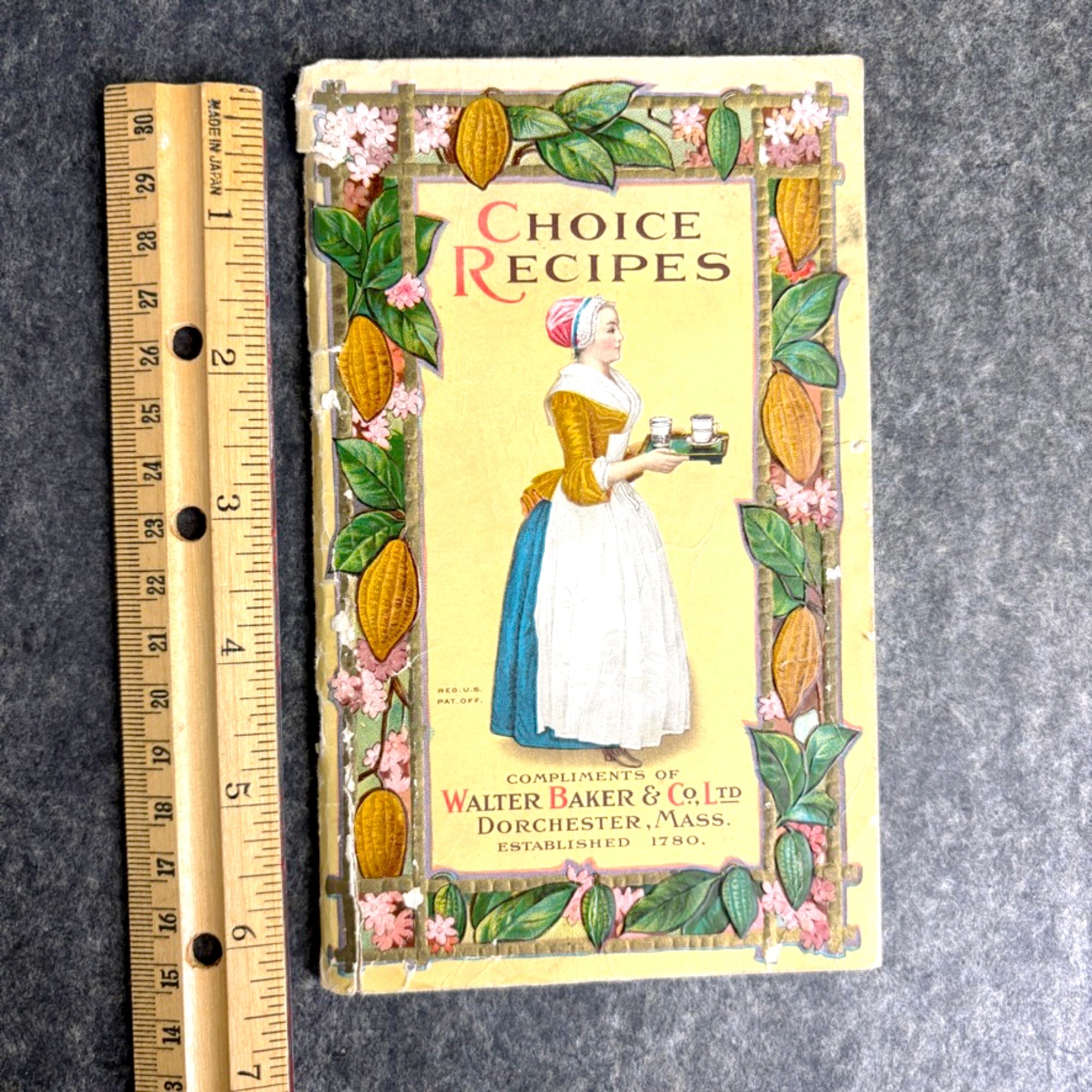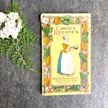 "Choice Recipes" Compliments of Walter Baker & Co. Ltd, Dorchester, MA. The recipe booklet begins with "The Story of The Chocolate Girl" and continues with several recipes using cocoa and chocolate. Includes several mouthwatering color photographs. Copyright 1914