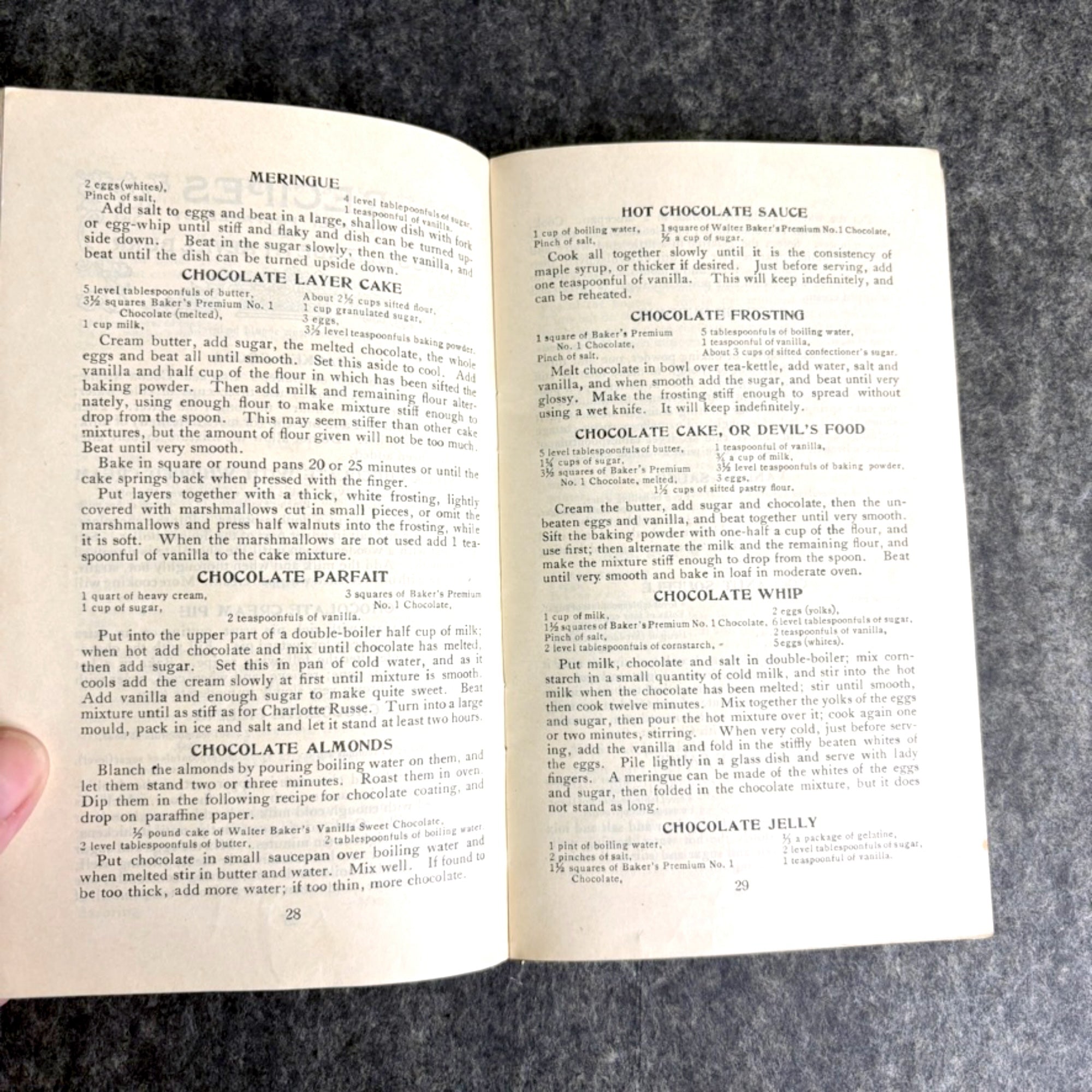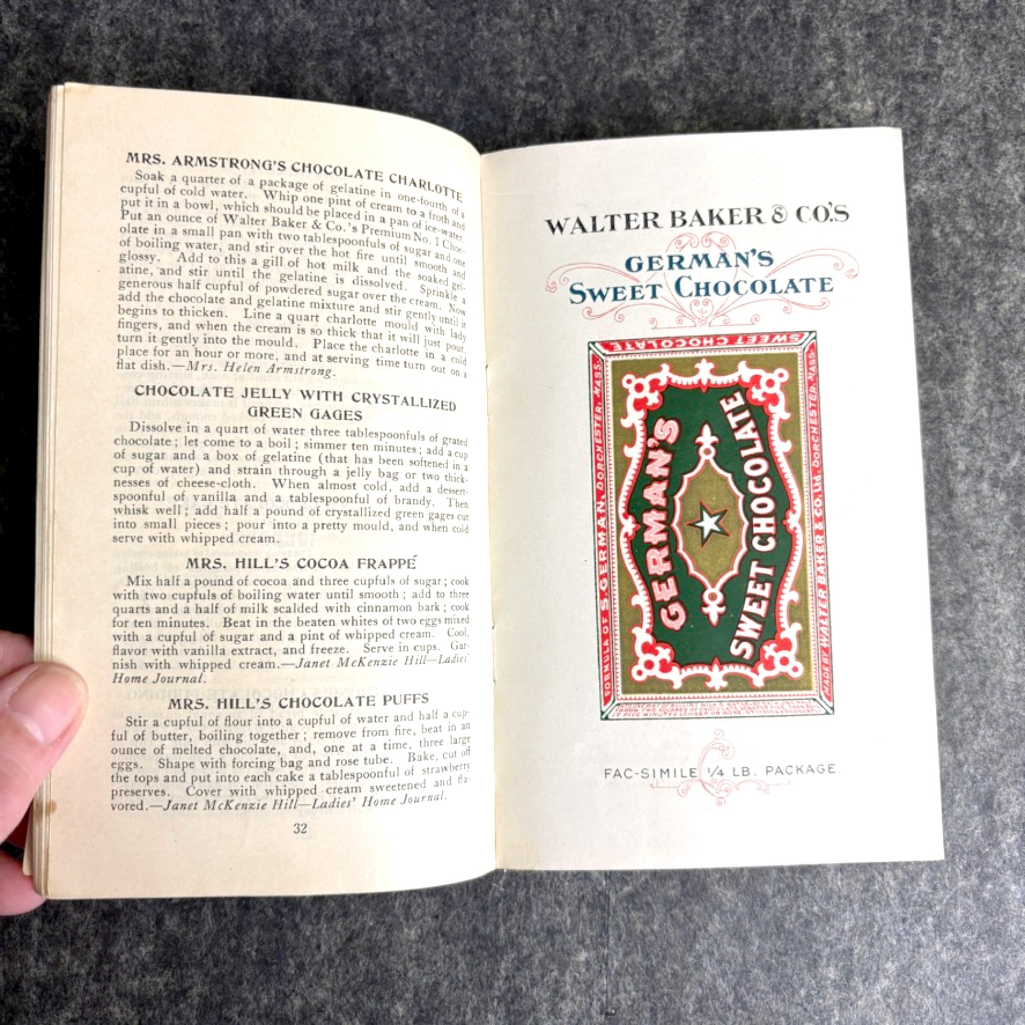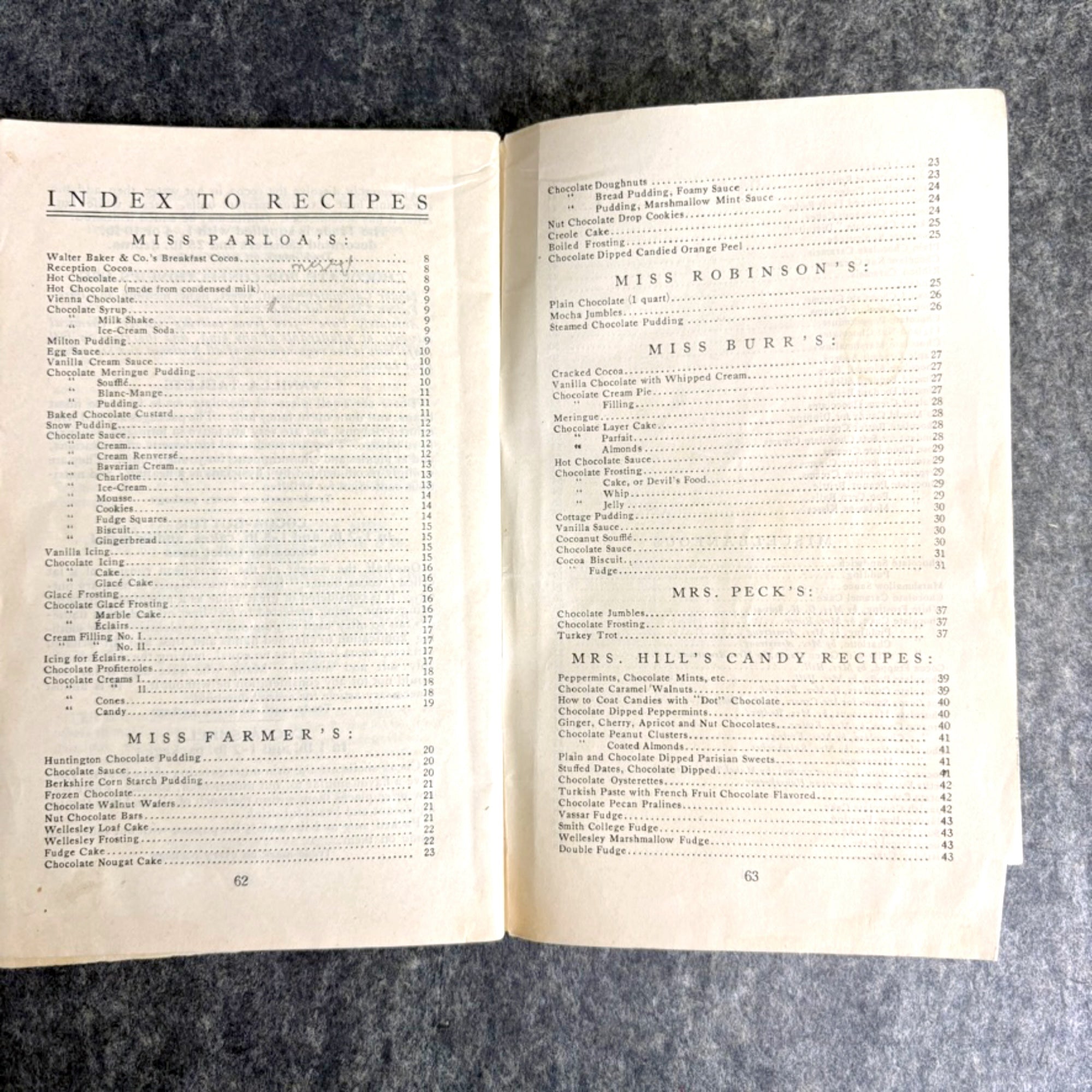 "Choice Recipes" Compliments of Walter Baker & Co. Ltd, Dorchester, MA. The recipe booklet begins with "The Story of The Chocolate Girl" and continues with several recipes using cocoa and chocolate. Includes several mouthwatering color photographs. Copyright 1914