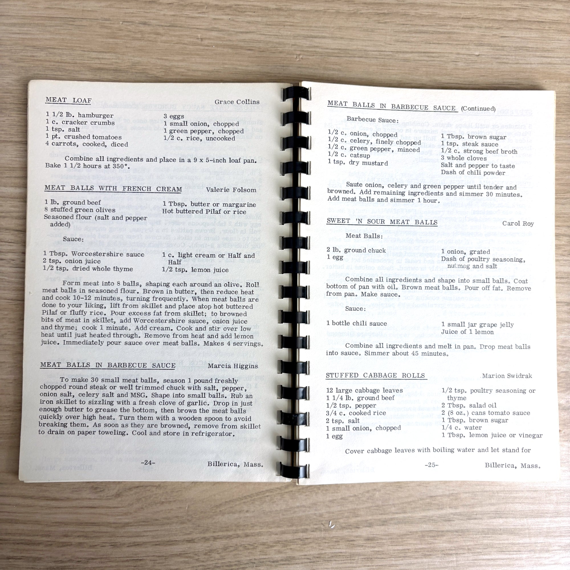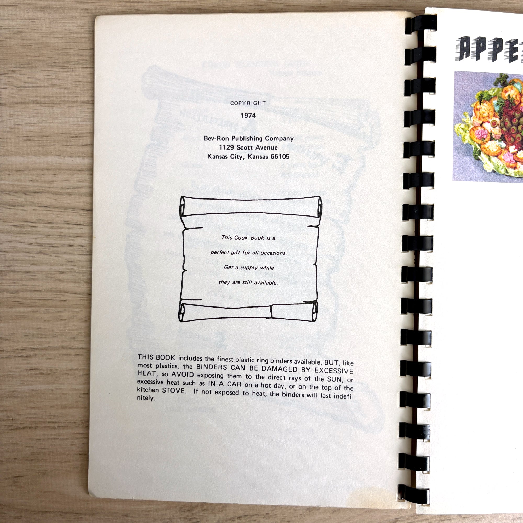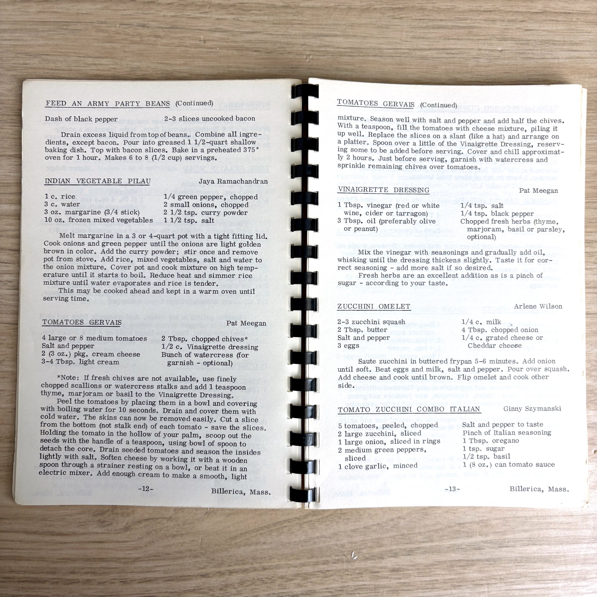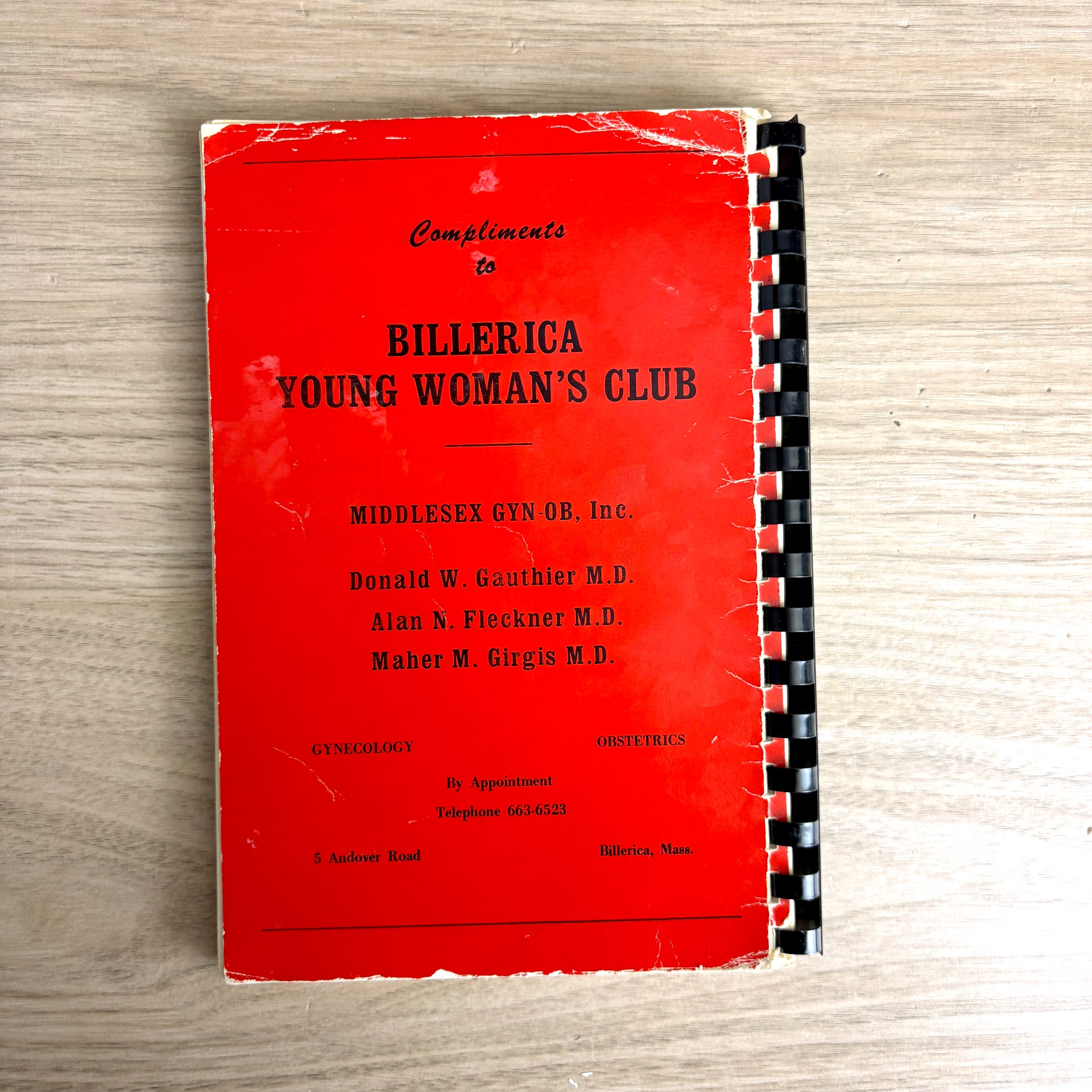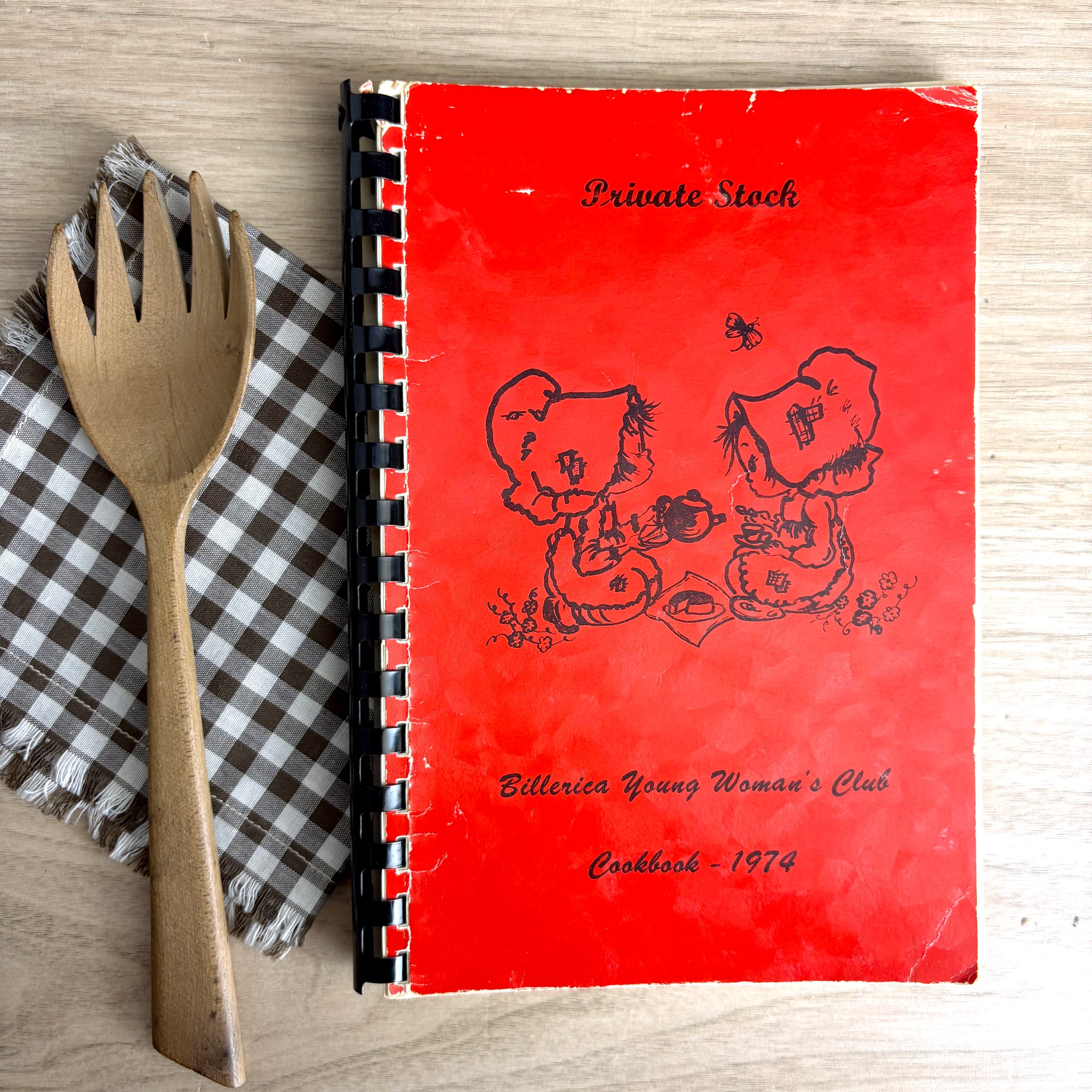 This vintage community cookbook, titled “Private Stock,” was compiled by the Billerica, Massachusetts Young Woman’s Club and published in 1974 by Bev-Ron Publishing Co., Kansas City, KS.