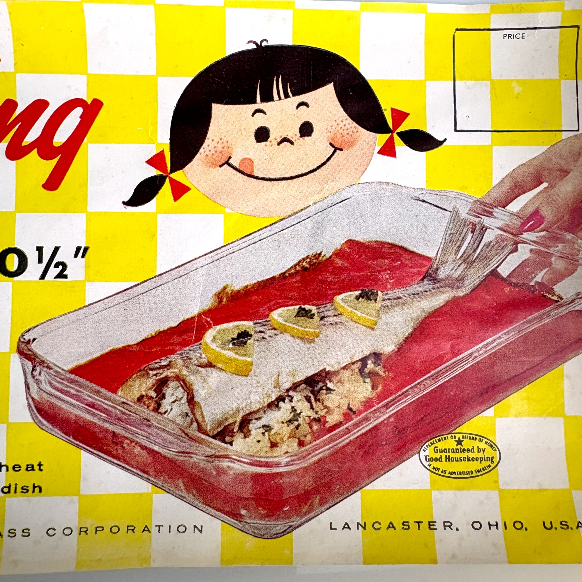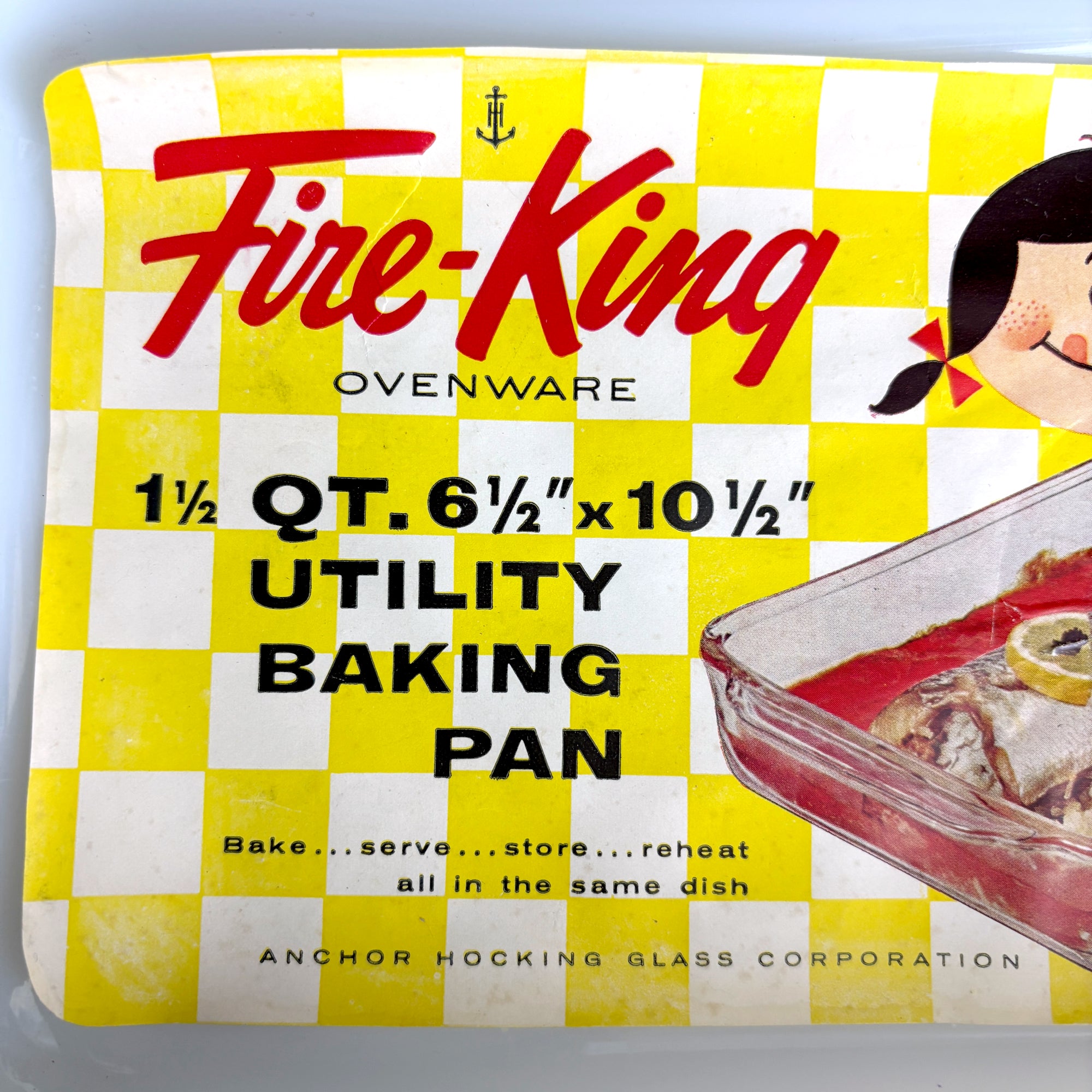 Vintage new old stock Fire King milk glass baking dish still has its original label, complete with fab mid-century graphics, glued on in the center. Rectangular casserole dish has a 1.5-quart capacity. Marked with the Fire King logo on the bottom.