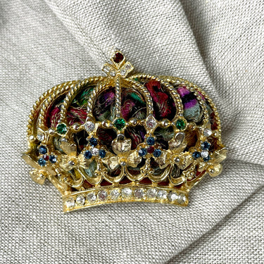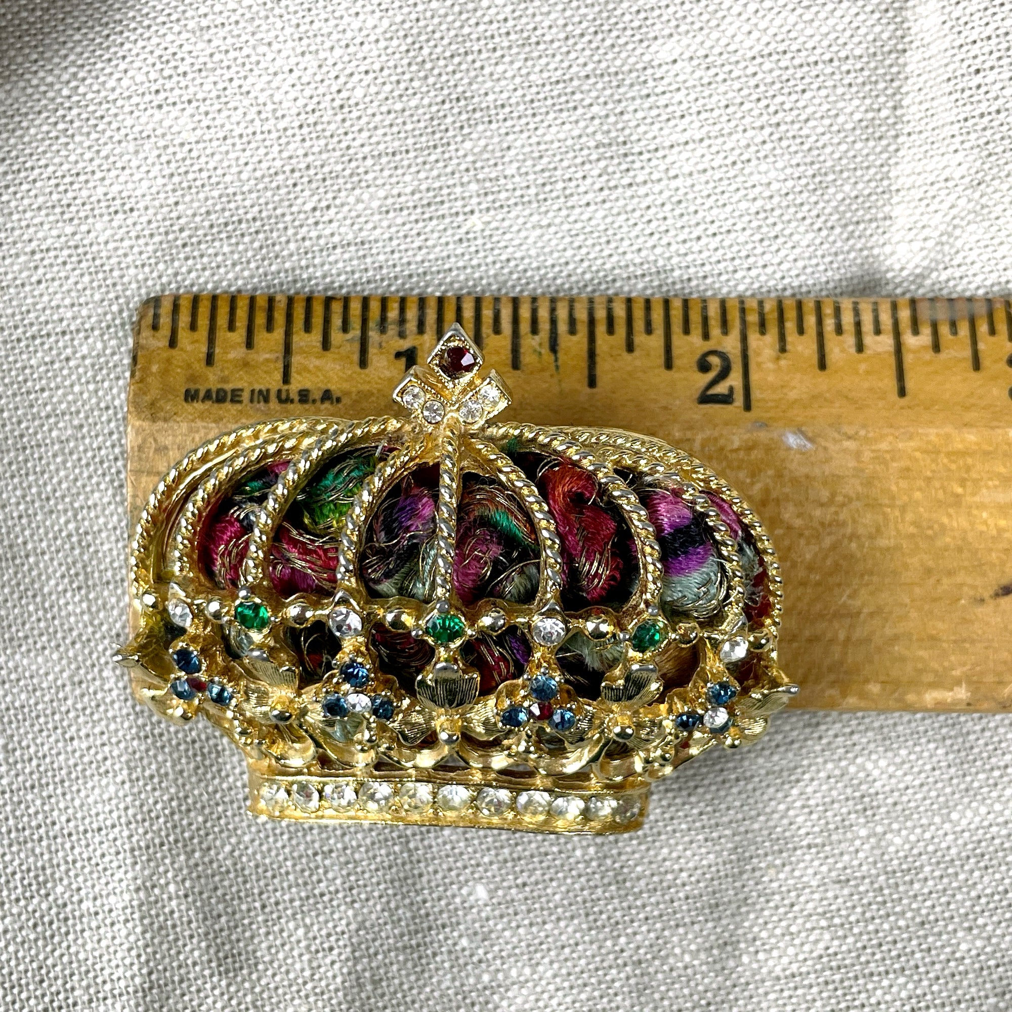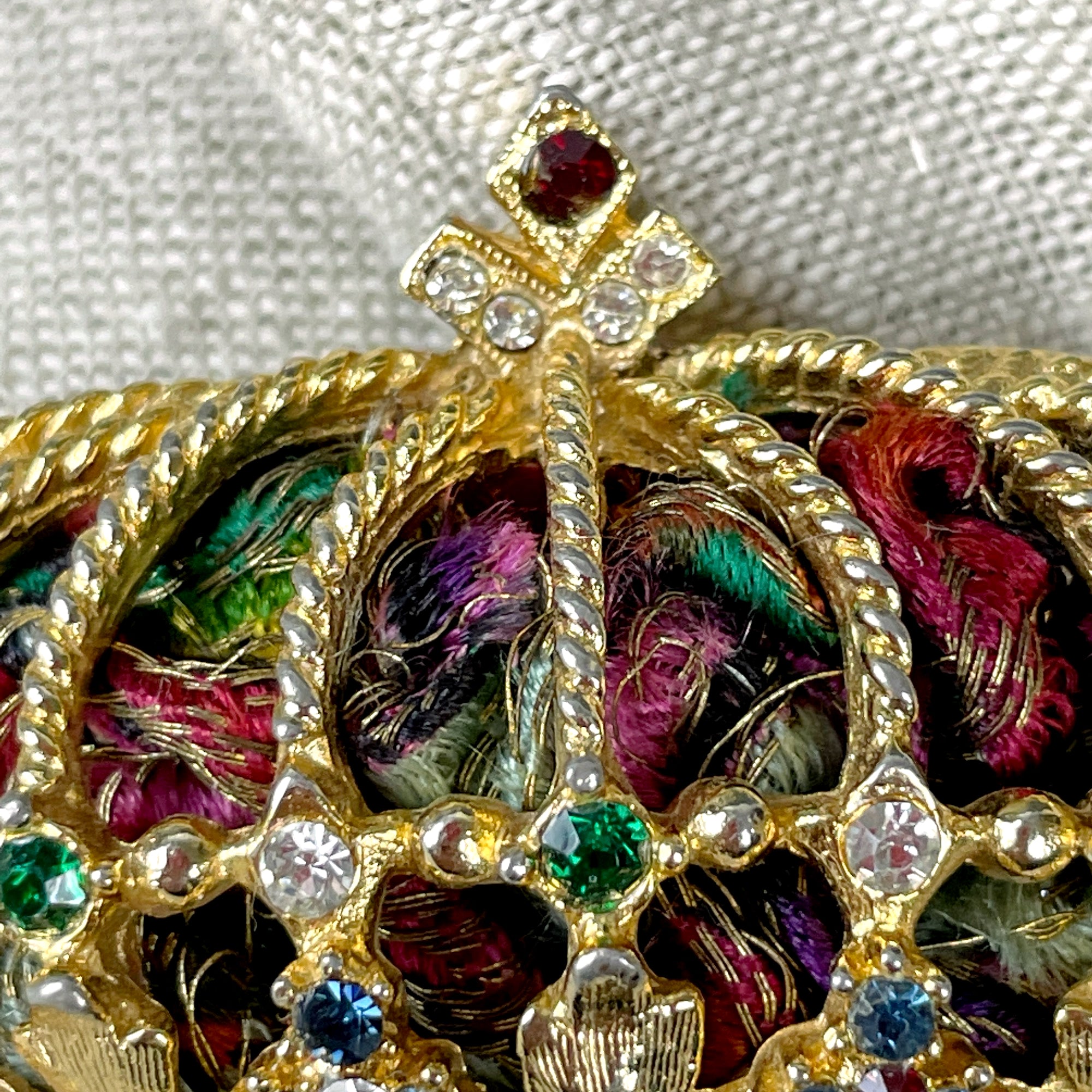 Vintage 1970s original ART royal crown brooch filled with brocade and decorated with colored rhinestones. Unique blend of textile and metal with gold tone metal over a brocade background.