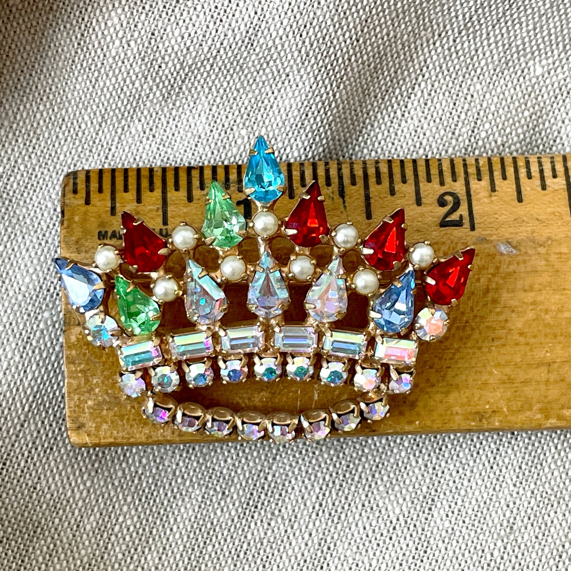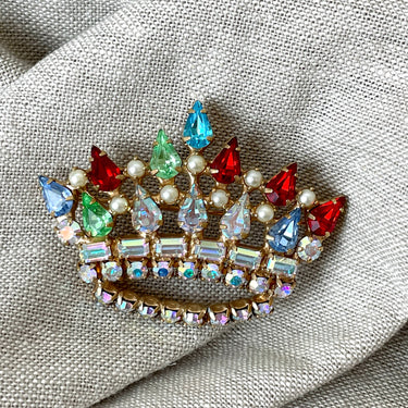 Vintage crown brooch by B. David with mixed color sparkly rhinestones. Gold tone metal. For your queen or for yourself.