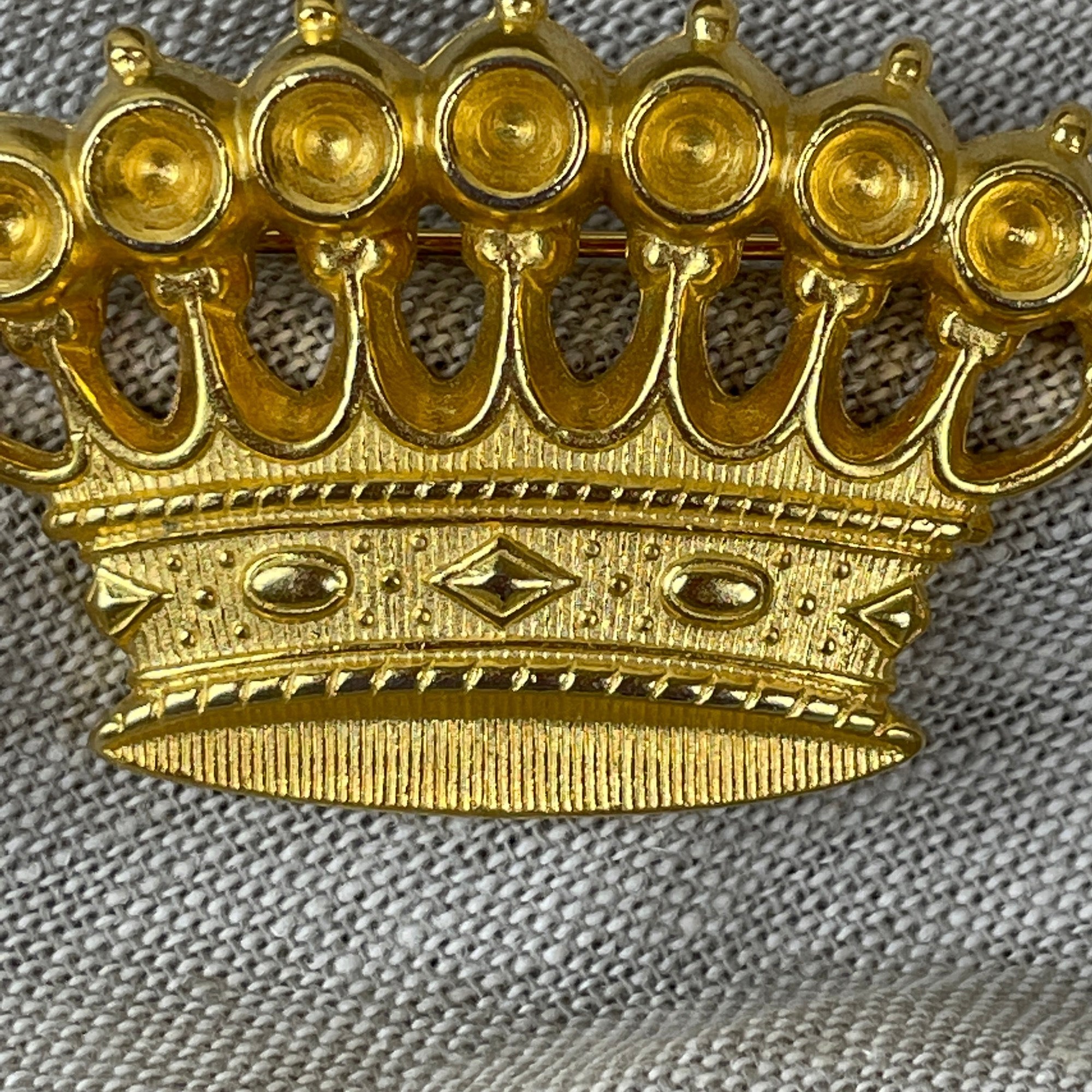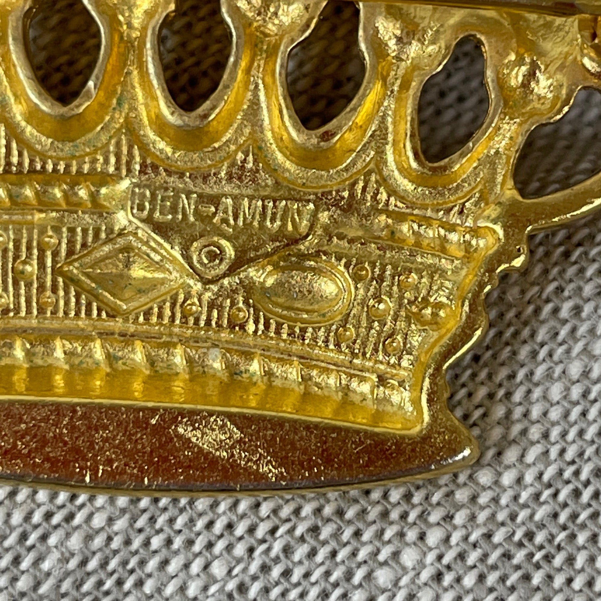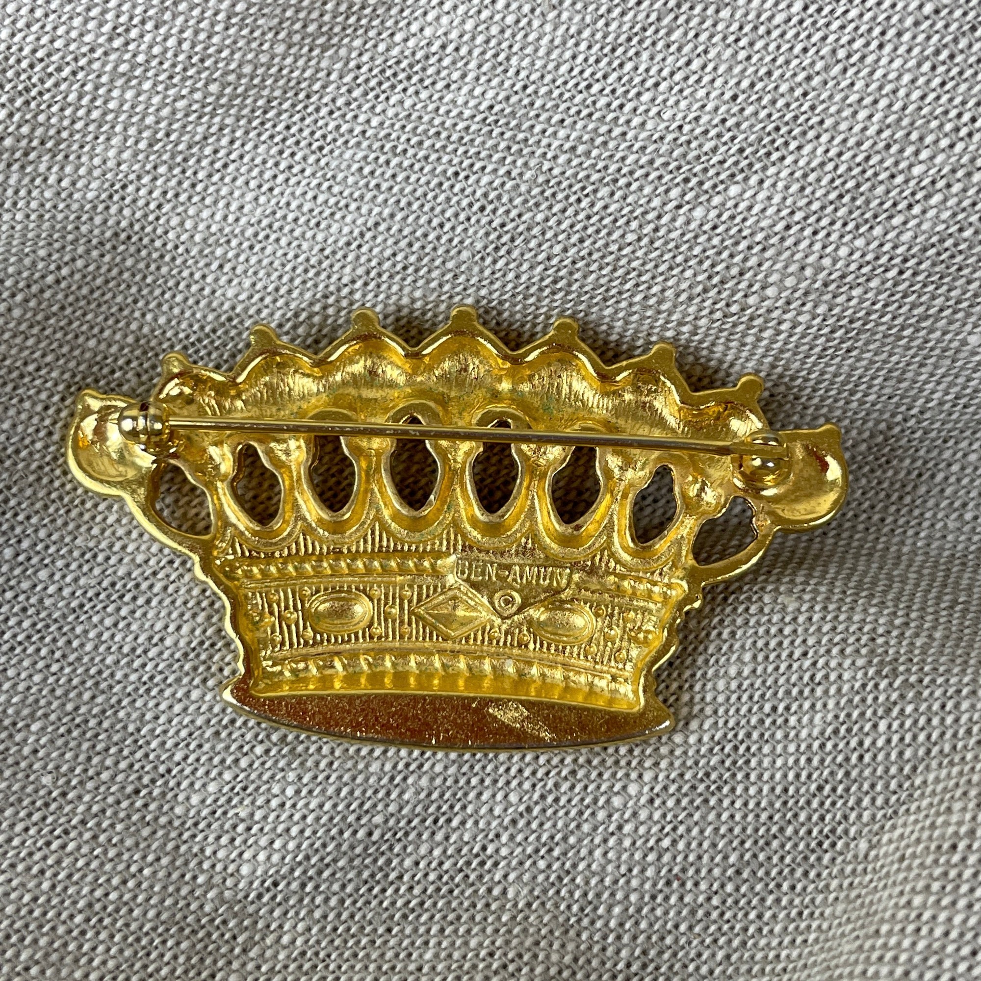 Vintage 1980s gold crown brooch, fine costume jewelry made by Ben Amun of New York.