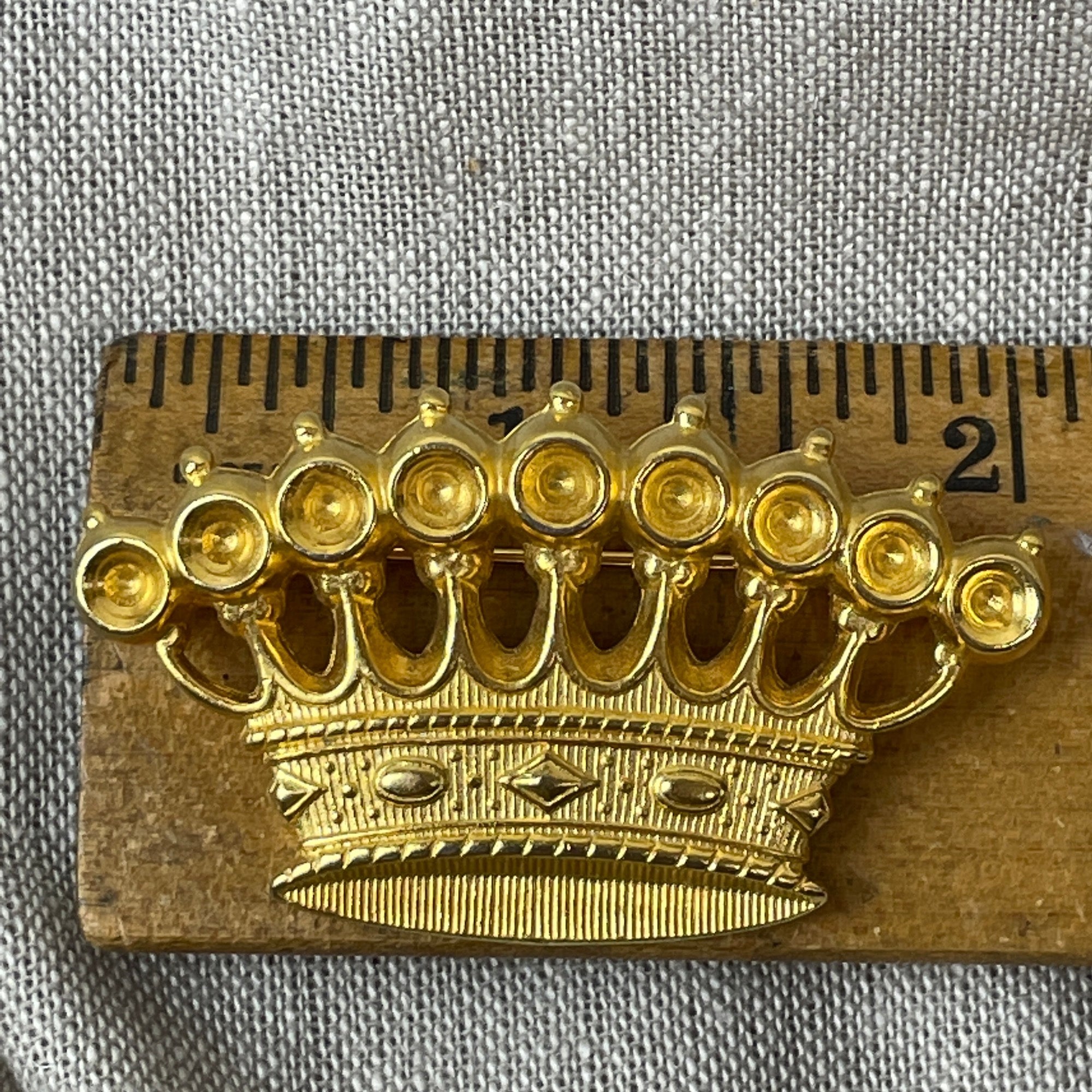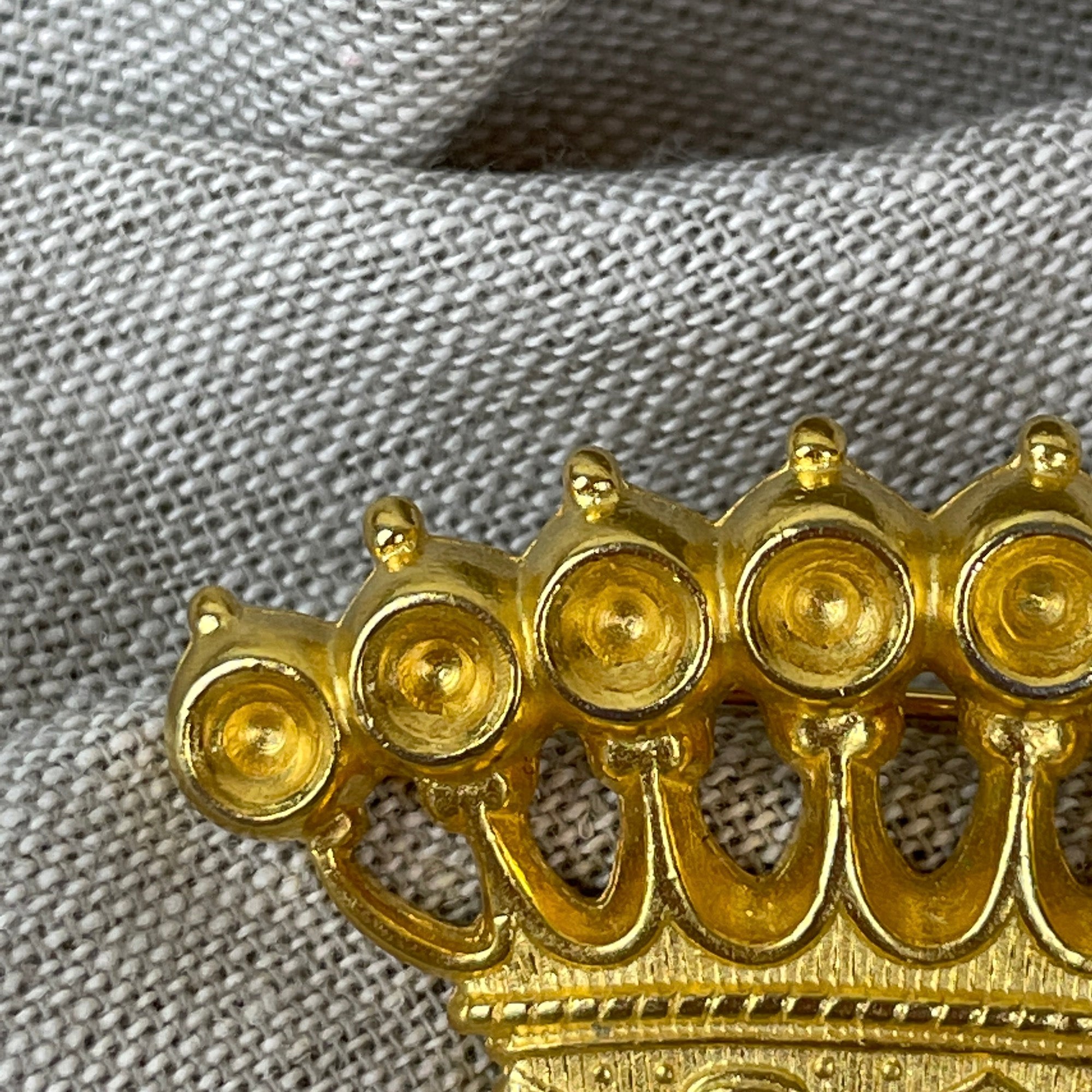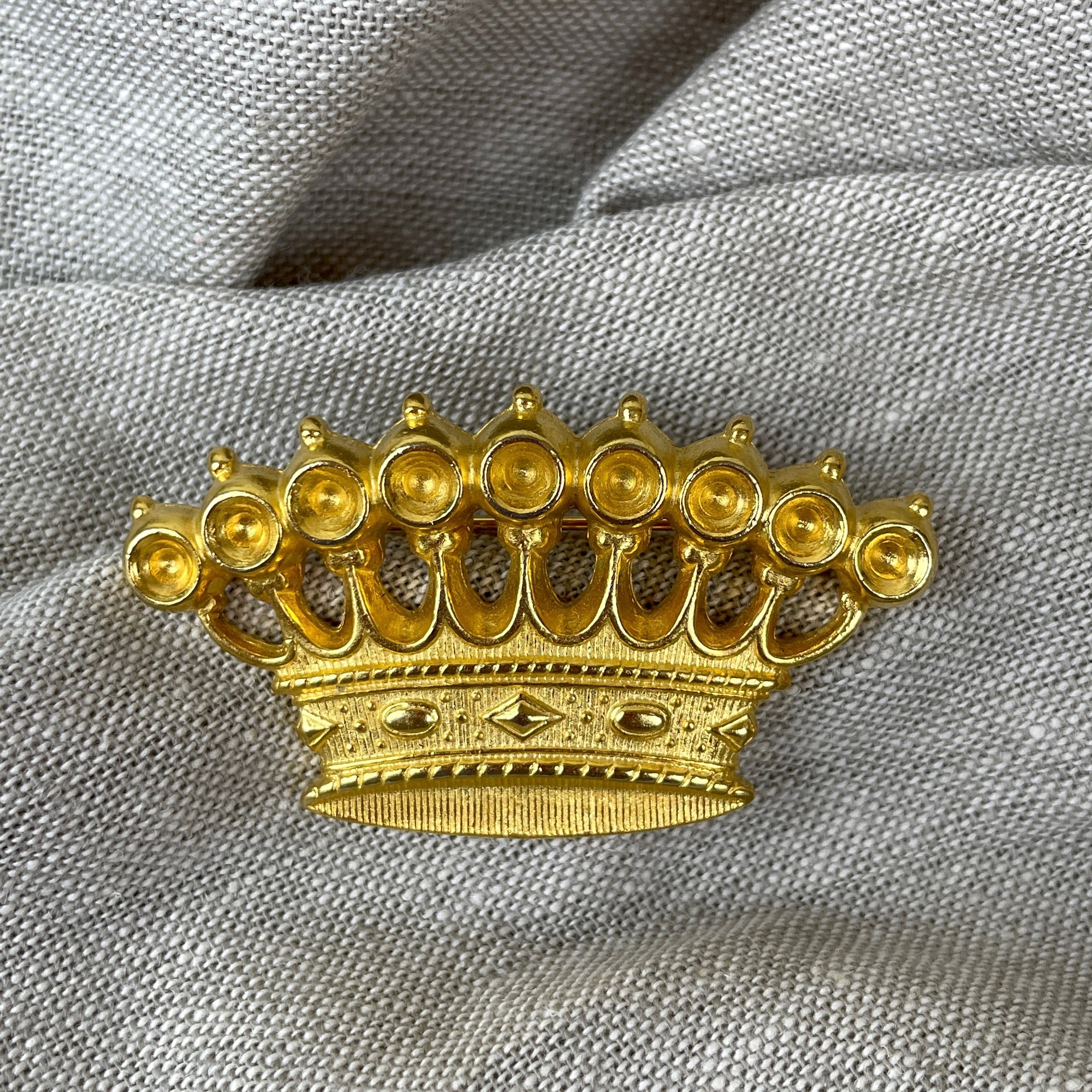 Vintage 1980s gold crown brooch, fine costume jewelry made by Ben Amun of New York.