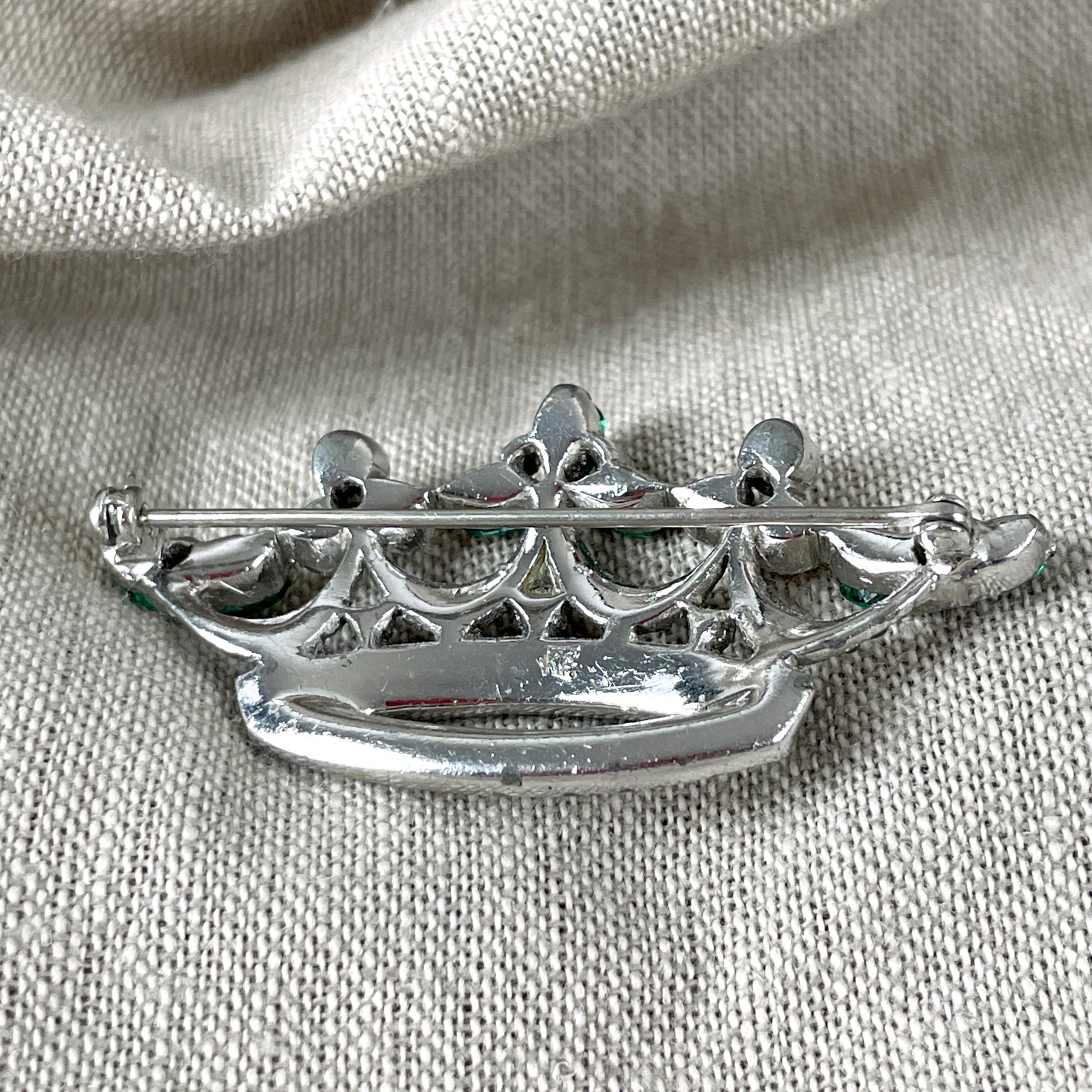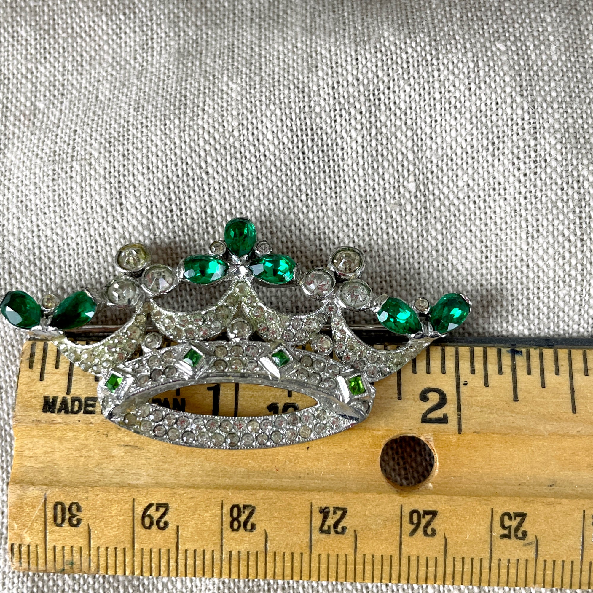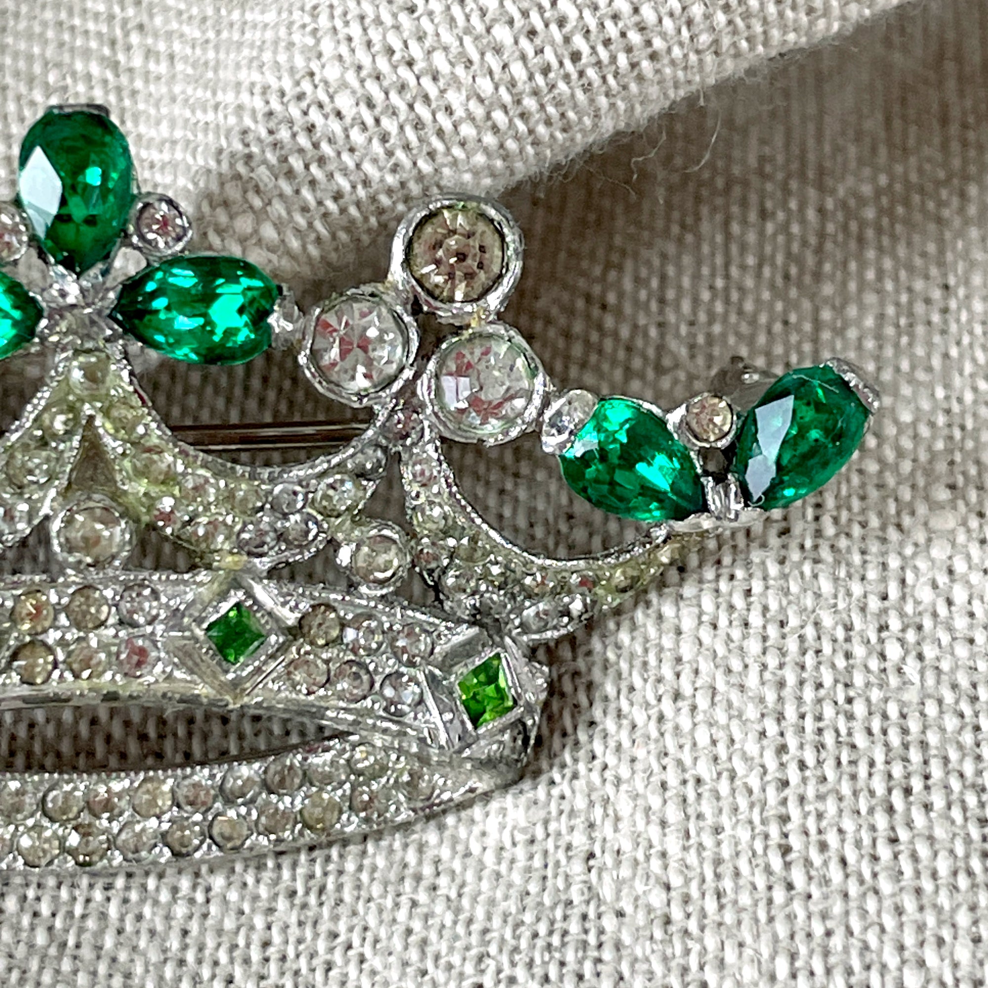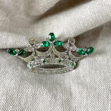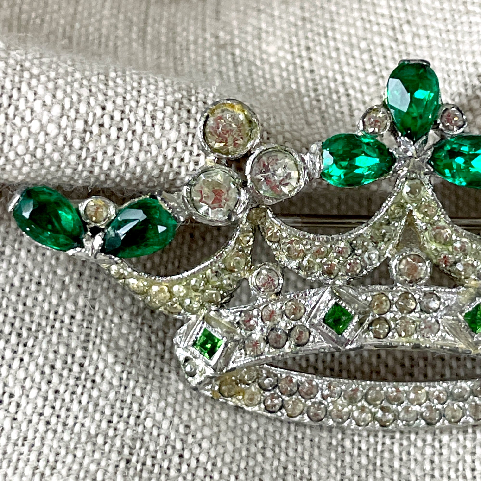 Vintage 1920s or 1930s KTF Trifari crown brooch. Green rhinestones and clear rhinestones with a greenish cast set in silver metal. Marked with KTF on the back.