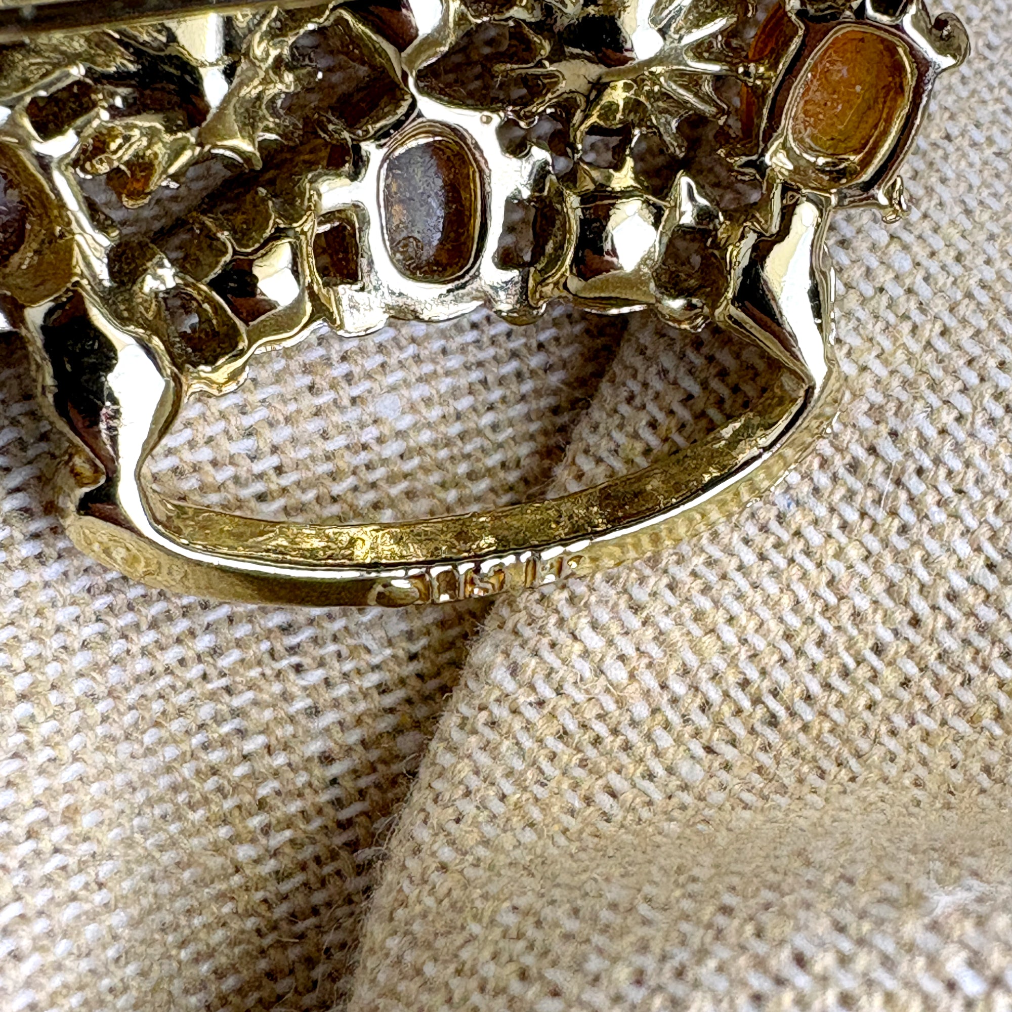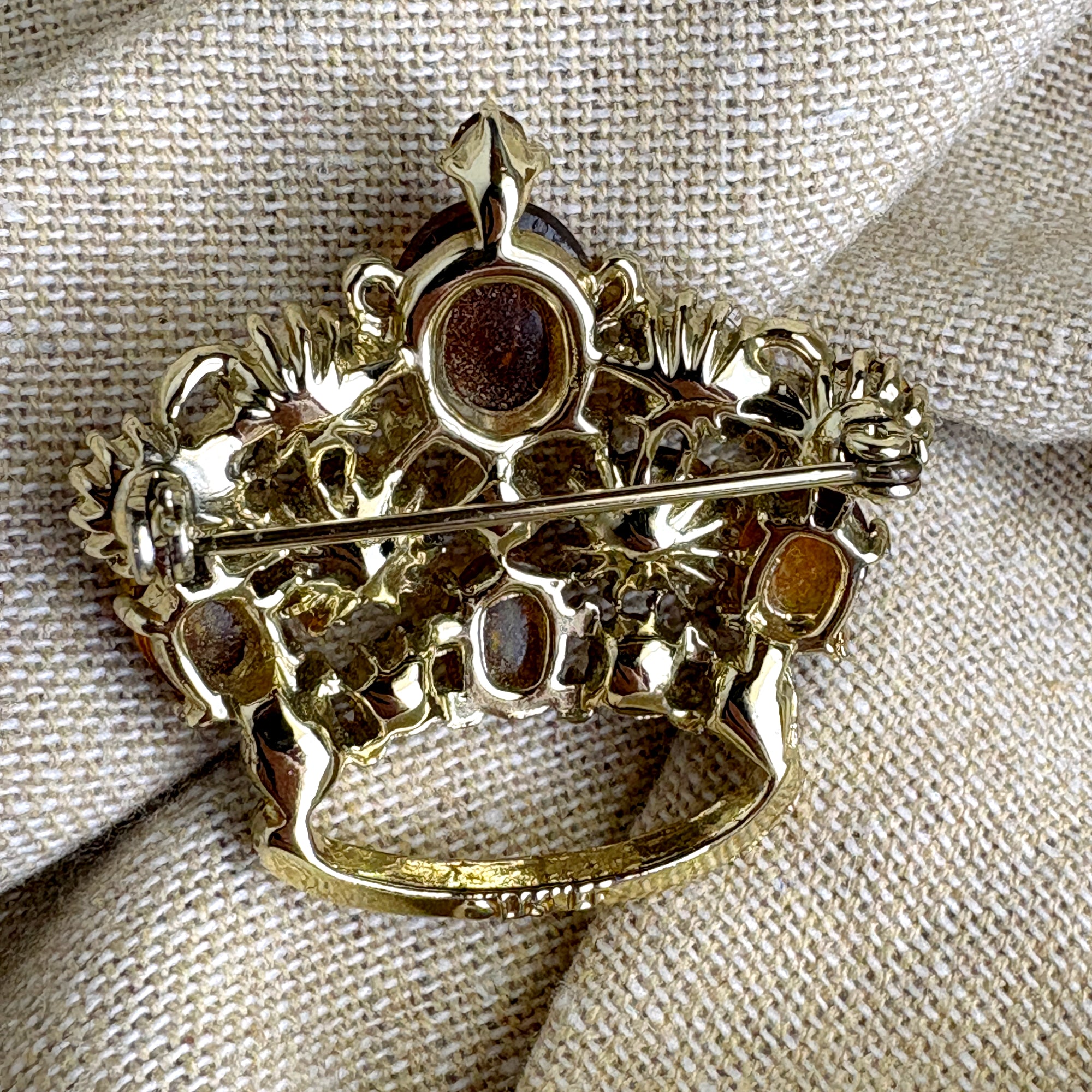 Lisner crown brooch with peach iridescent colored rhinestones in goldtone metal. Fine vintage costume jewelry.