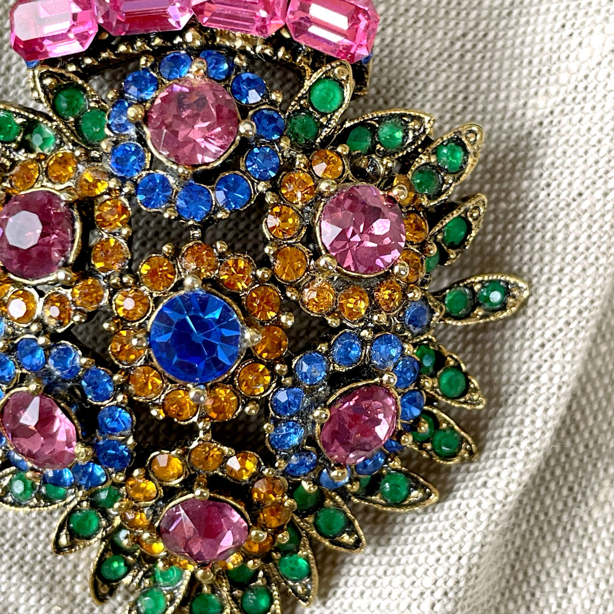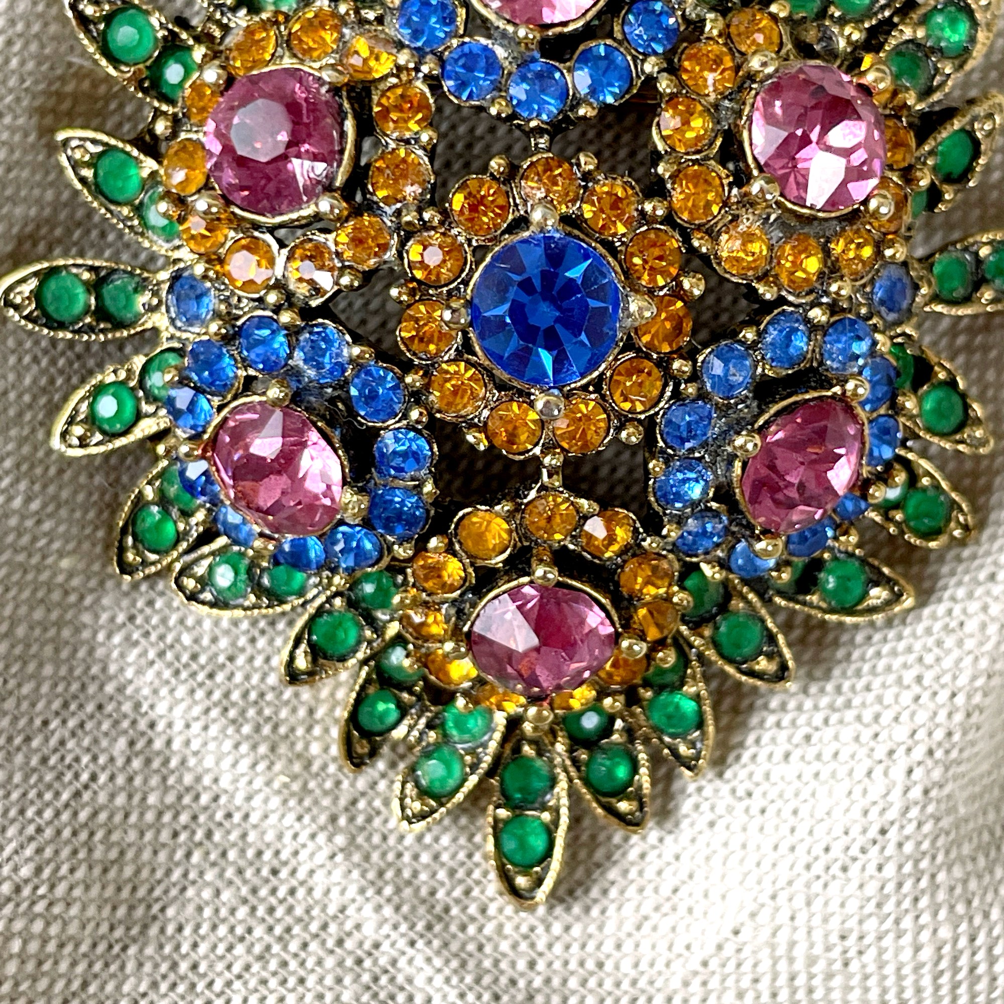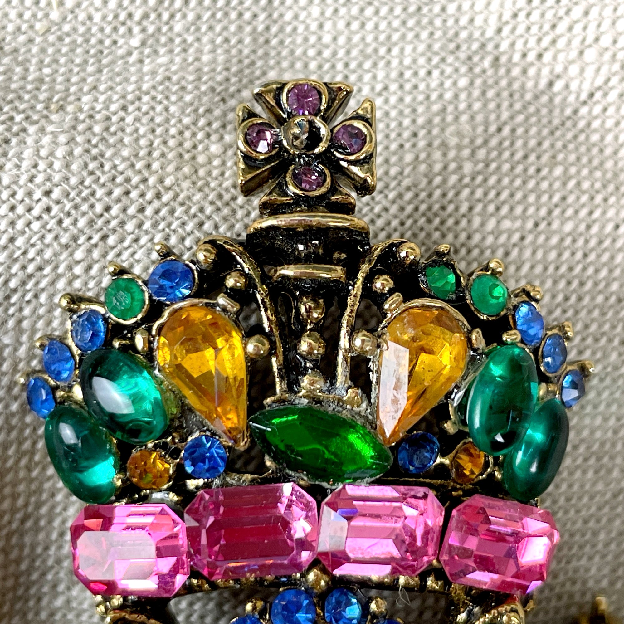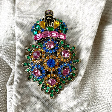 Oversized multi colored pavé rhinestones royal crest and crown brooch R. Serbin. Gold tone metal with pink, blue, green and gold rhinestones.
