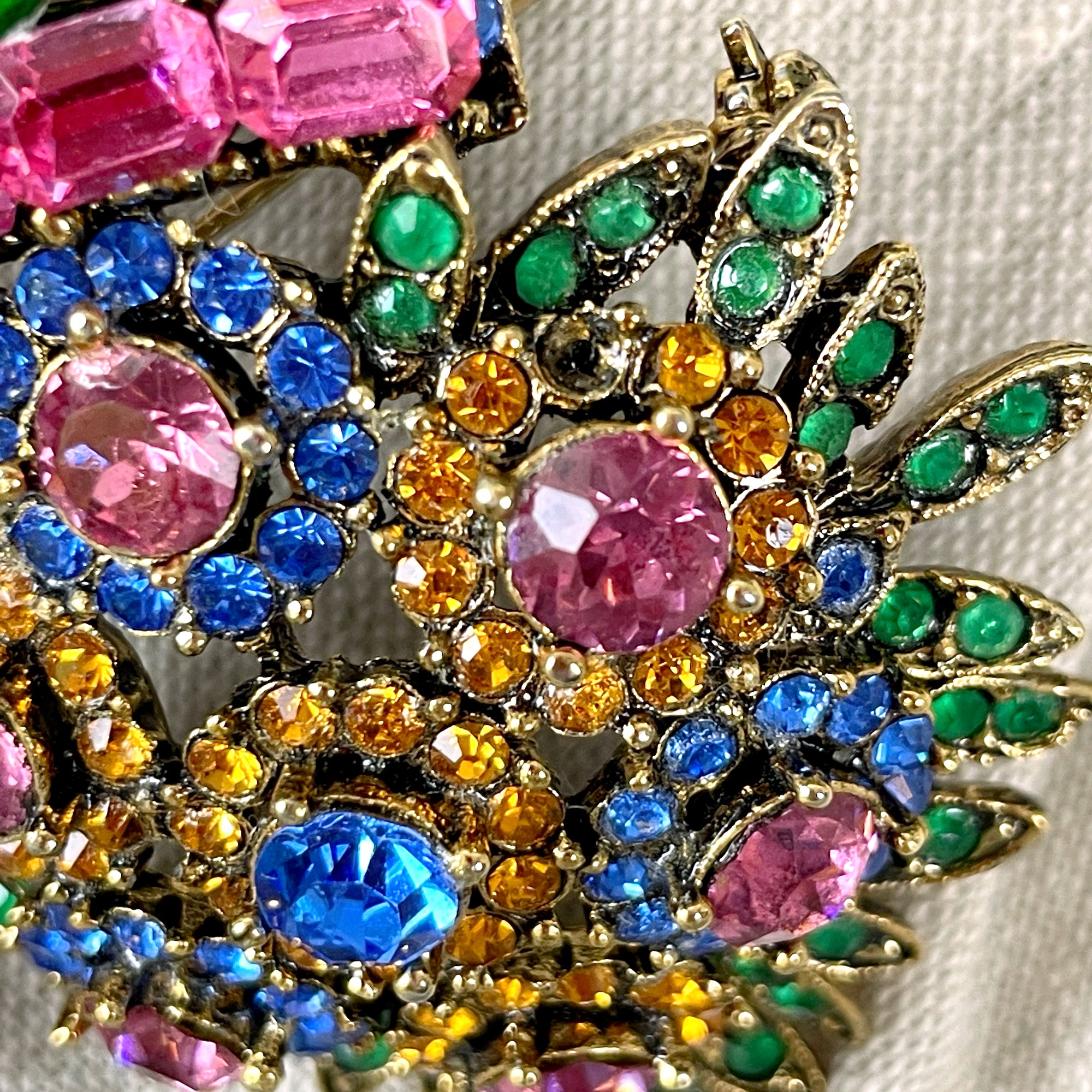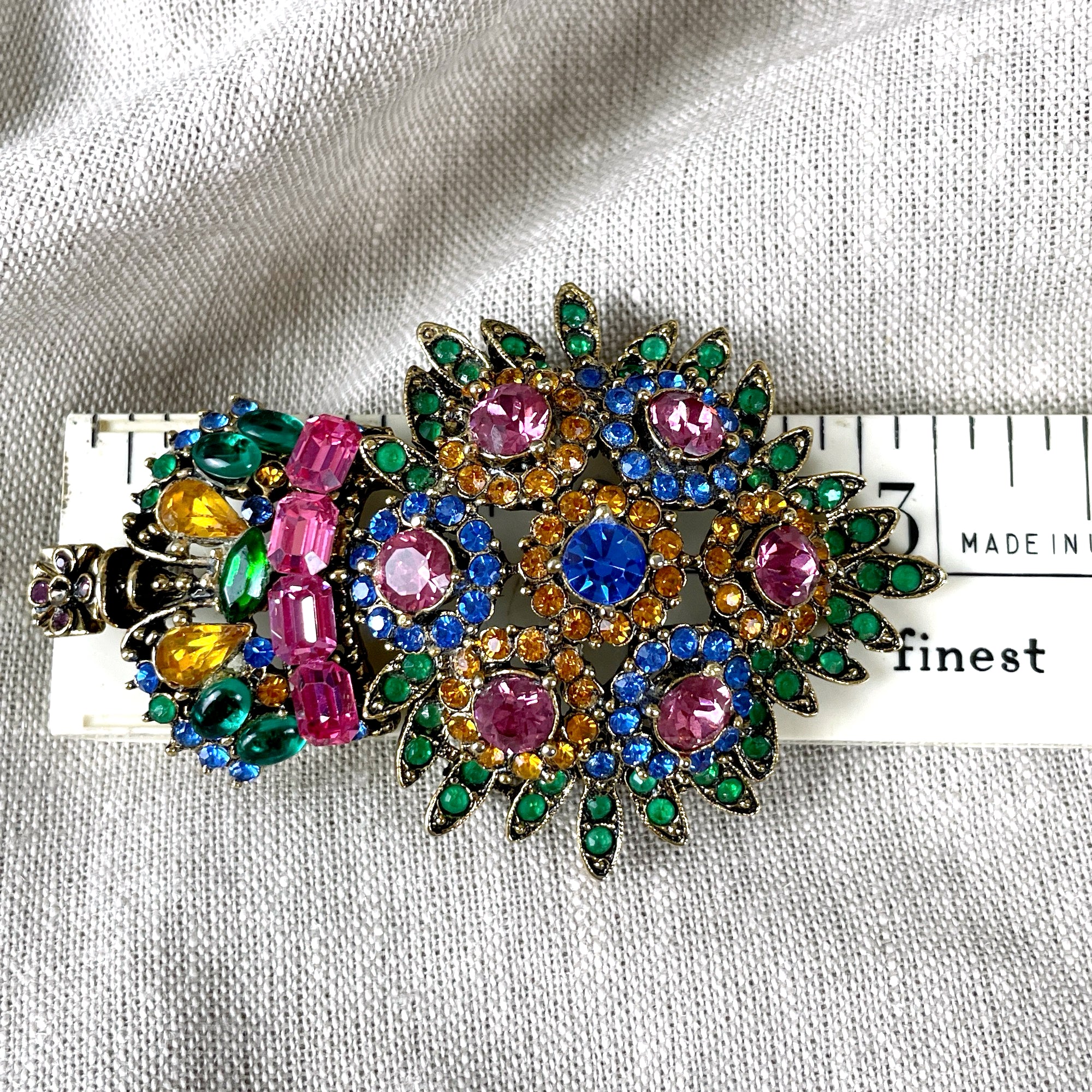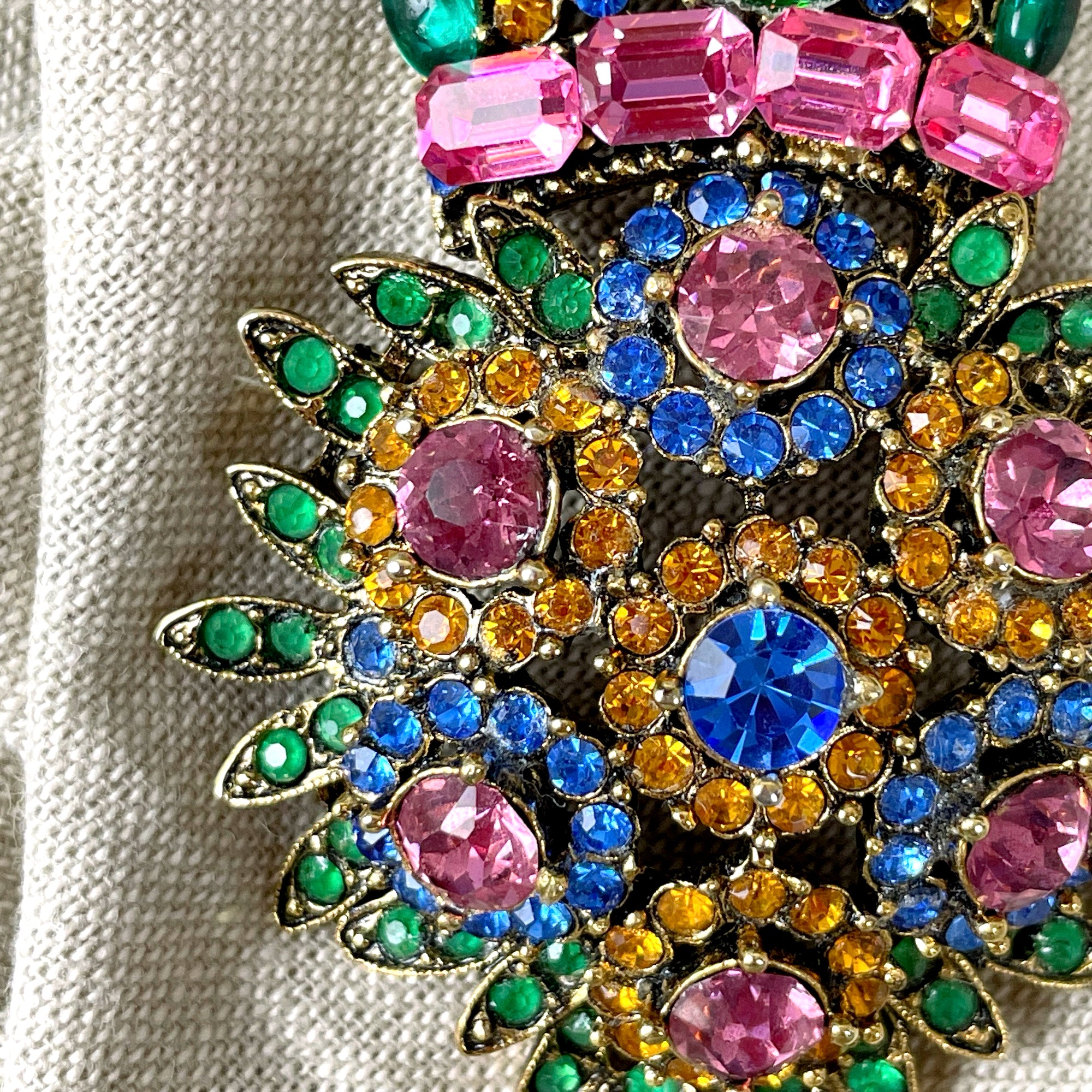 Oversized multi colored pavé rhinestones royal crest and crown brooch R. Serbin. Gold tone metal with pink, blue, green and gold rhinestones.