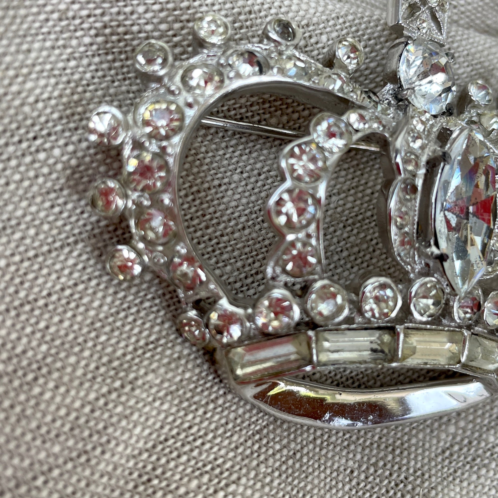 Original and rare oversized crown brooch with clear rhinestones set in Sterling by Coco.