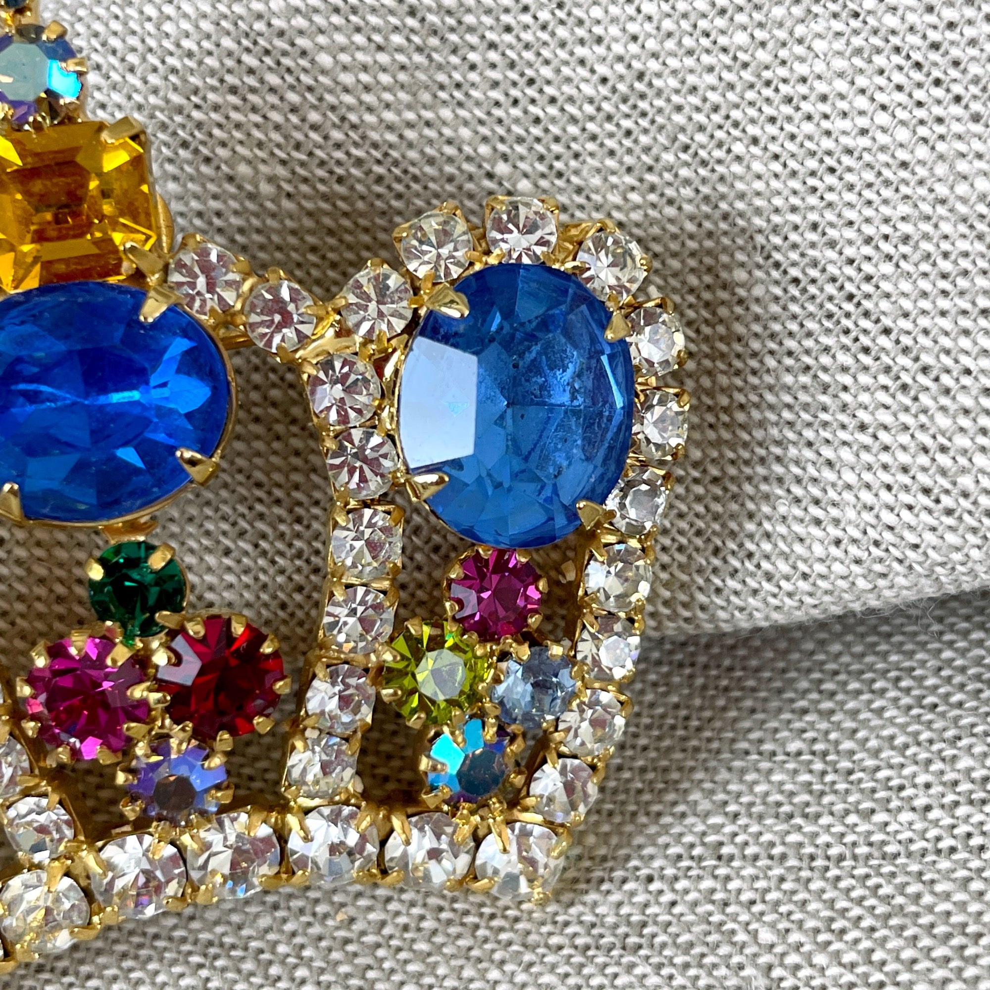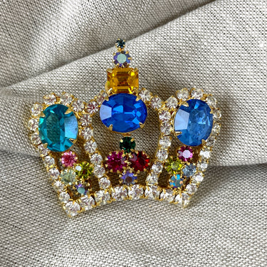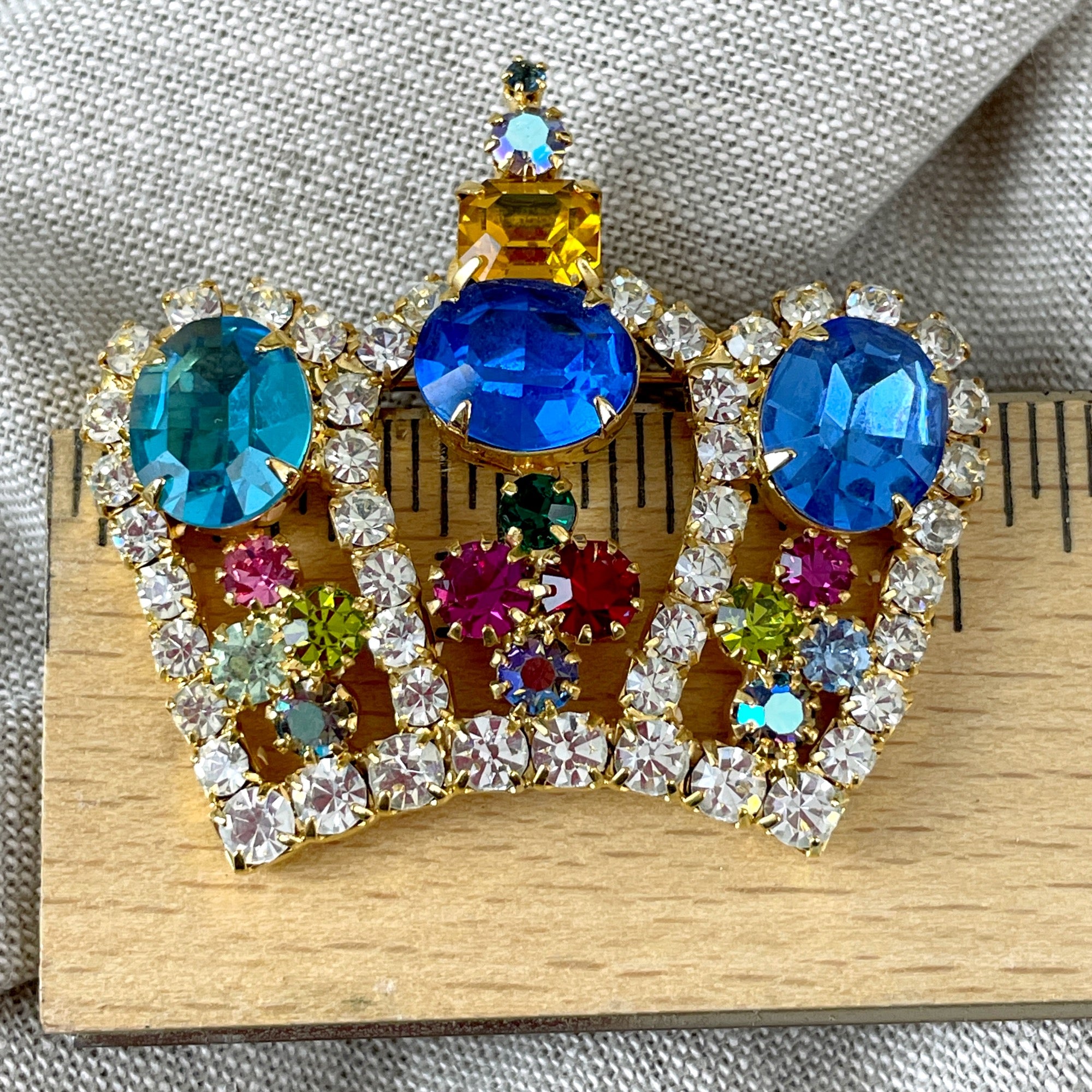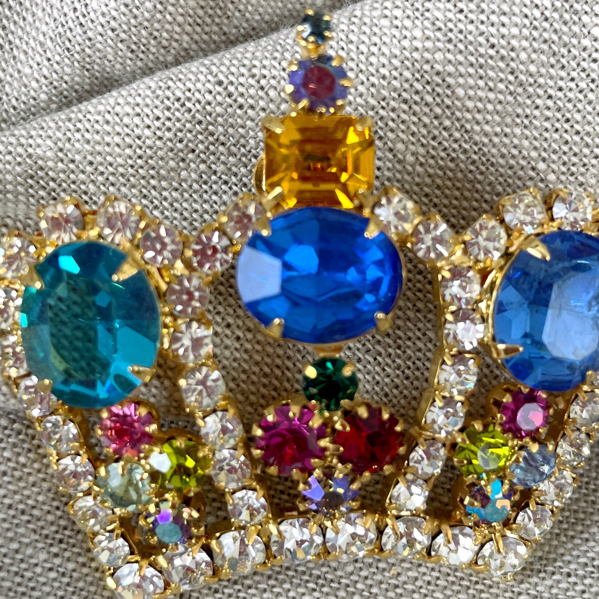 Siluane multi color rhinestone crown brooch - 1990s vintage