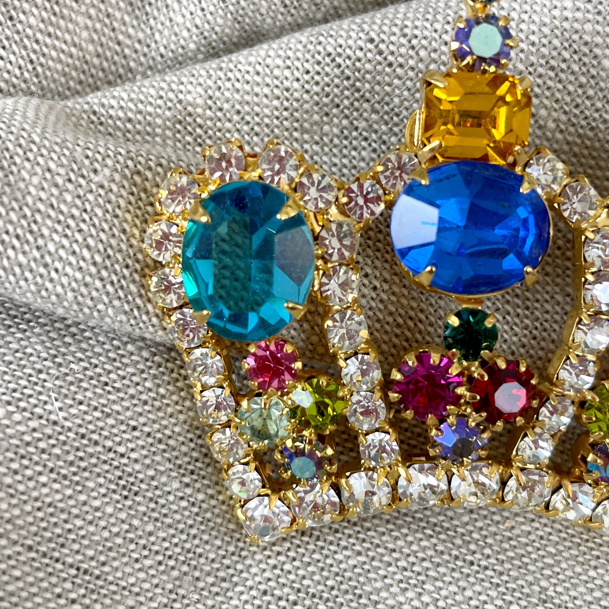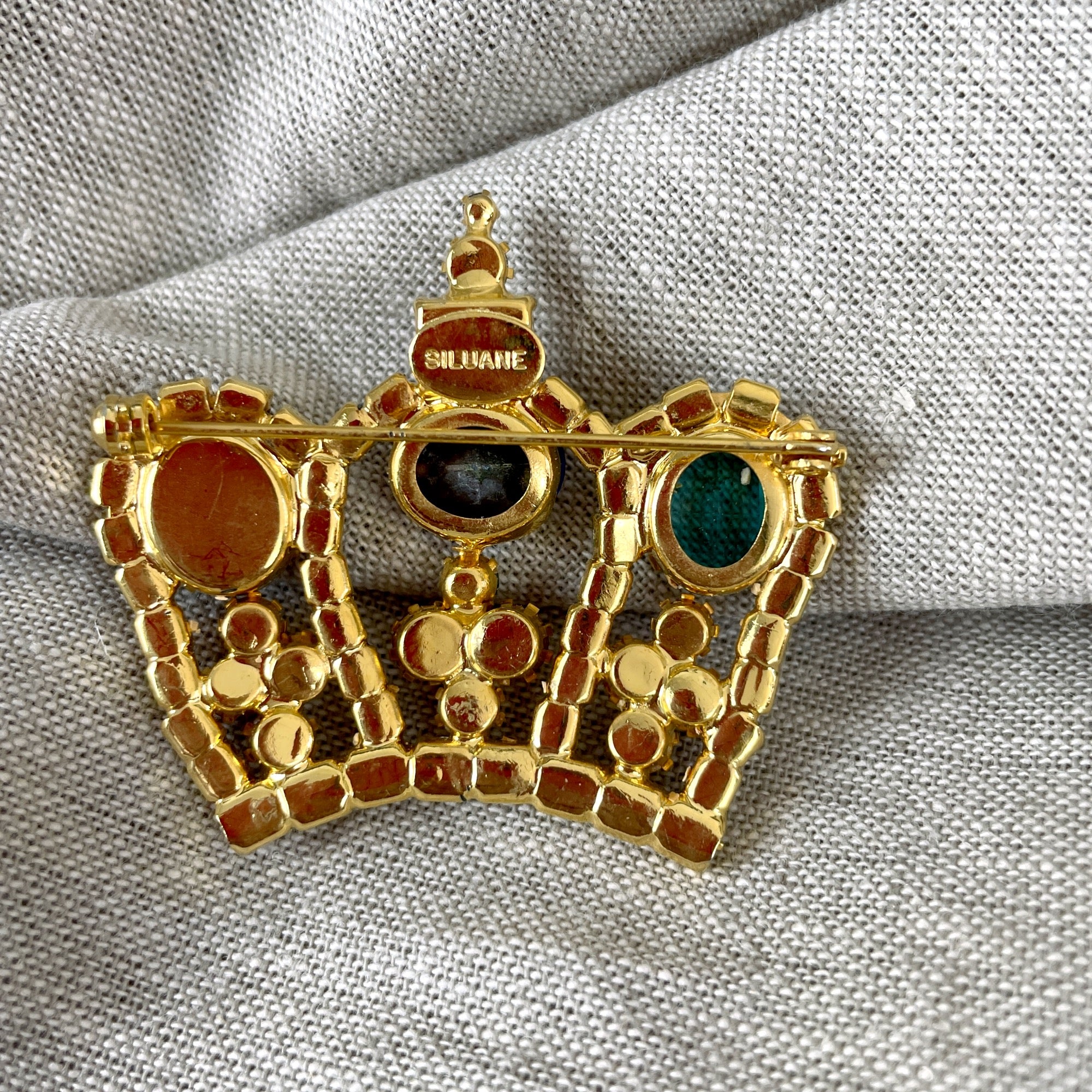 Vintage 1990s sparkly royal crown brooch from Siluane. Clear and colored rhinestones are set in gold tone metal.