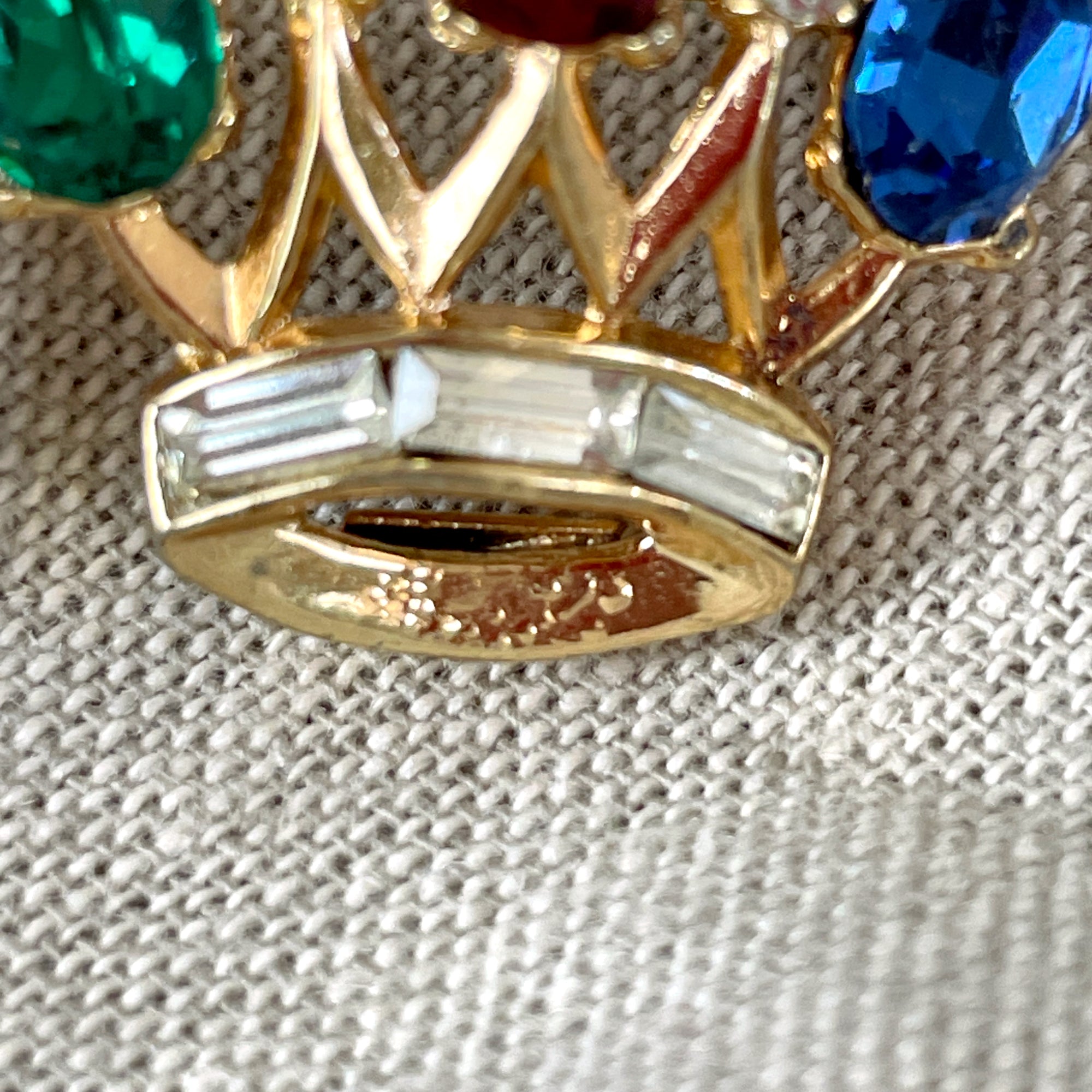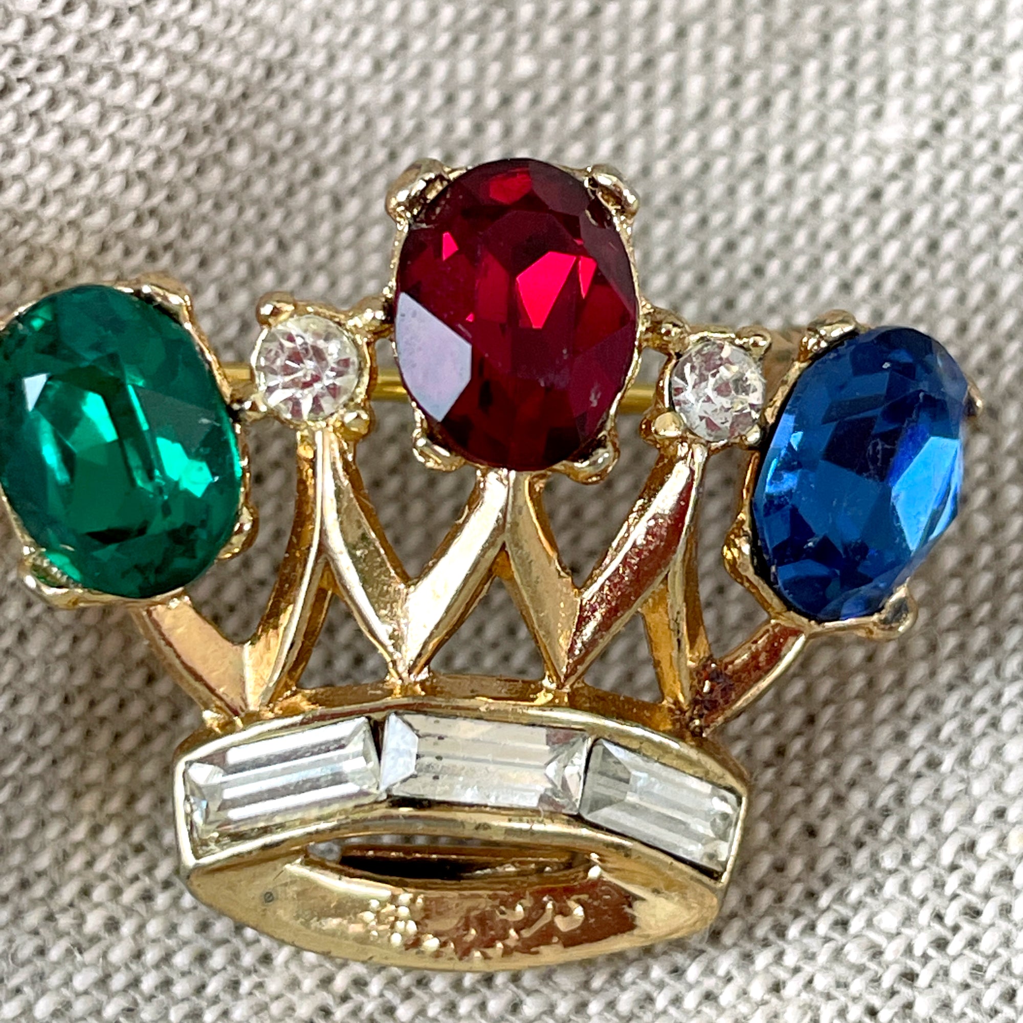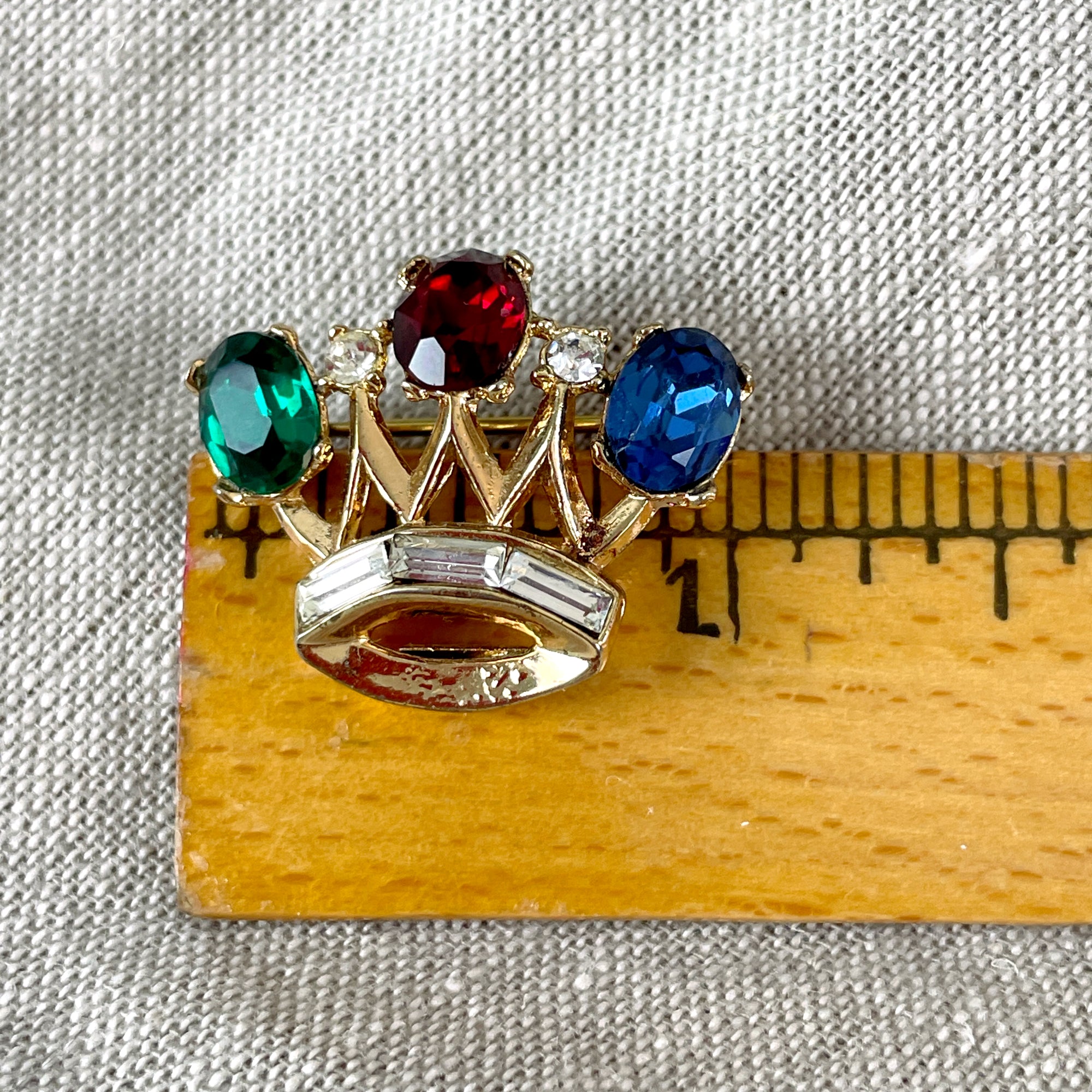 Small Trifari small royal crown brooch with mixed color pave crystals from the 1930s.