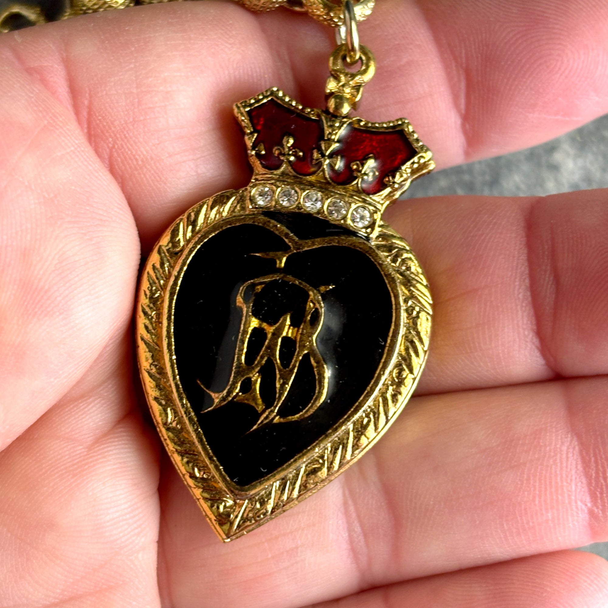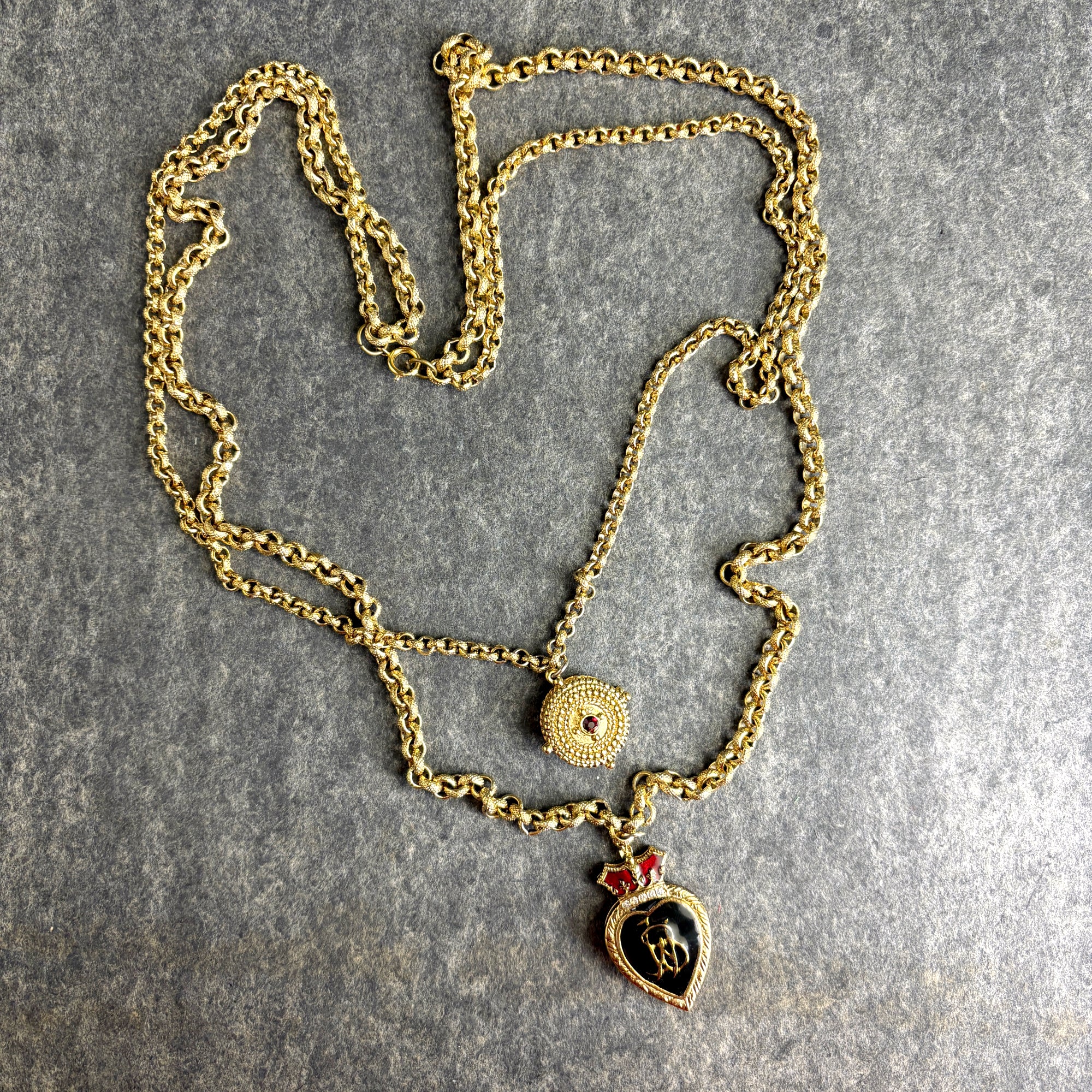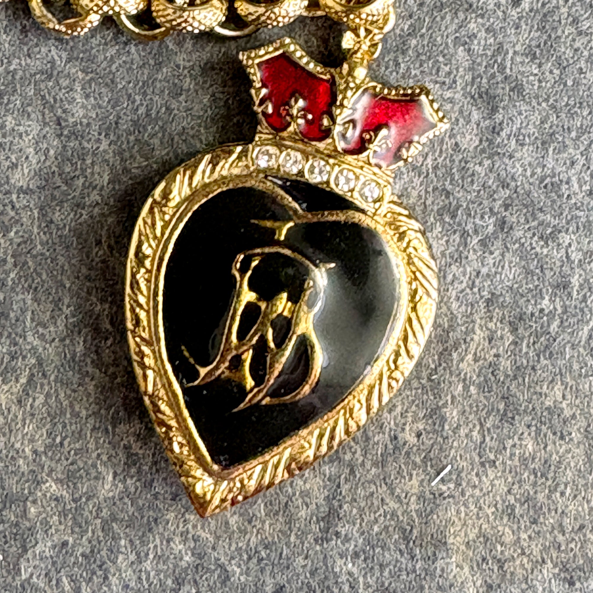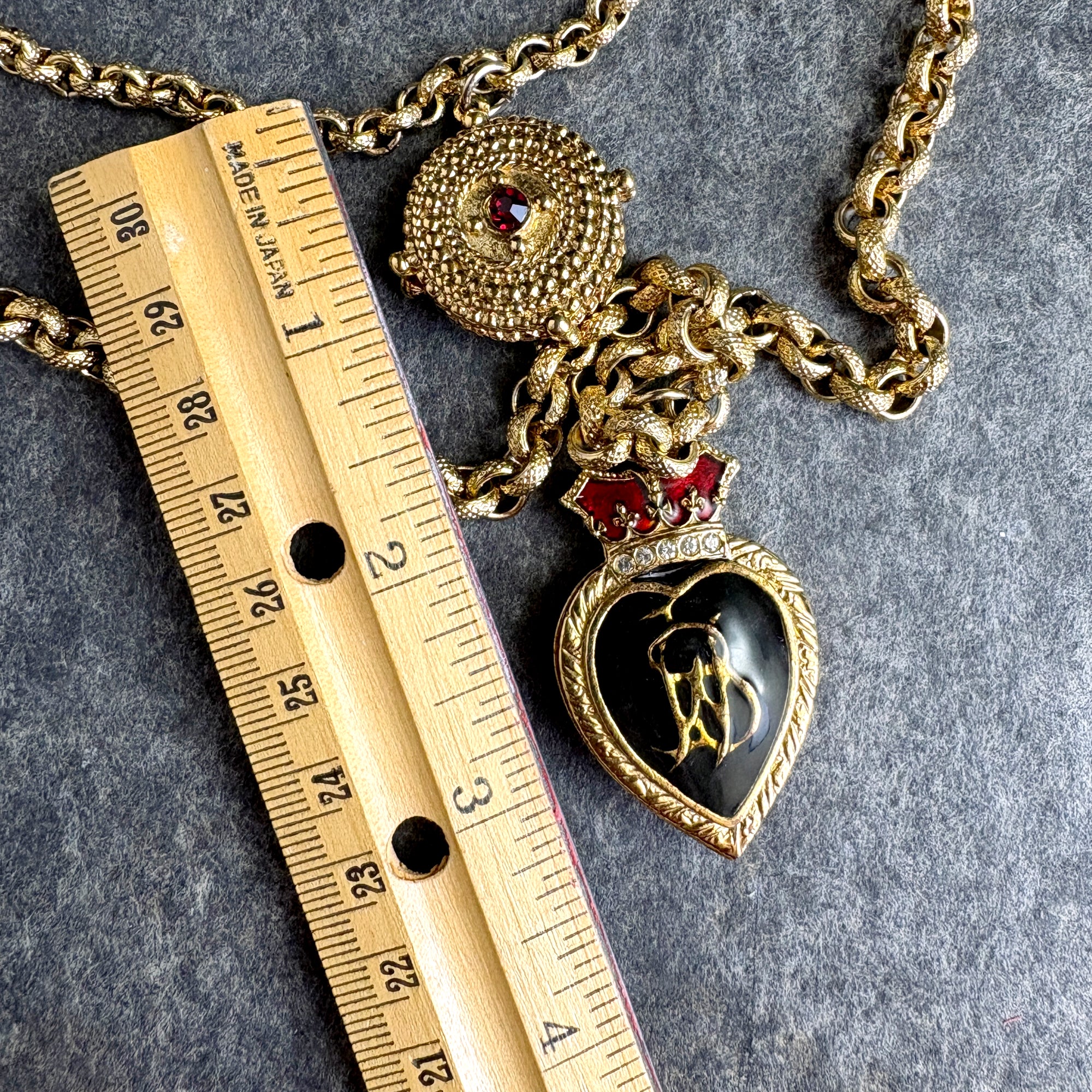 Vintage 1980s chunky double chain gold toned necklace with a pendant hanging from each. Large enamel or resin double-sided pendant of a black heart with a BW monogram, topped with a ruby crown, separated by a row of clear crystal rhinestones. Round double sided pendant with a ruby red rhinestone.
