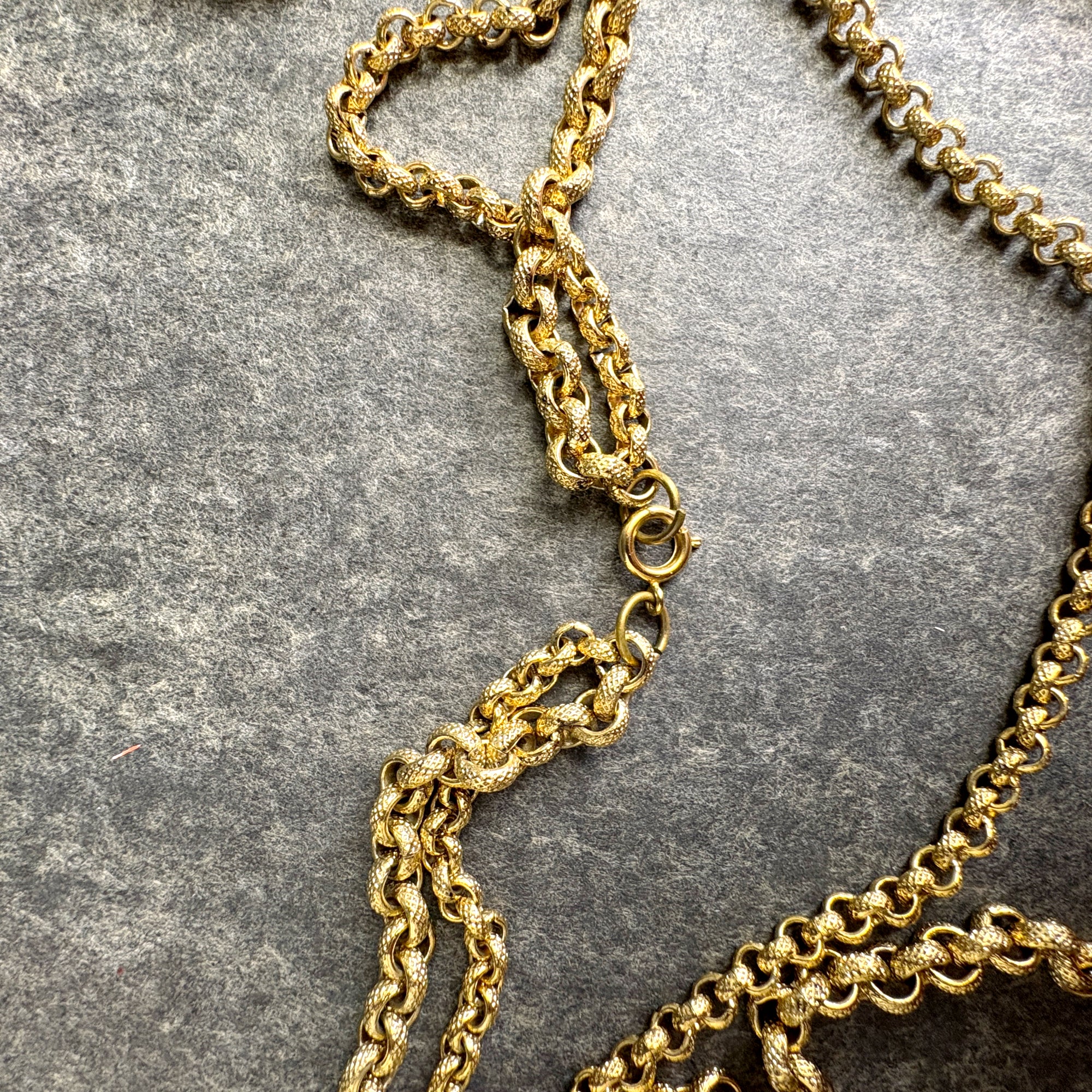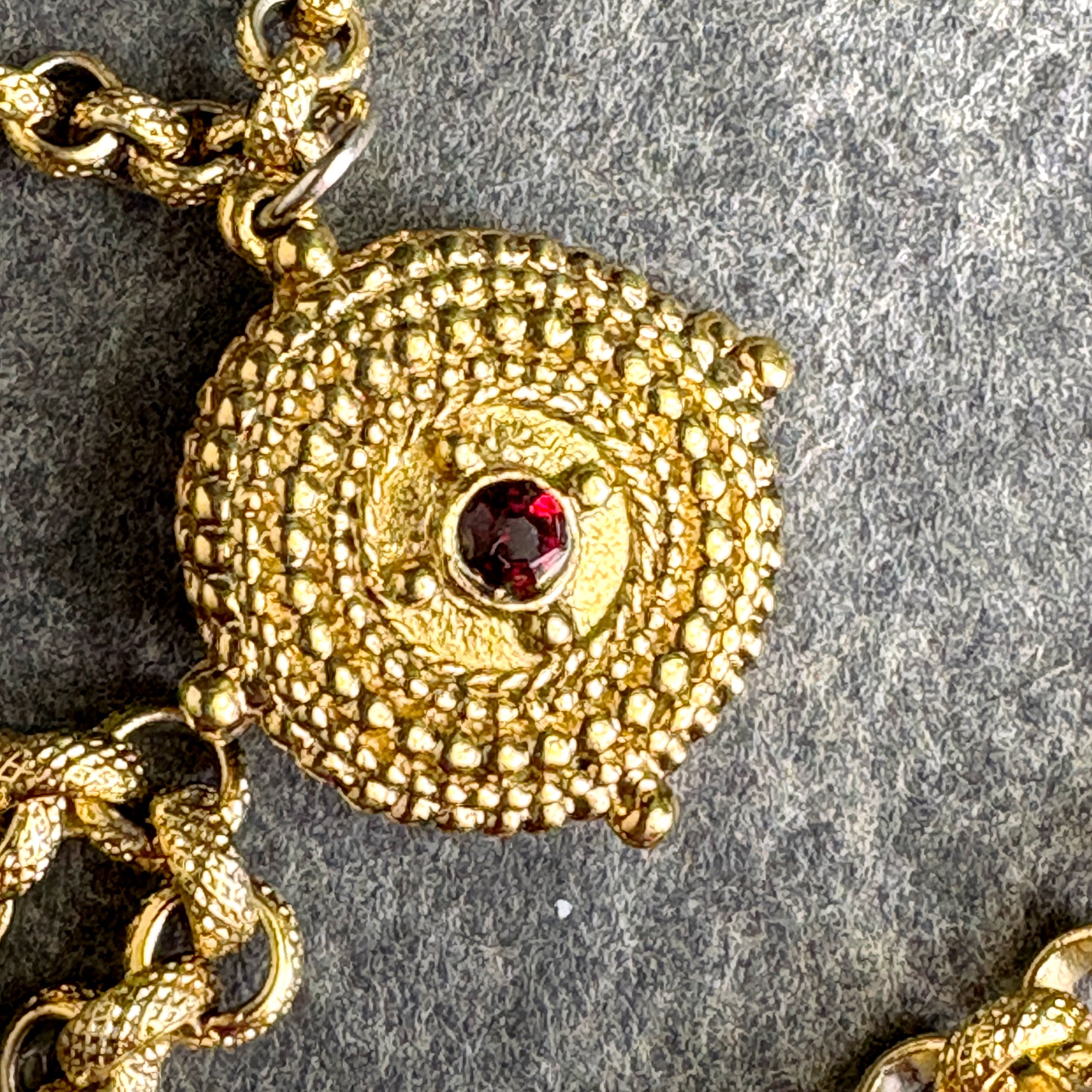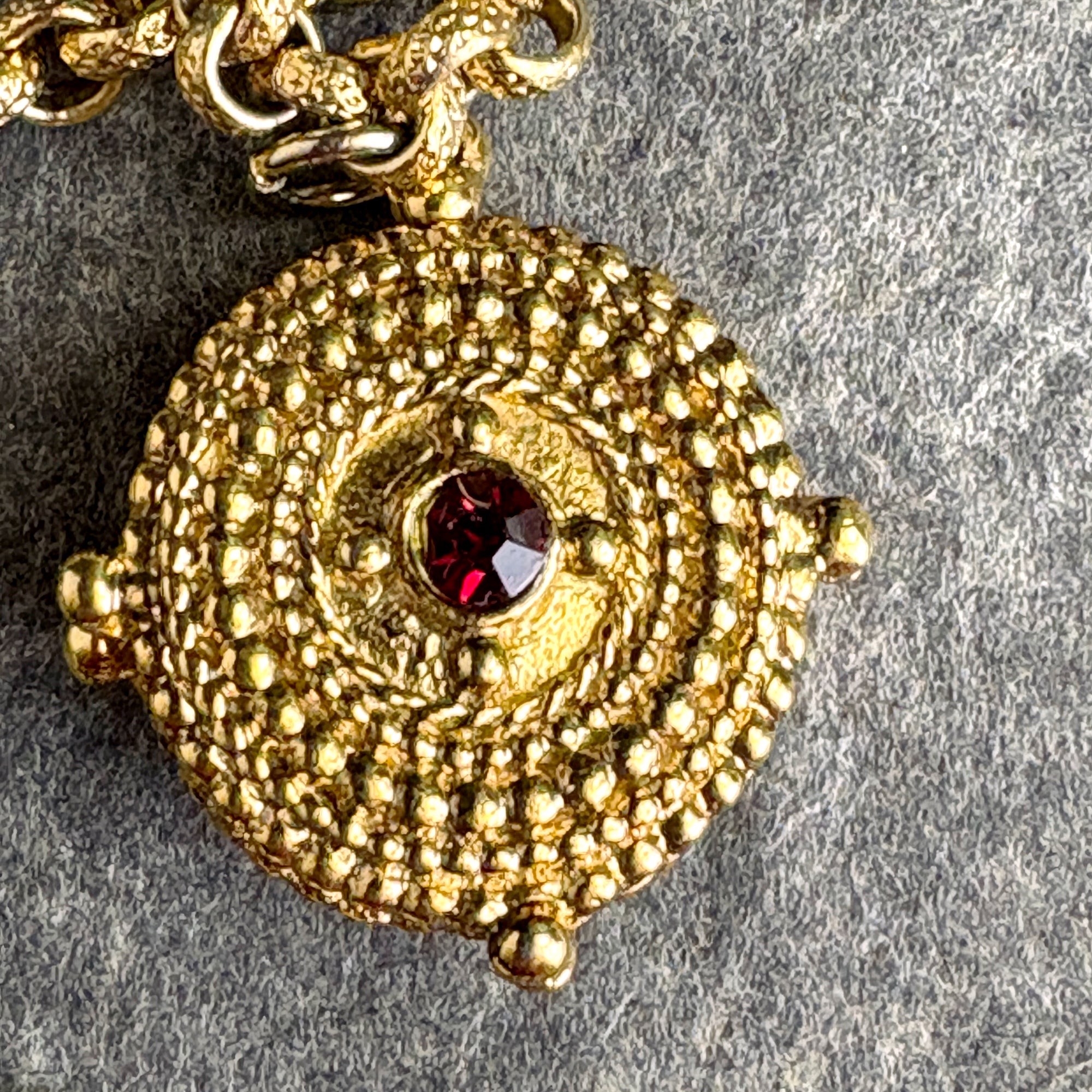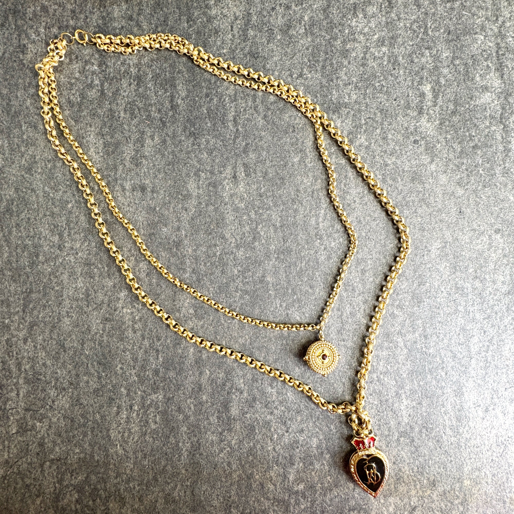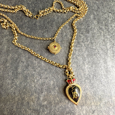 Vintage 1980s chunky double chain gold toned necklace with a pendant hanging from each. Large enamel or resin double-sided pendant of a black heart with a BW monogram, topped with a ruby crown, separated by a row of clear crystal rhinestones. Round double sided pendant with a ruby red rhinestone.