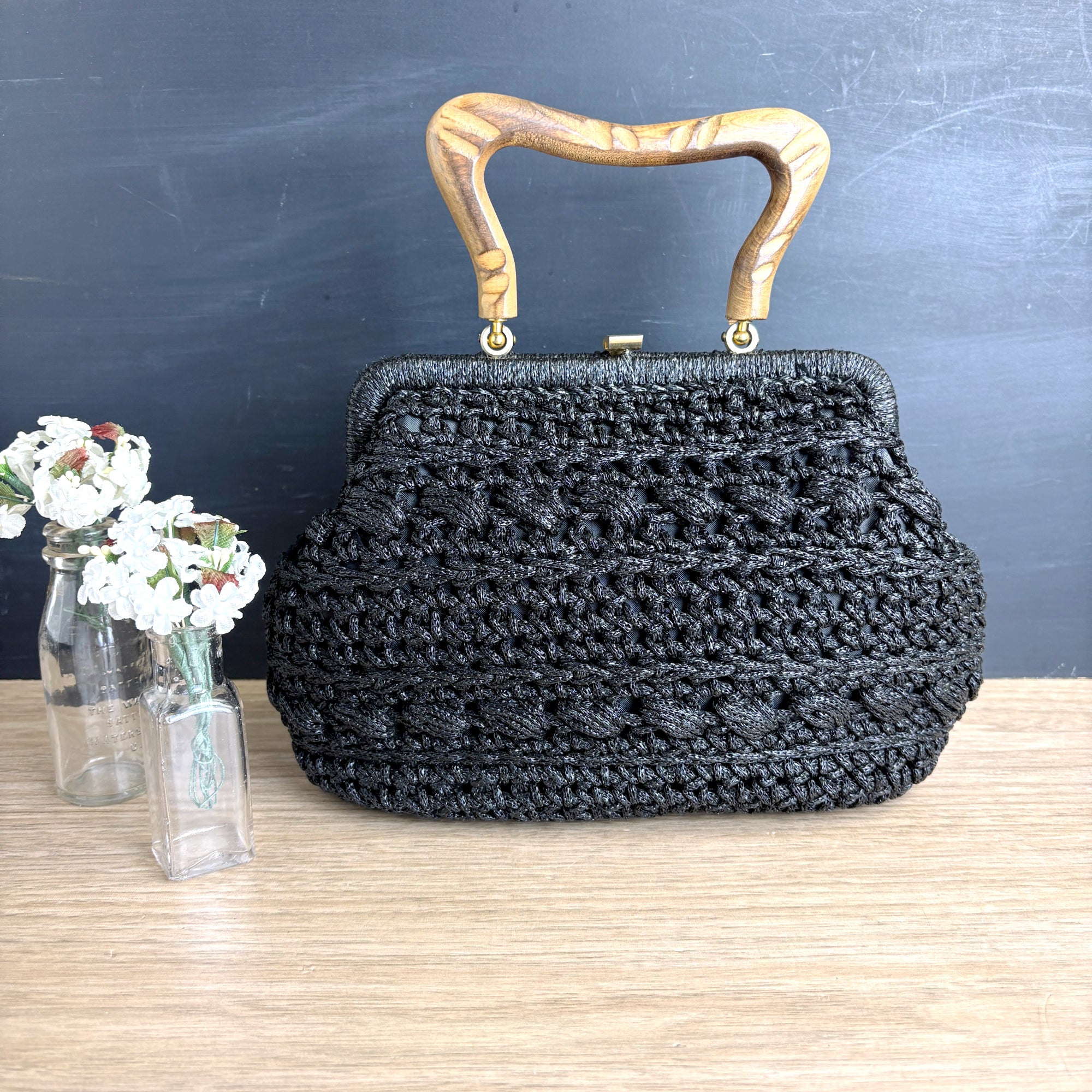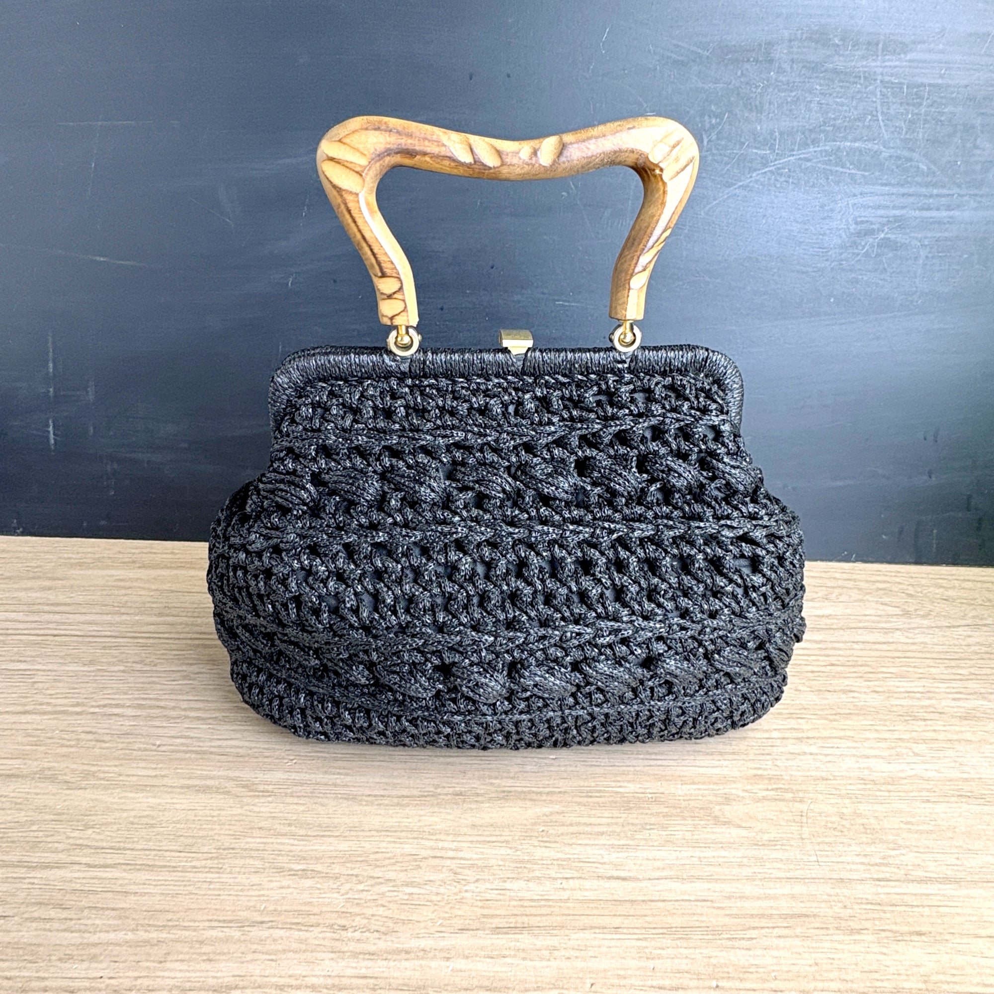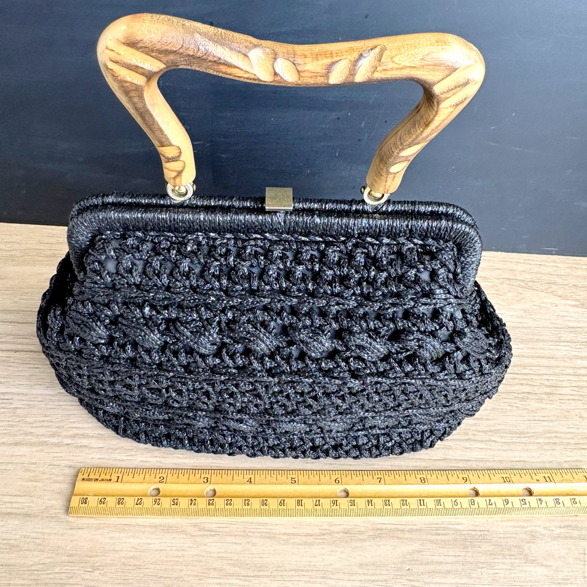 Vintage black raffia woven small framed handbag with wooden handle. Black synthetic lining. Goldtone clasp. One main compartment with one interior slip pocket. Made in Italy. Great little all around bag, compact but large enough for a modern cell phone along with all your other necessities.