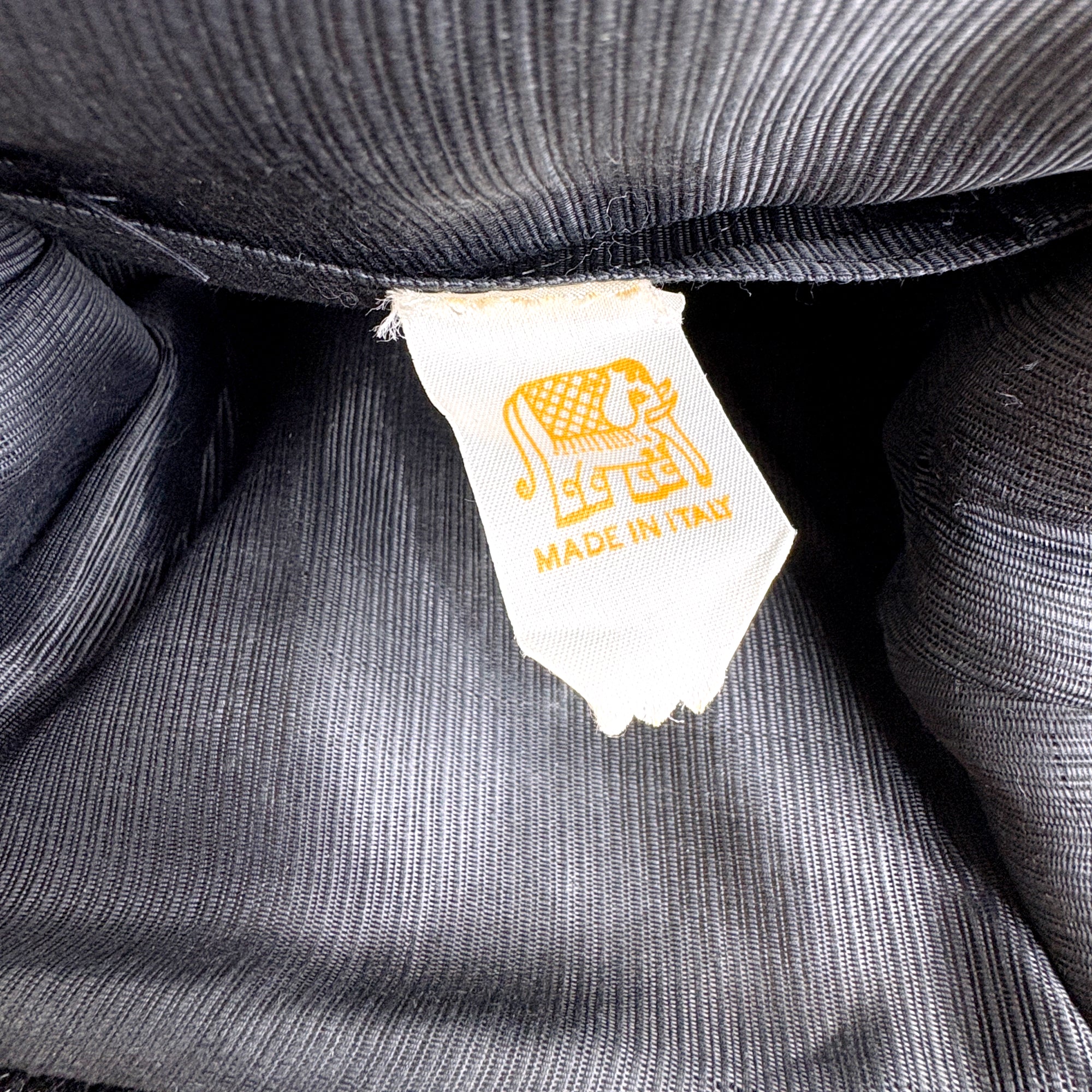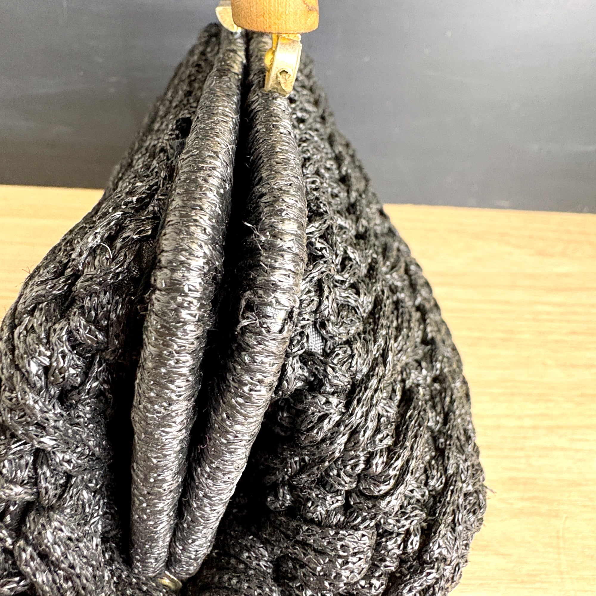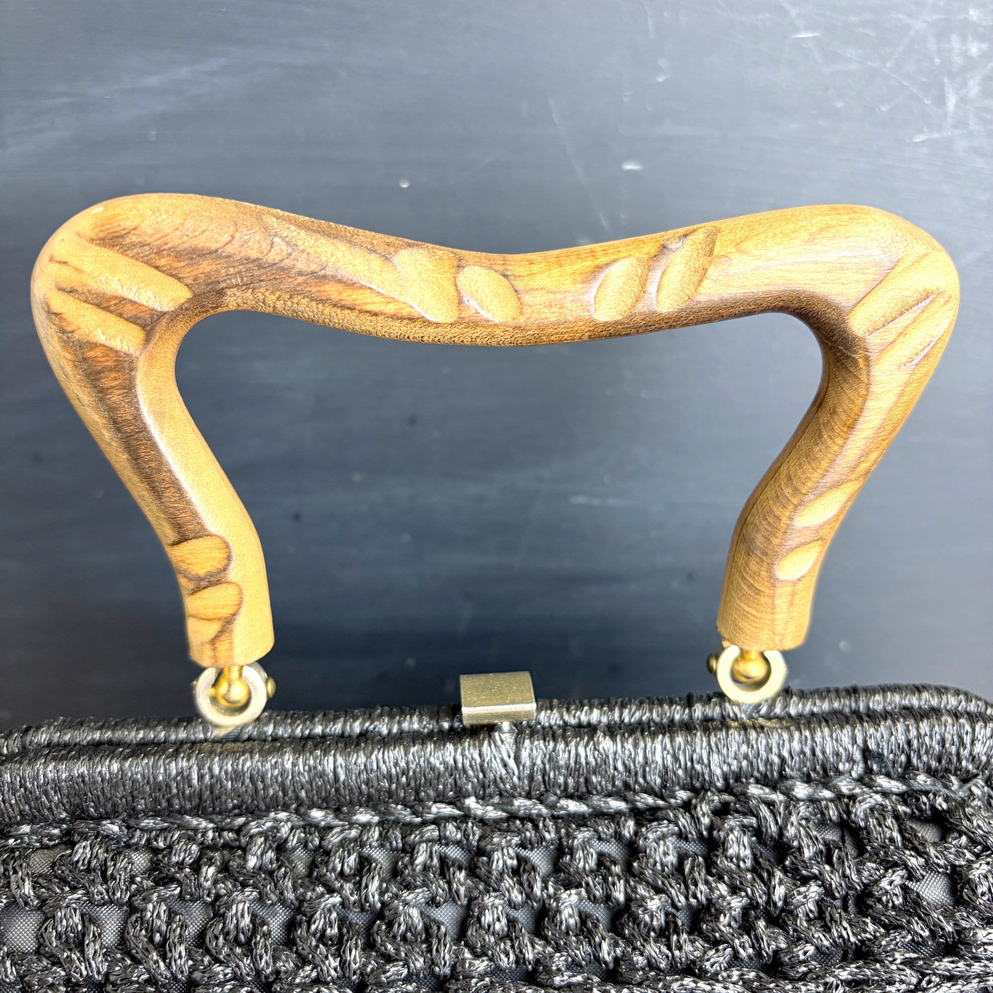 Vintage black raffia woven small framed handbag with wooden handle. Black synthetic lining. Goldtone clasp. One main compartment with one interior slip pocket. Made in Italy. Great little all around bag, compact but large enough for a modern cell phone along with all your other necessities.