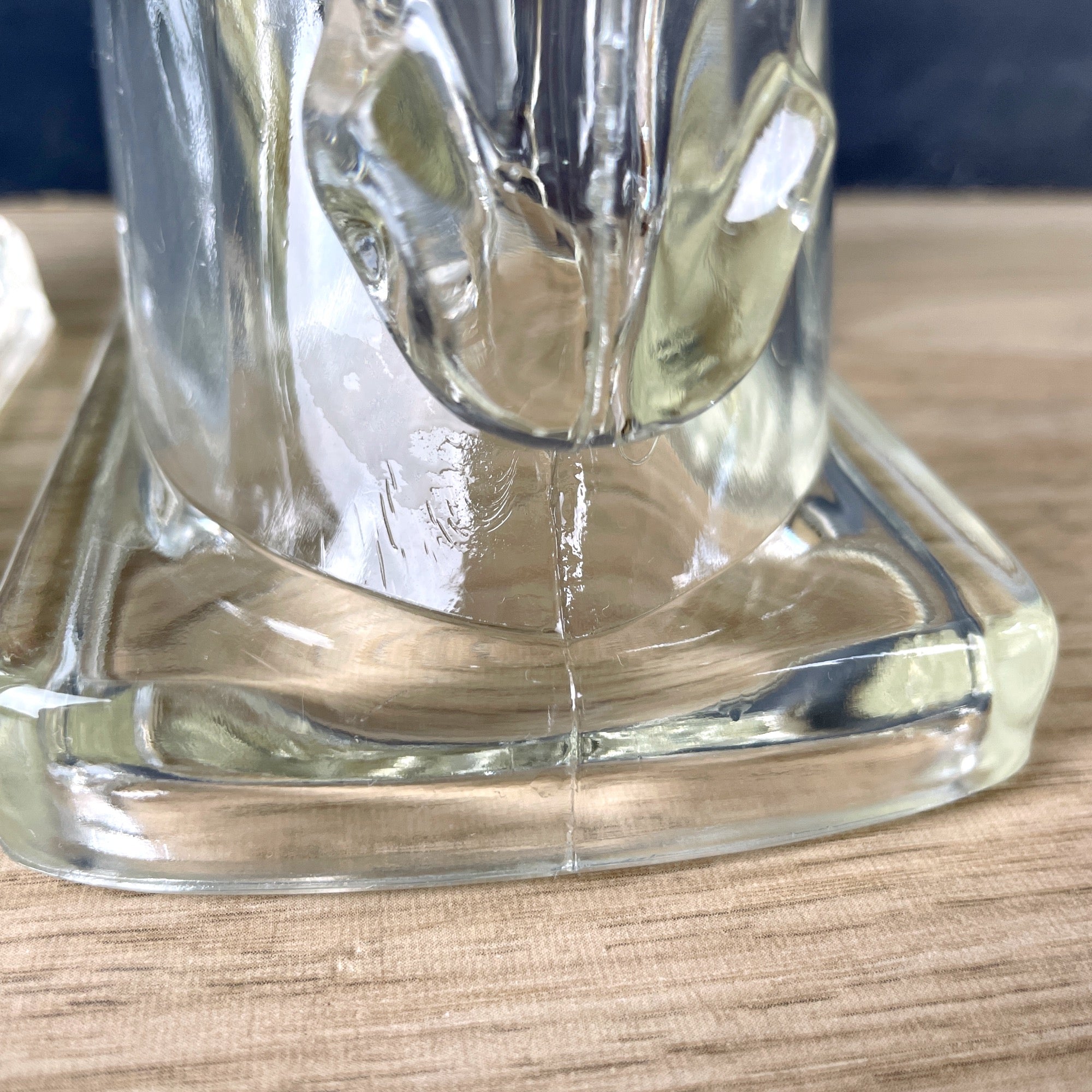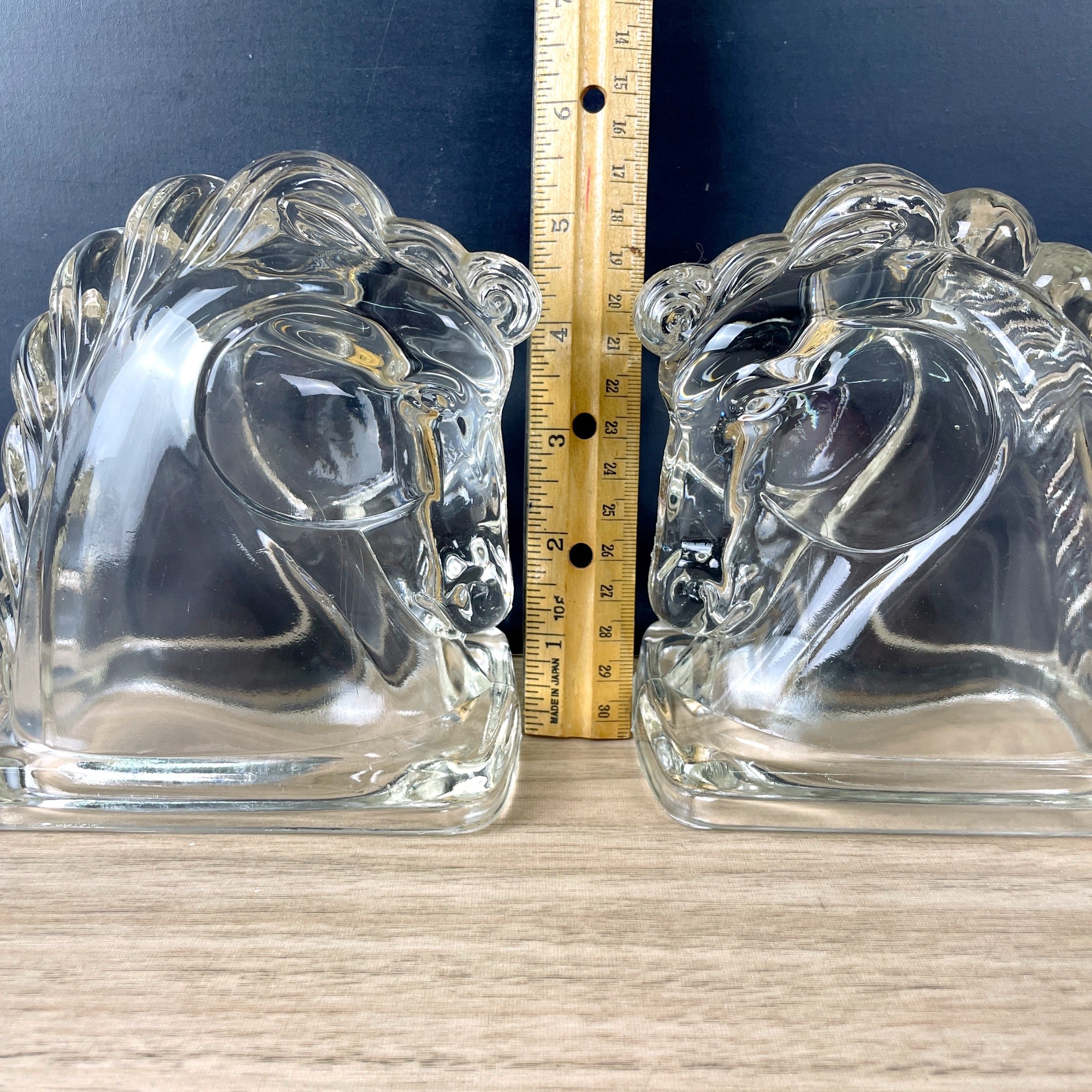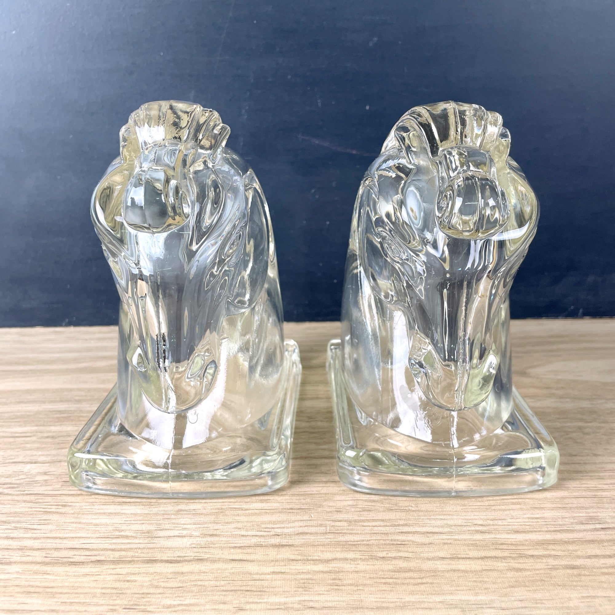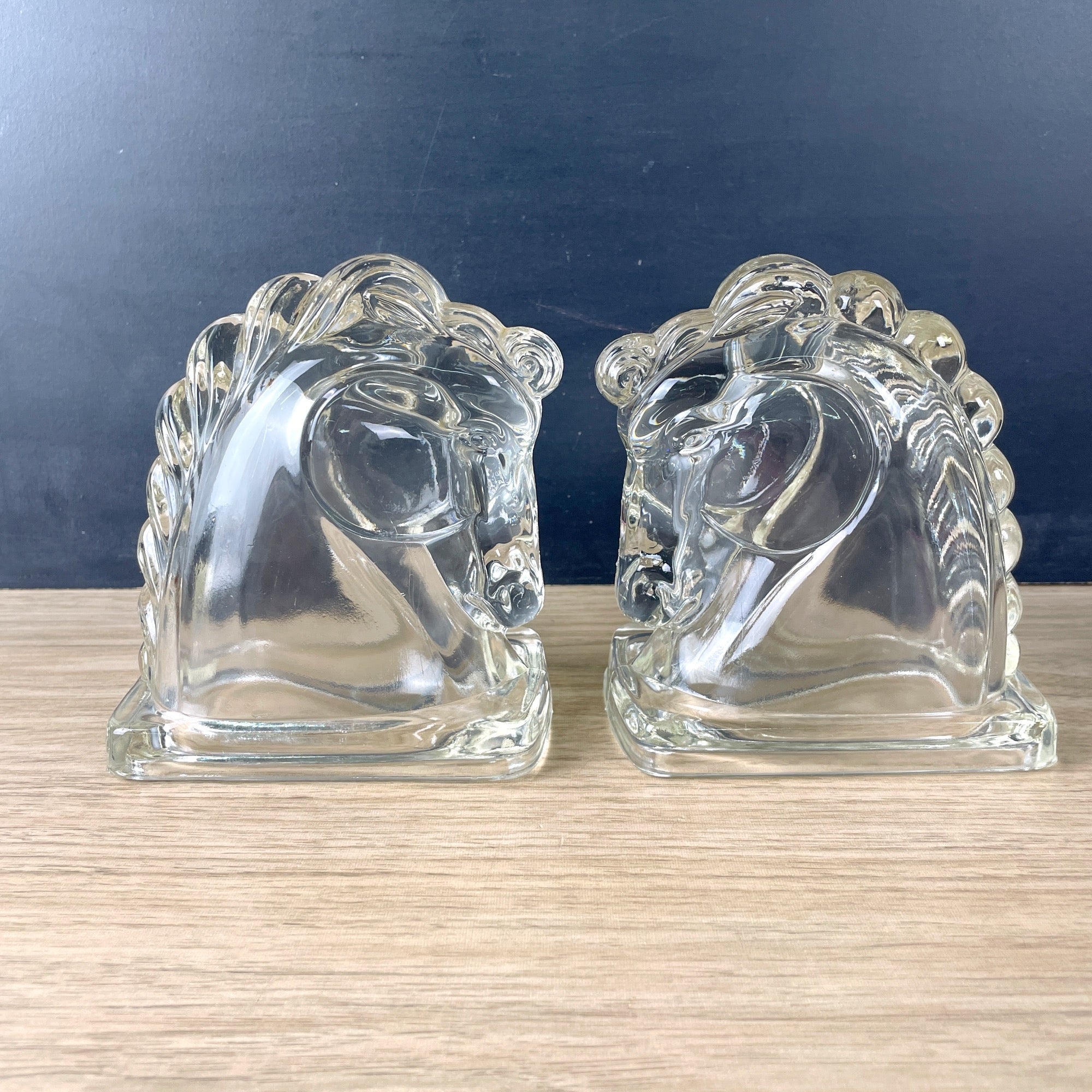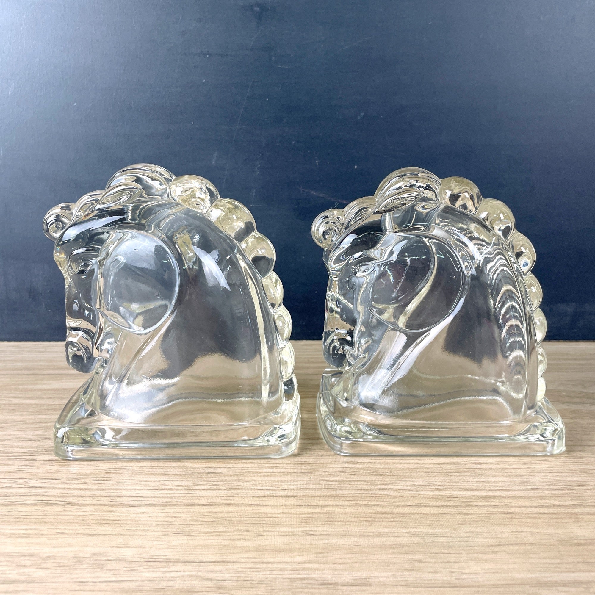 Pair of vintage glass horse head bookends made by Federal Glass Company. Originally candy containers, they were made in the 1940s and 50s. There is one mold line running through the middle of the head. The glass is of good quality with just a few bubbles, but there are a number of chill marks.