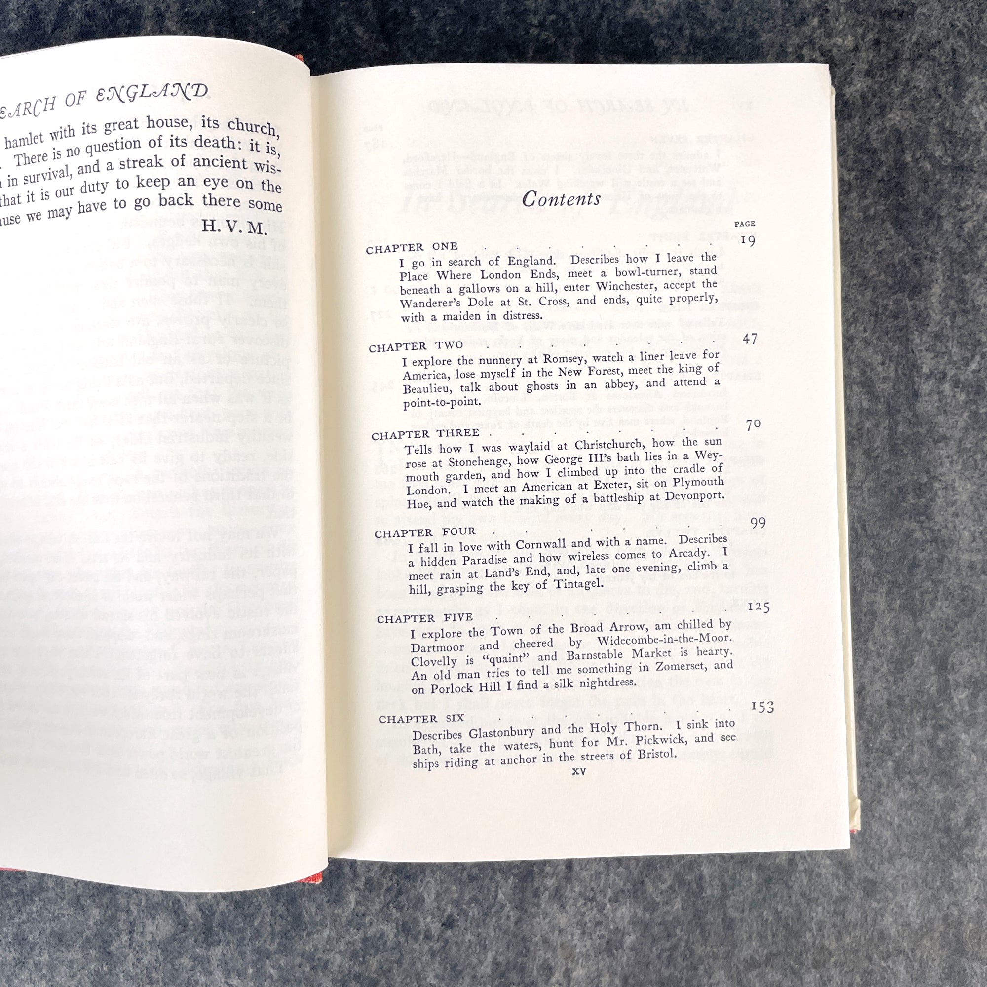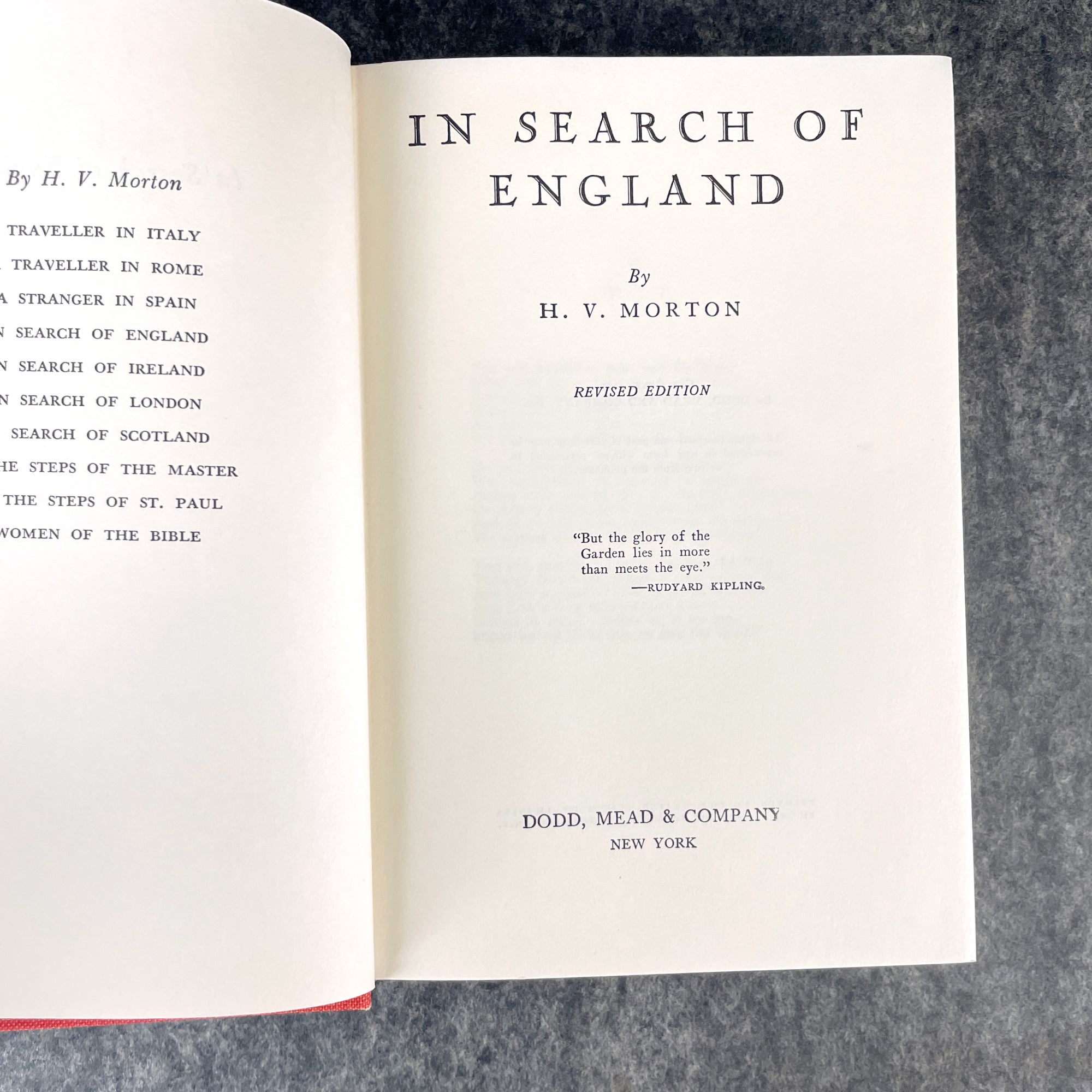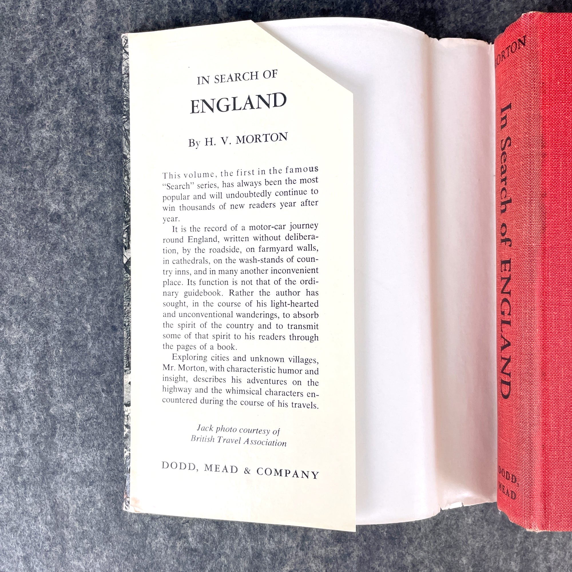 This hardcover "In Search of England" is the first part of a series of "Search" books by H. V. Morton. This is a "motor-car" journey around England in 1935. Very charming narrative. Black lettering on red cloth cover, dust jacket with black and white photos.