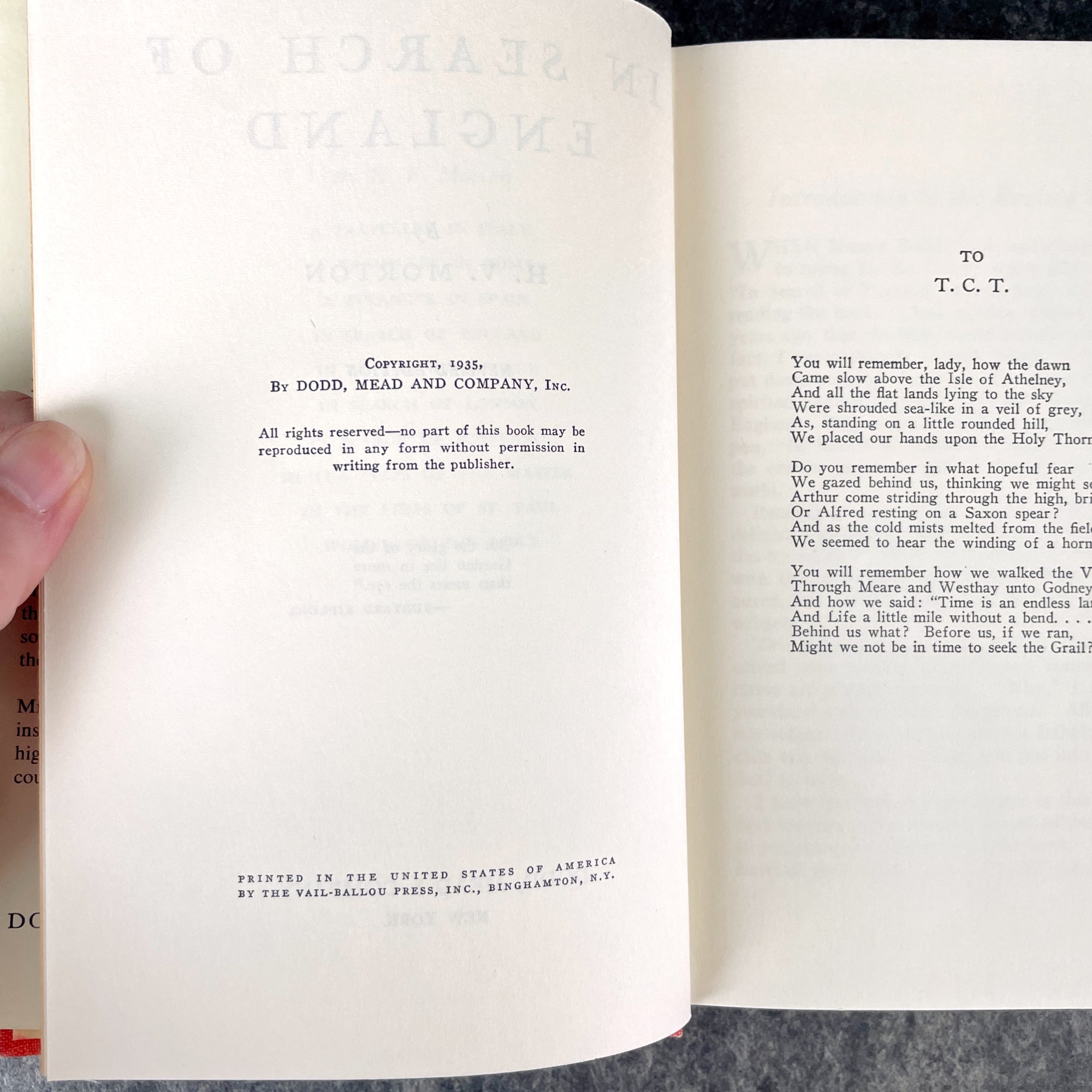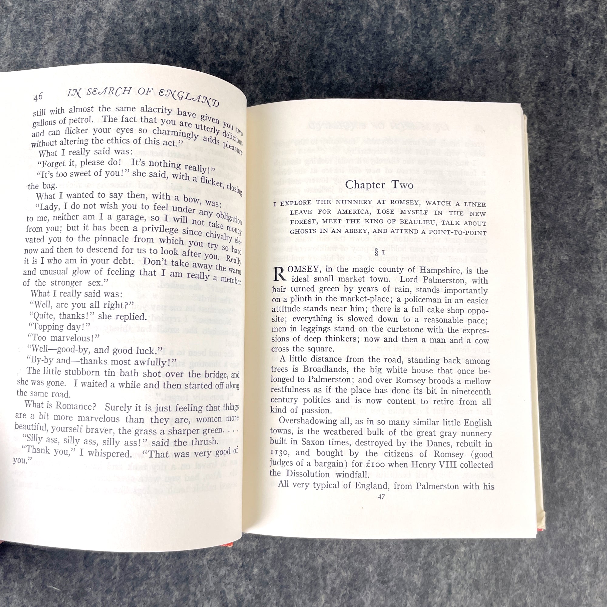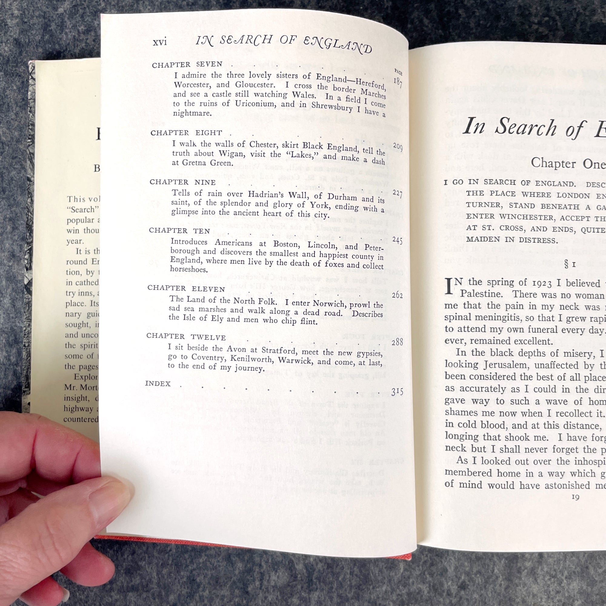 This hardcover "In Search of England" is the first part of a series of "Search" books by H. V. Morton. This is a "motor-car" journey around England in 1935. Very charming narrative. Black lettering on red cloth cover, dust jacket with black and white photos.