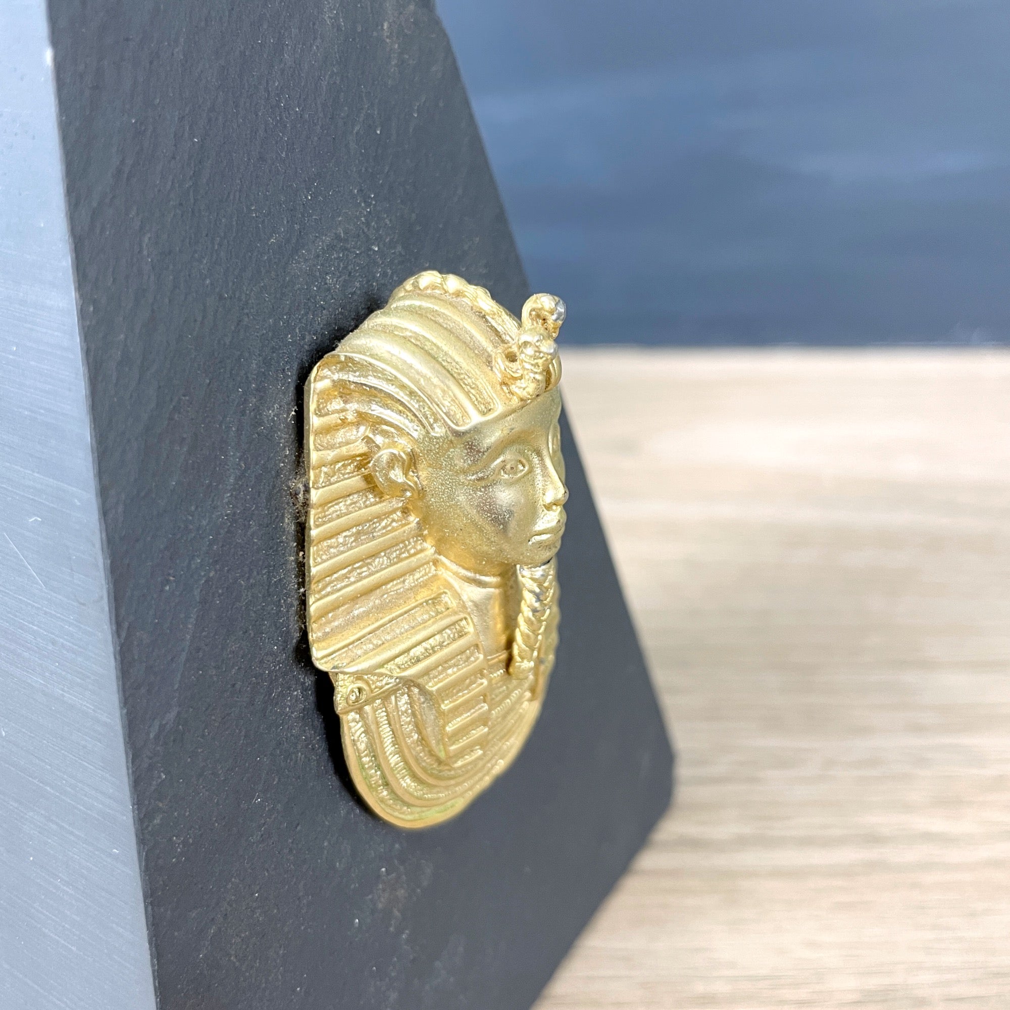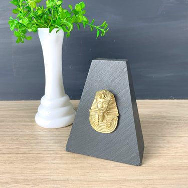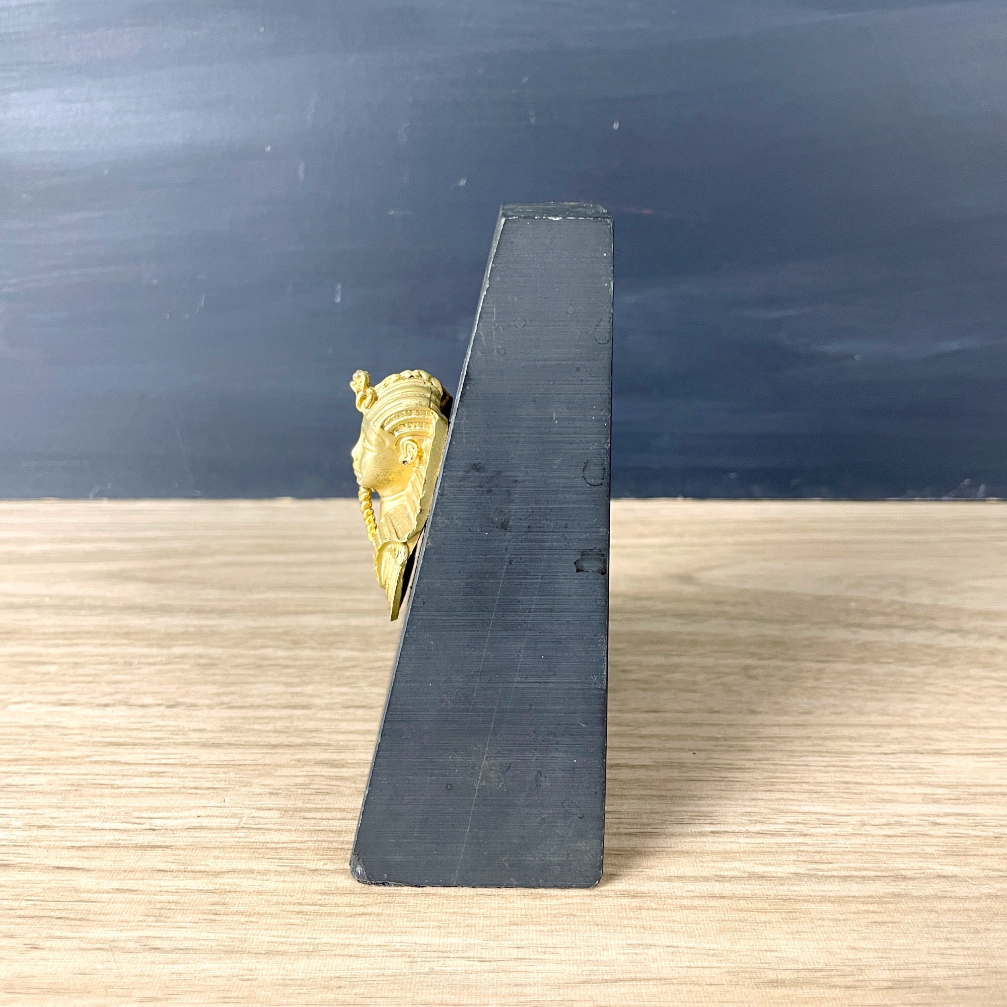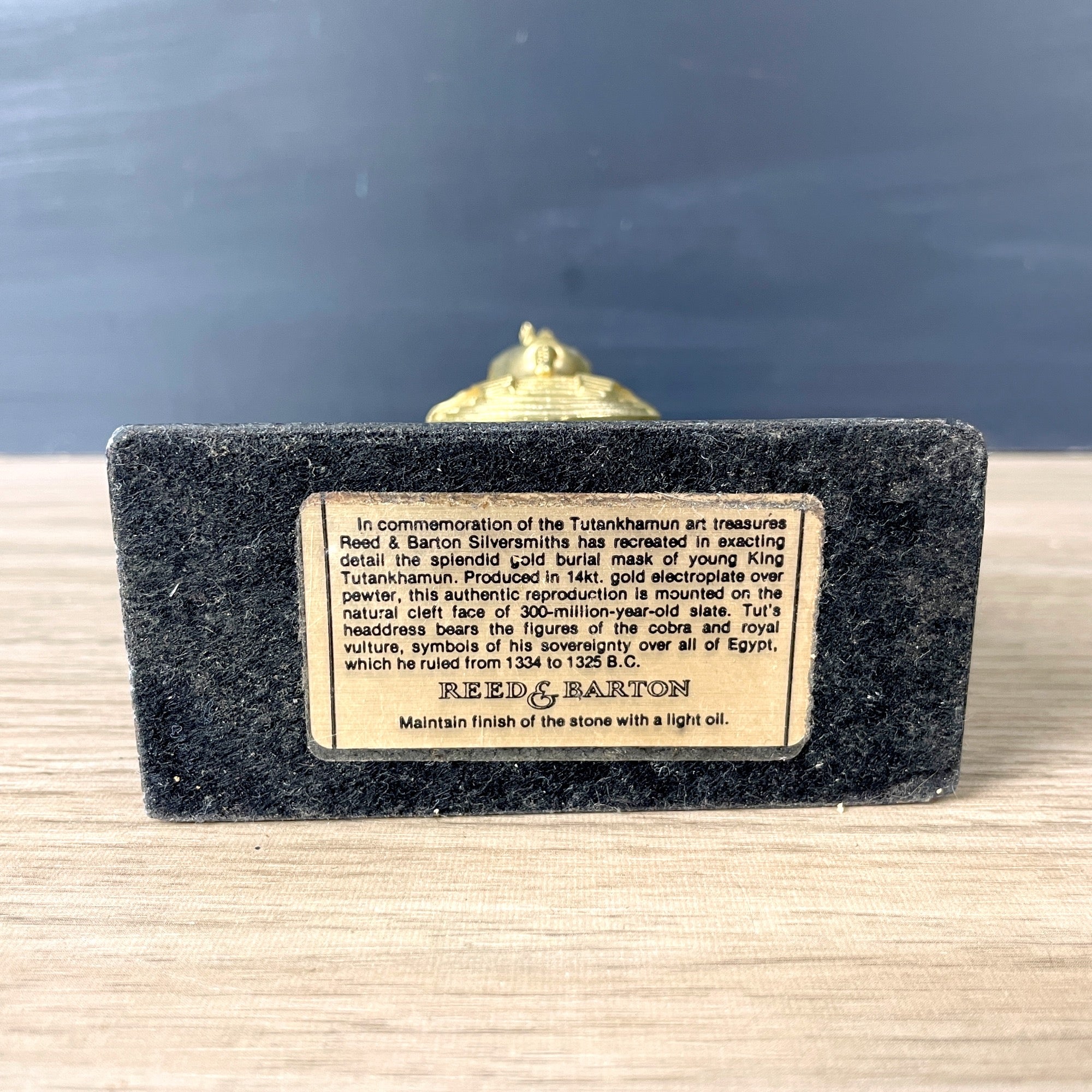 Vintage 1970s Reed & Barton Tutankhamun commemorative standing plaque with mounted mask replica, made in commemoration of the "Treasures of Tutankhamun" exhibition visiting the US. The gold burial mask of King Tut is reproduced in 14K gold electroplate over silver and is mounted on the natural cleft face of 300-million-year-old slate. Felt base with the original Reed & Barton sticker.