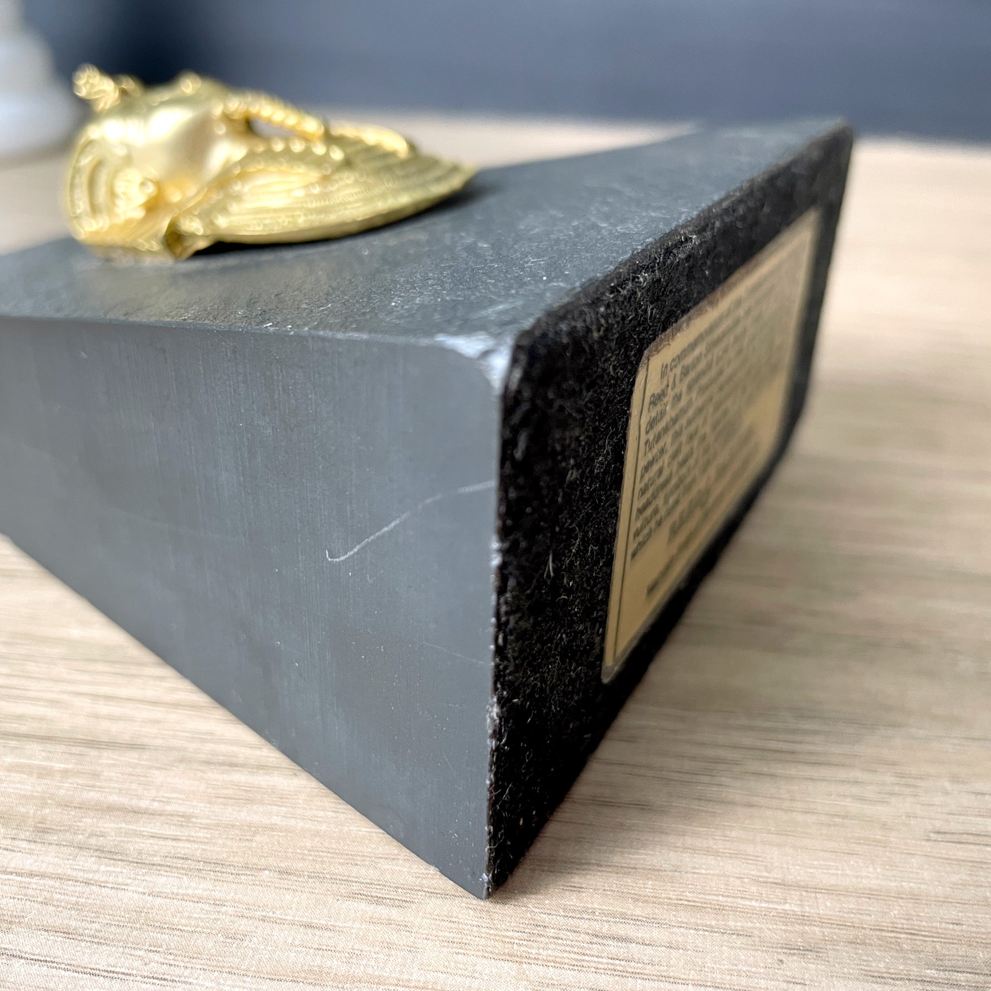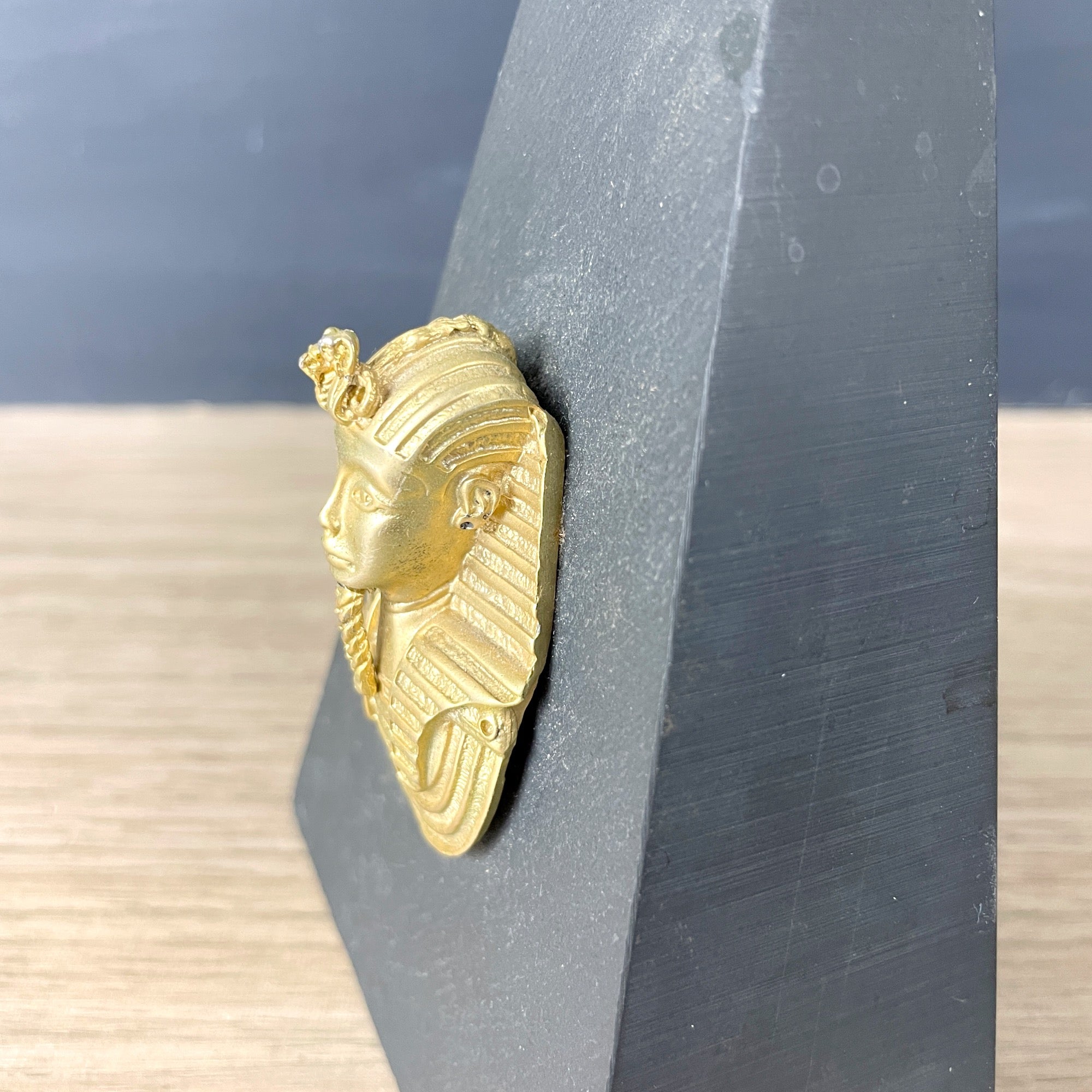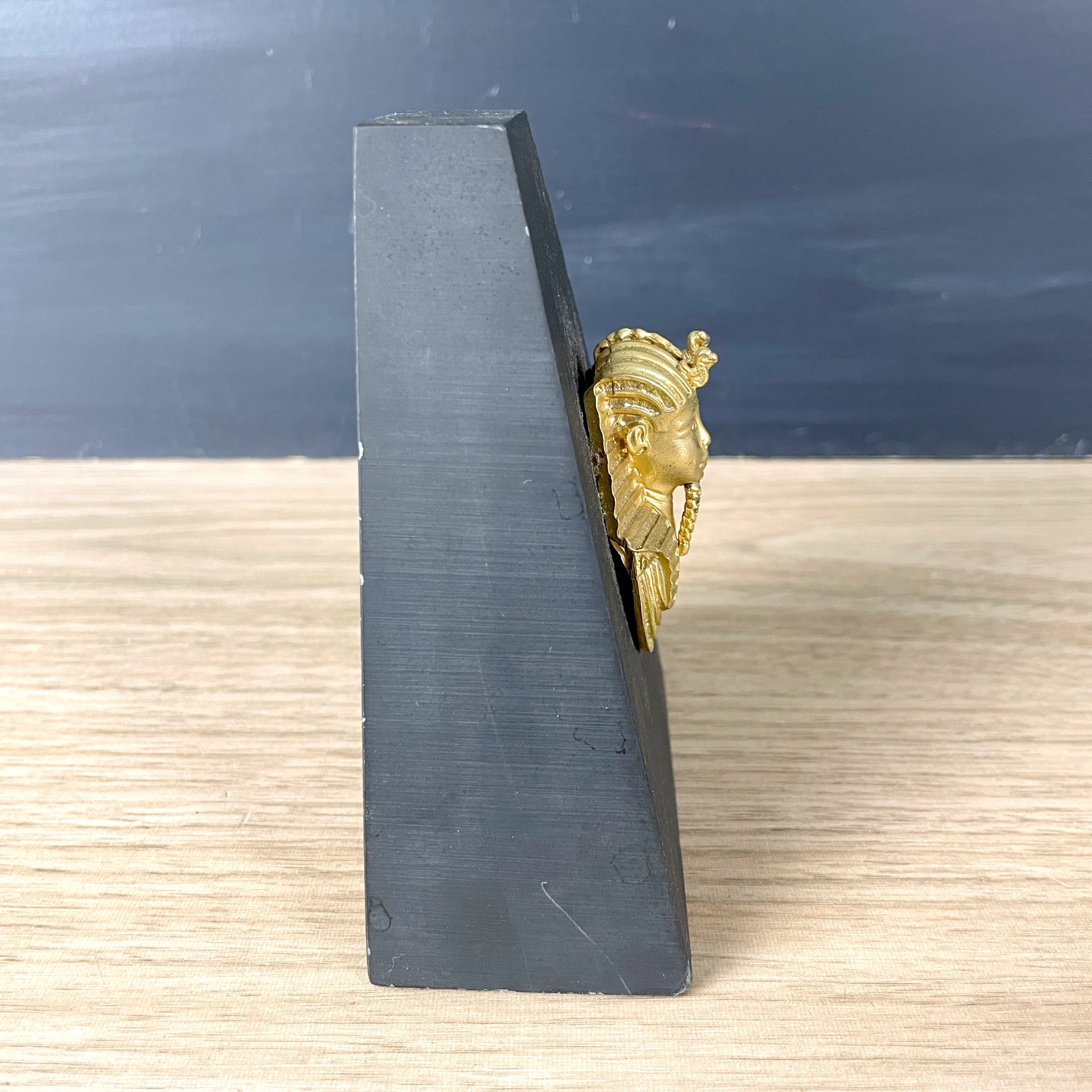 Vintage 1970s Reed & Barton Tutankhamun commemorative standing plaque with mounted mask replica, made in commemoration of the "Treasures of Tutankhamun" exhibition visiting the US. The gold burial mask of King Tut is reproduced in 14K gold electroplate over silver and is mounted on the natural cleft face of 300-million-year-old slate. Felt base with the original Reed & Barton sticker.