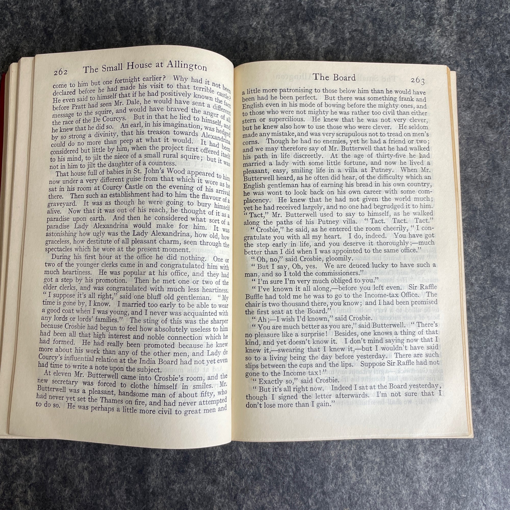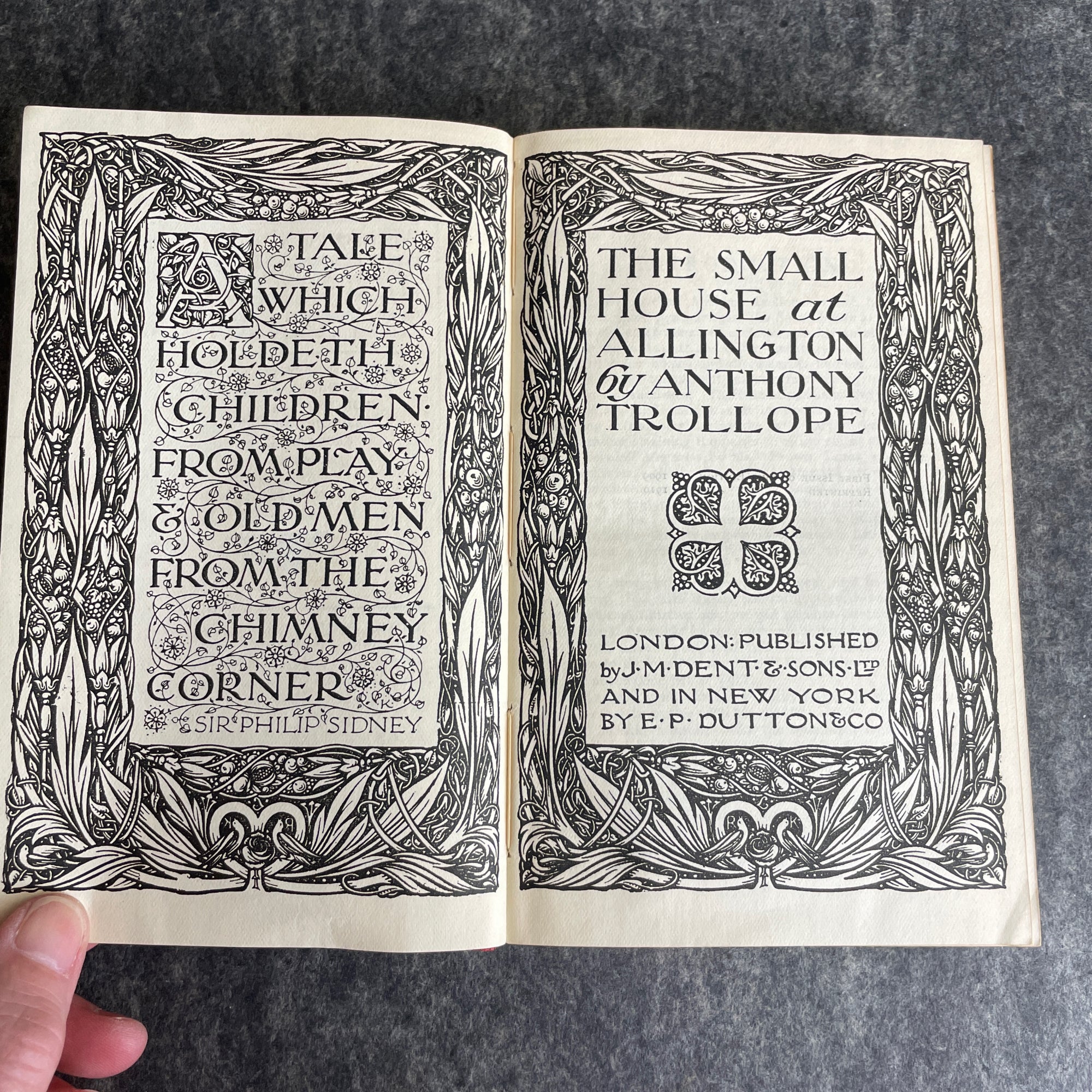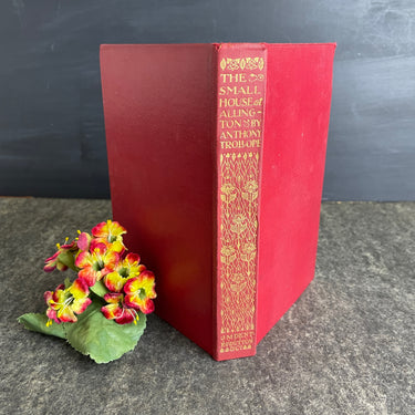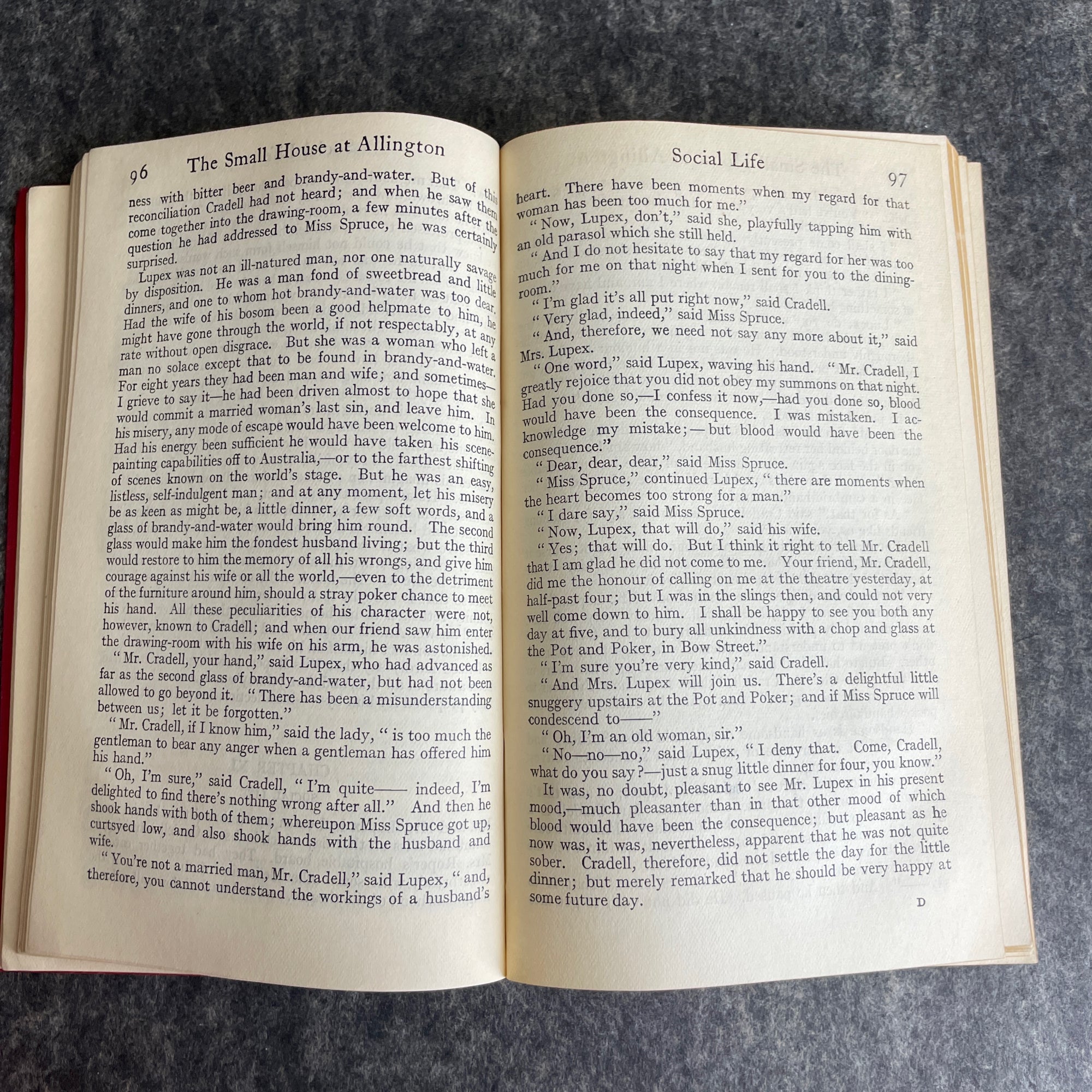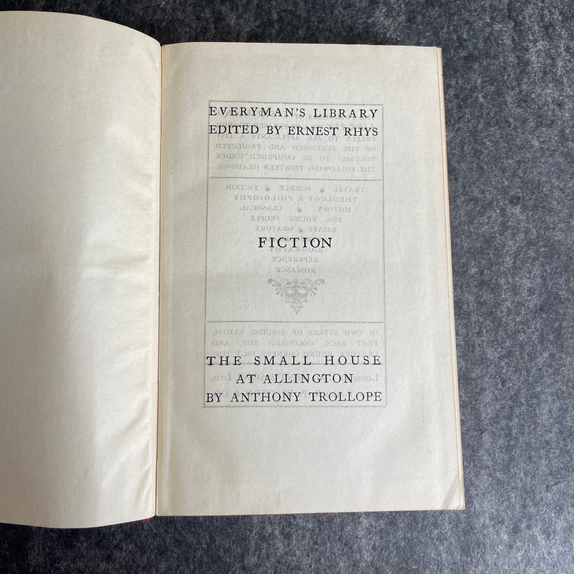 "The Small House at Allington" by Anthony Trollope. Everyman's Library edition, edited by Ernest Rhys. J. M. Dent and Sons, Ltd. publisher. 1910 reprint. Red hardcover with gilt on the spine.