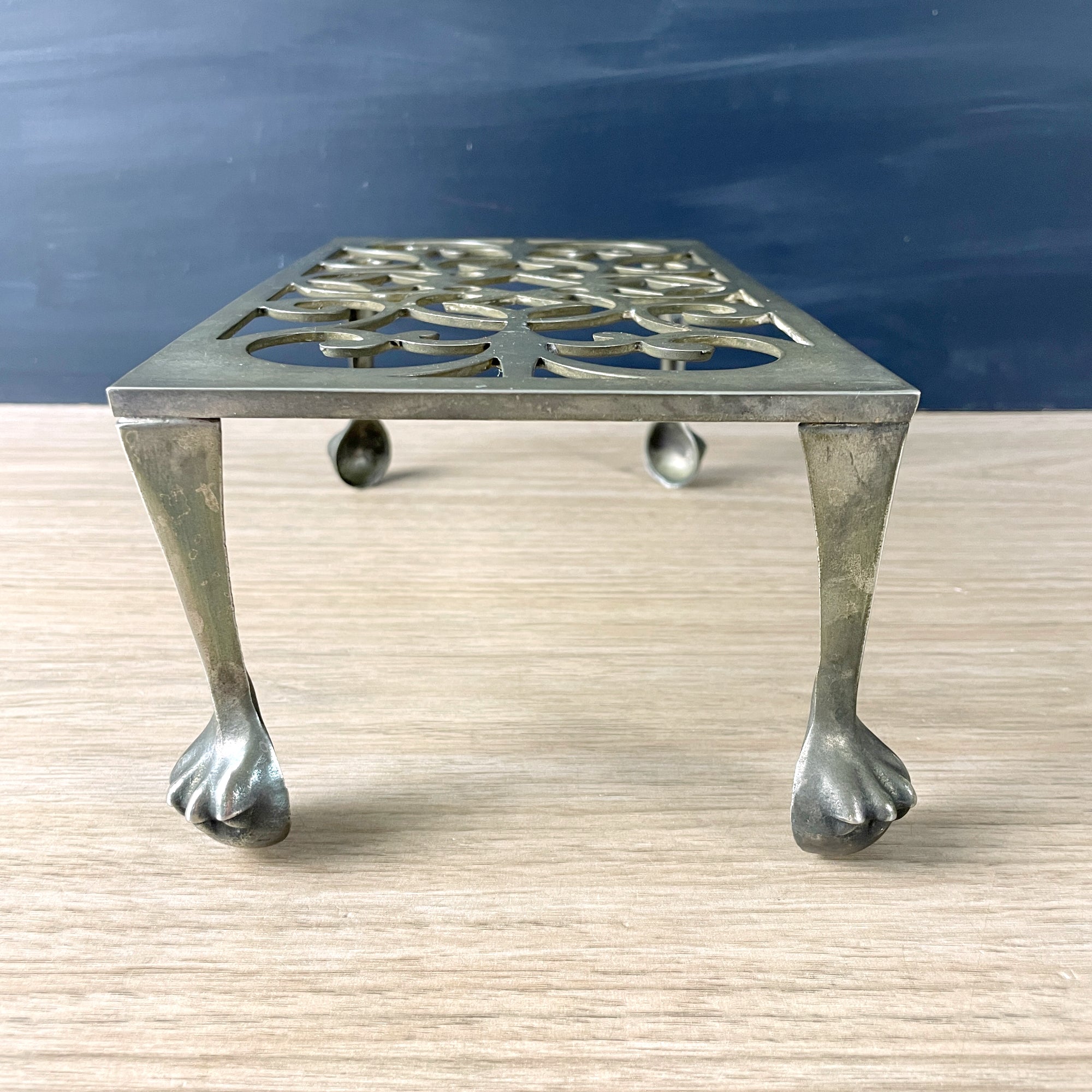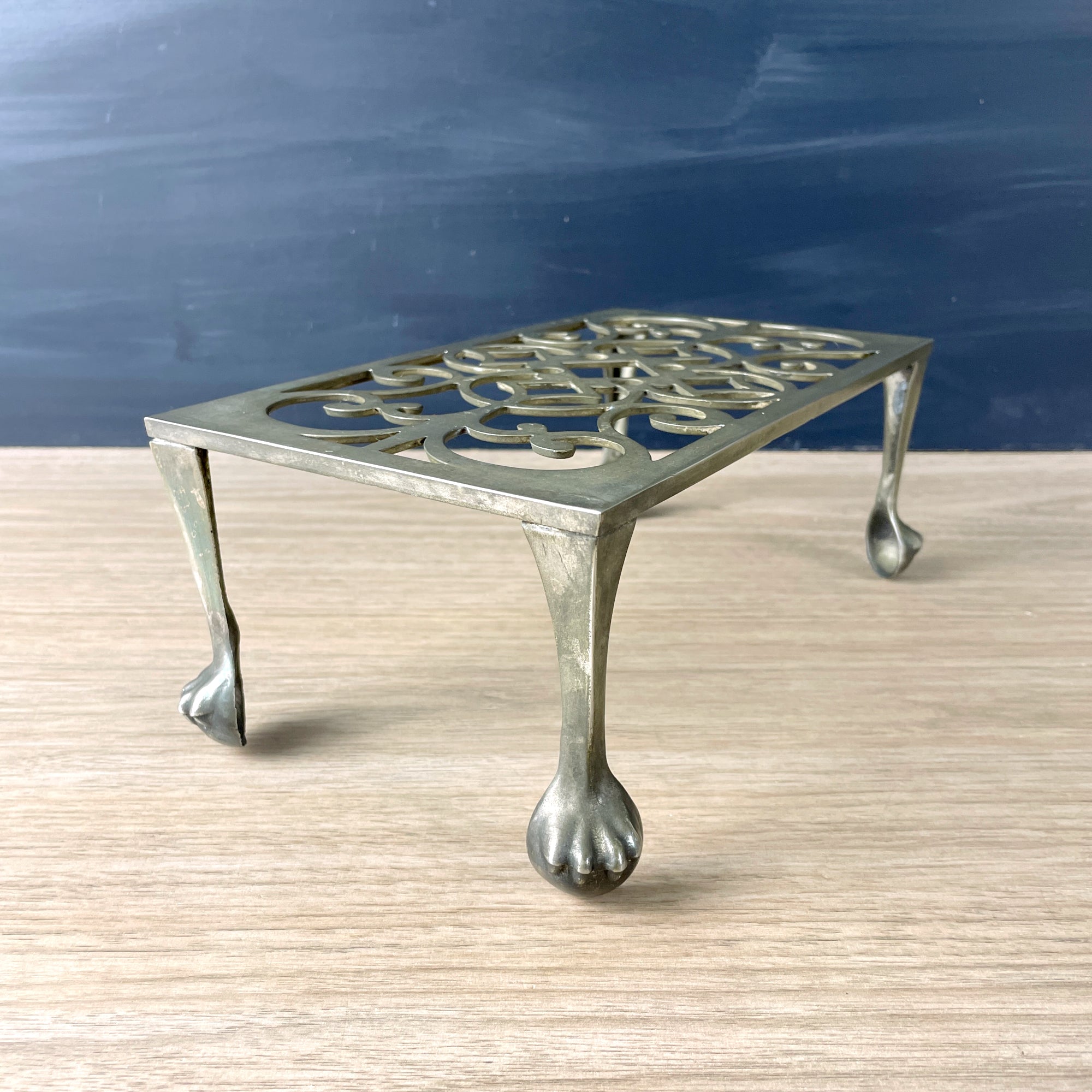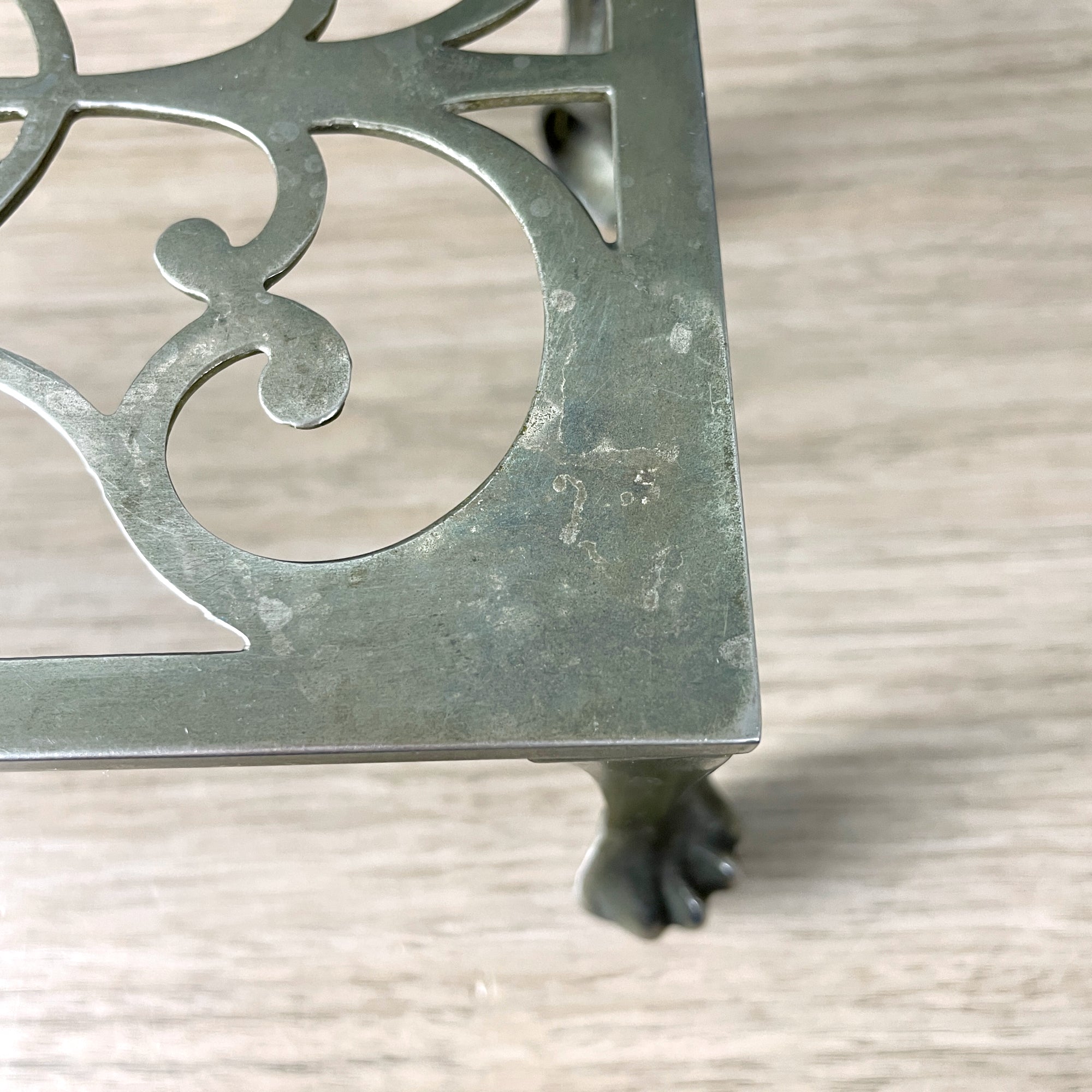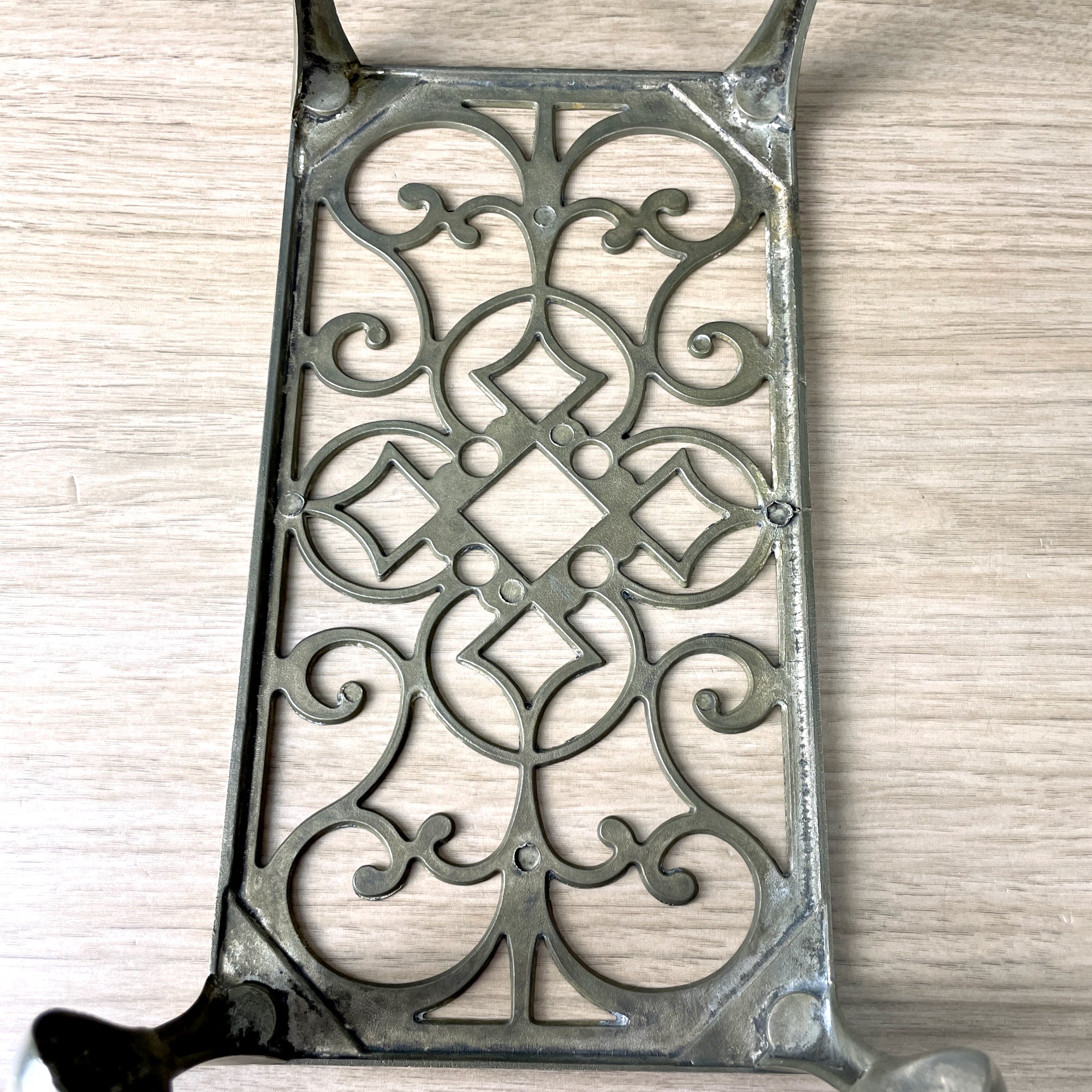 Victorian era footman trivet, used for keeping the kettle and pot warm in the fireplace. Ball claw feet. Reticulated top. Legs are soldered on. Metal has us scratching our heads, it's got a silver color but it's not magnetic. German silver? No makers marks.