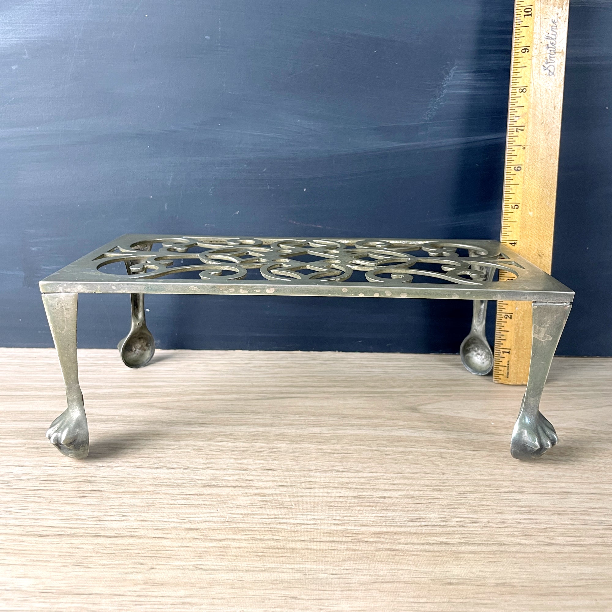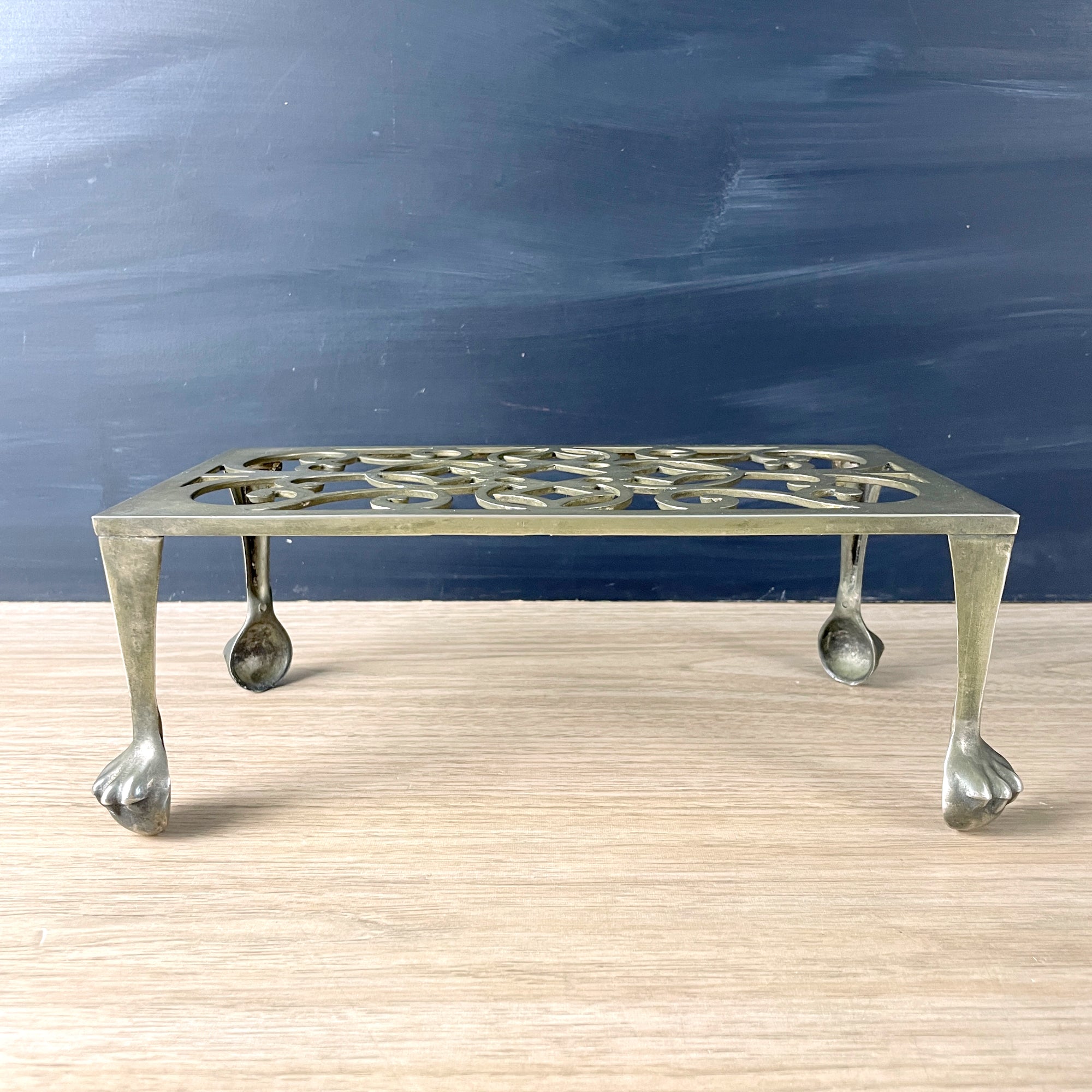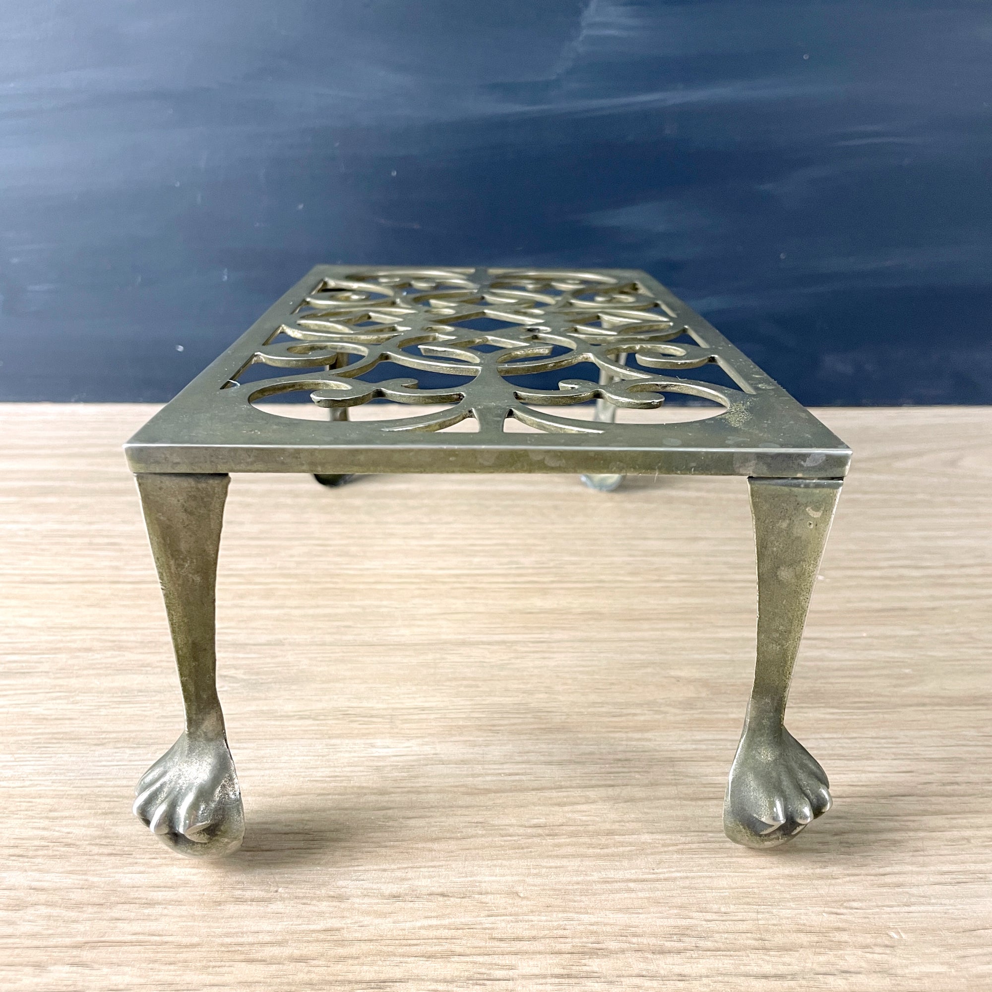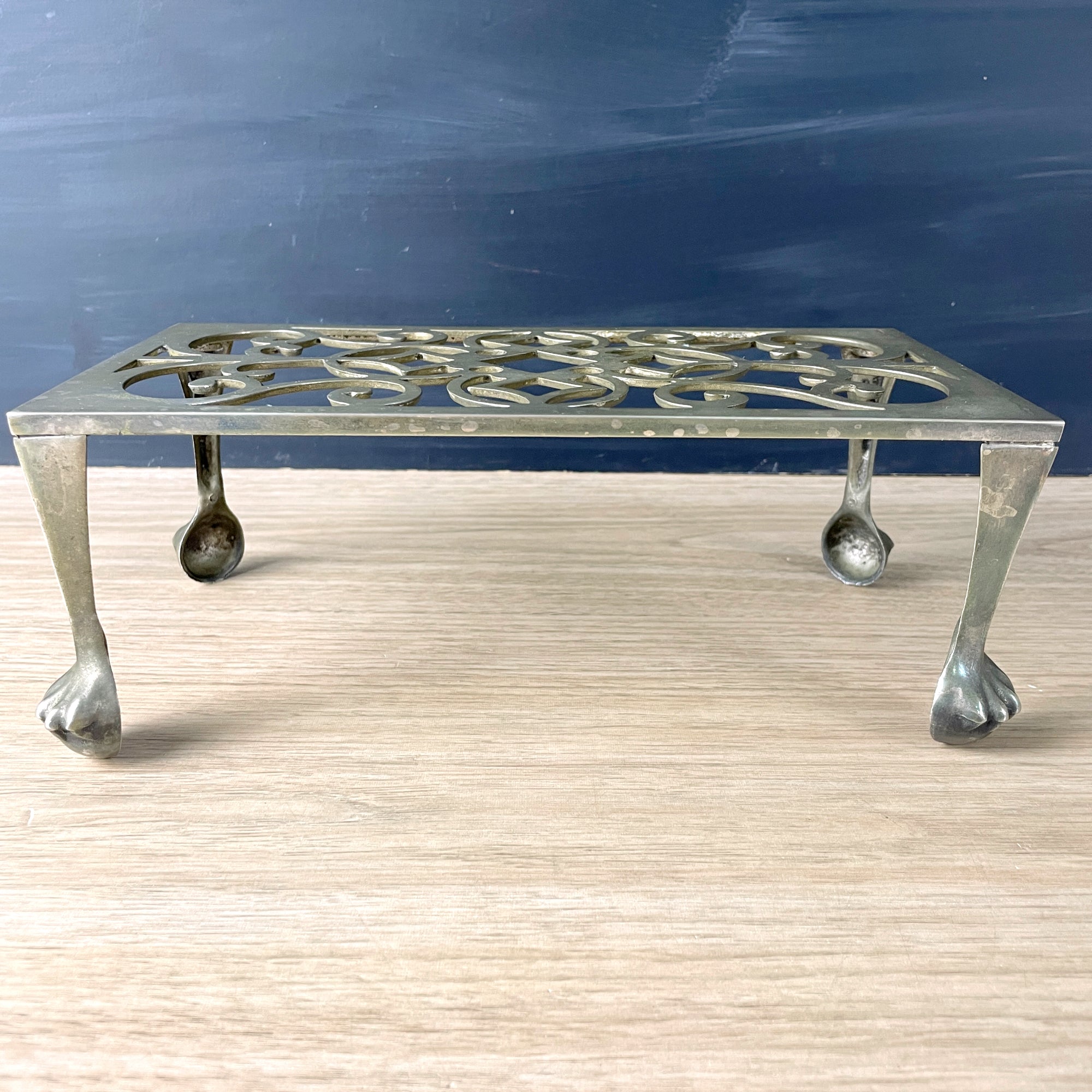 Victorian era footman trivet, used for keeping the kettle and pot warm in the fireplace. Ball claw feet. Reticulated top. Legs are soldered on. Metal has us scratching our heads, it's got a silver color but it's not magnetic. German silver? No makers marks.
