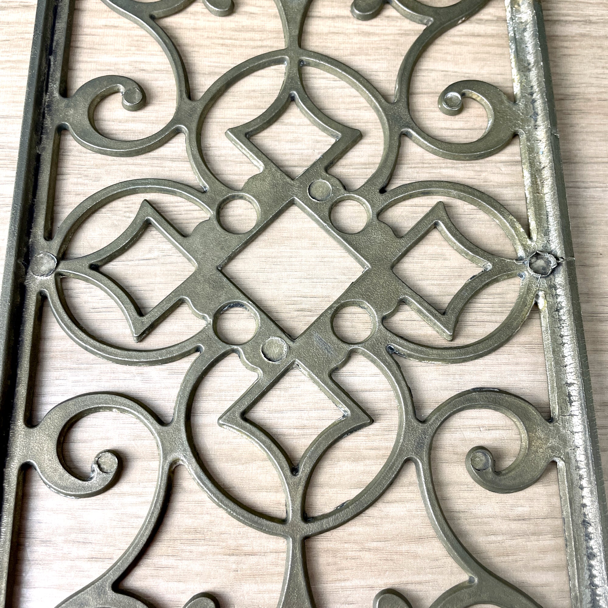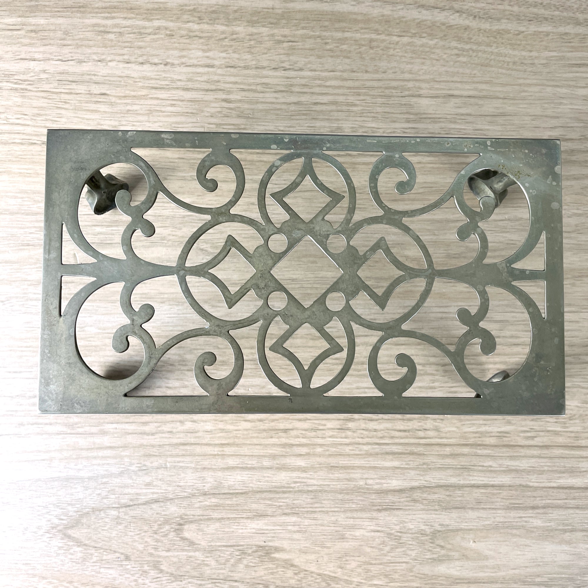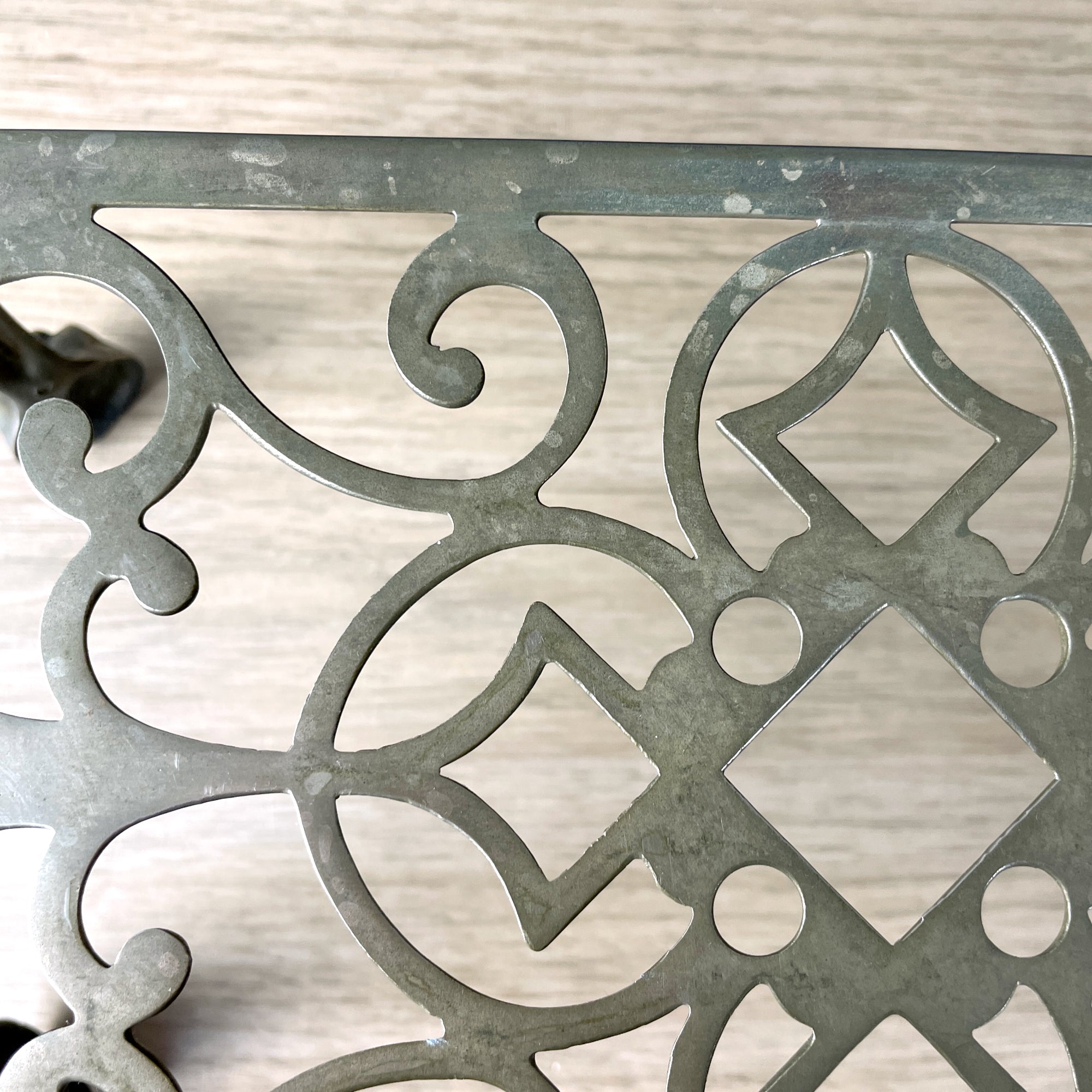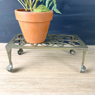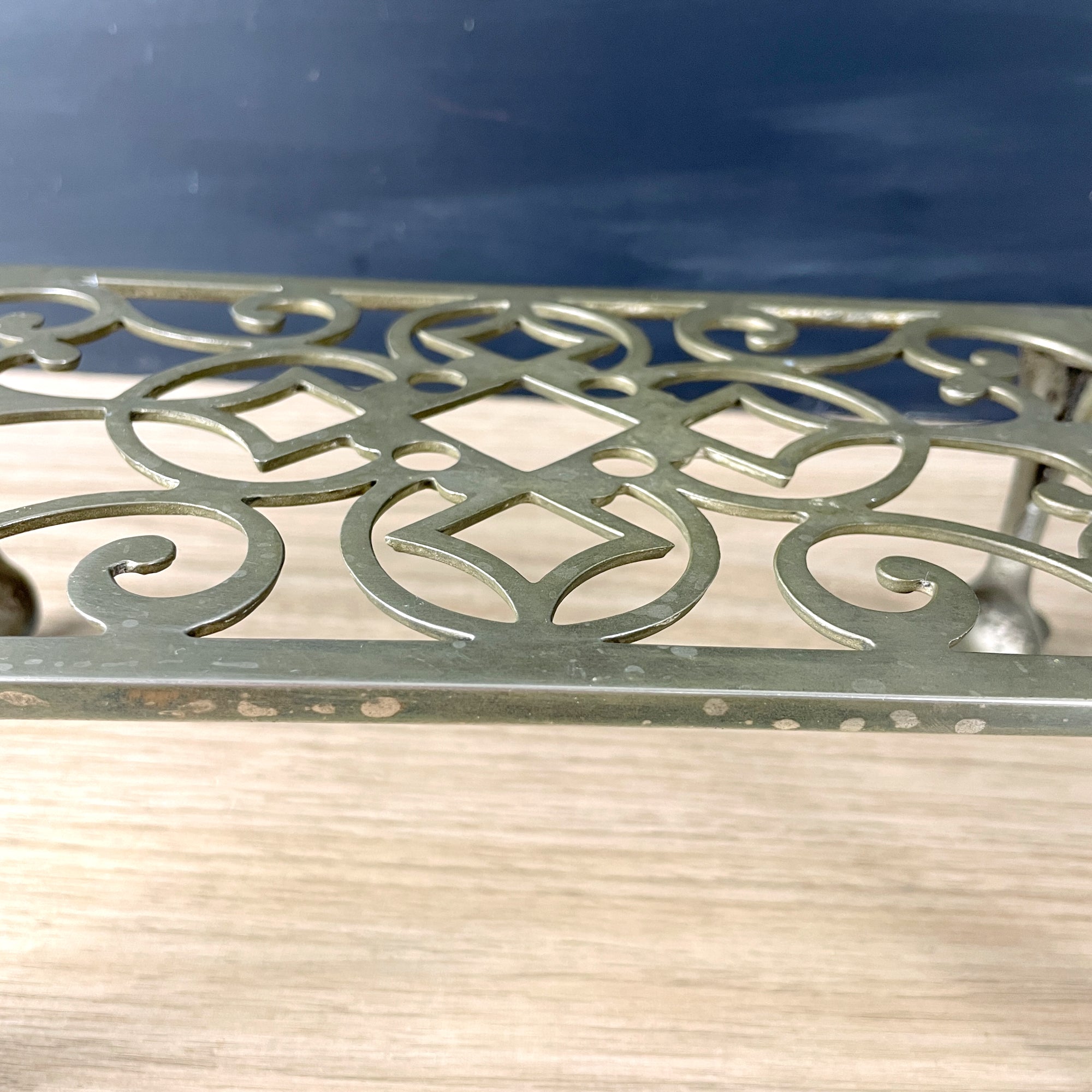 Victorian era footman trivet, used for keeping the kettle and pot warm in the fireplace. Ball claw feet. Reticulated top. Legs are soldered on. Metal has us scratching our heads, it's got a silver color but it's not magnetic. German silver? No makers marks.
